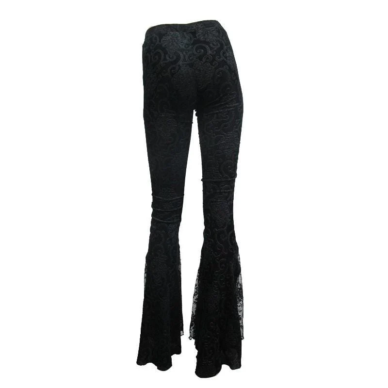 Descrizione: Scatenare la sexy Goth non è mai stato così facile come con questi pantaloni incantevoli. L’uso intelligente del tessuto jacquard autoprodotto con delicato pizzo gossamer porta questo pantalone nel regno dello stupore. I pantaloni che abbracciano la pelle hanno passacavi e allacciatura incrociata a nastro che corre dalla vita alle ginocchia dove il nastro si lega in un delicato arco appena sopra la balza di pizzo che forma la parte anteriore dei pantaloni dal ginocchio fino alla caviglia.