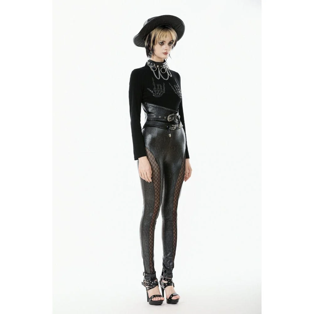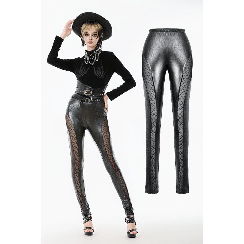 Questi pantaloni di ispirazione punk sono realizzati in pelle elasticizzata con motivo a pelle di serpente, offrendo un look audace ma elegante. Le sezioni cut-out sono riempite con rete a rombi, aggiungendo un sottile effetto trasparente per un tocco di mistero. L’elastico in vita garantisce una vestibilità comoda per diverse taglie senza risultare restrittivo. Rispetto ai modelli punk heavy metal, questo modello è più versatile e adatto all’uso quotidiano o alle occasioni informali, combinando comfort e un atteggiamento audace.