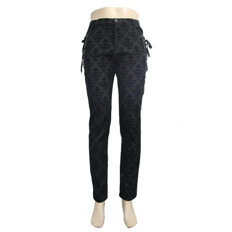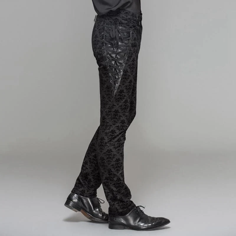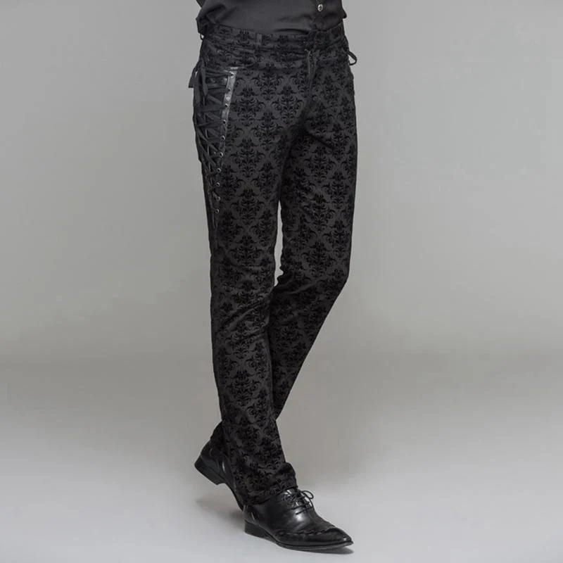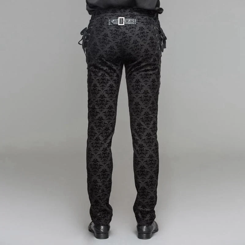 Descrizione: Il broccato morbido autoprodotto è stato utilizzato per creare questi pantaloni eleganti. I pantaloni attillati hanno un inserto in pelle sul lato con passacavo incrociato e dettagli in pizzo che aggiungono un tocco di stile vintage a questi pantaloni. La parte posteriore ha un dettaglio cinturino con fibbia corta sul retro della schiena. Questi pantaloni eleganti ma comodi sono un must per ogni uomo punk.
