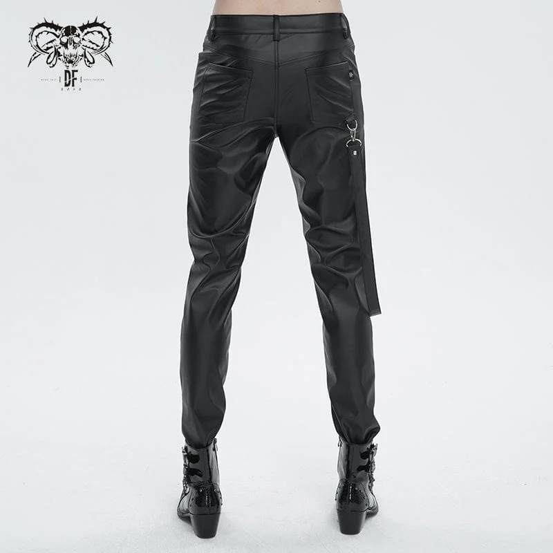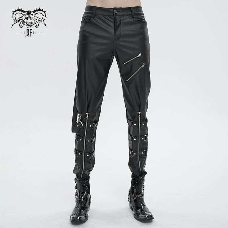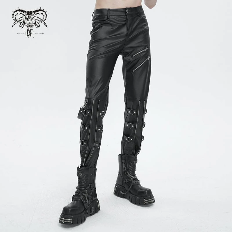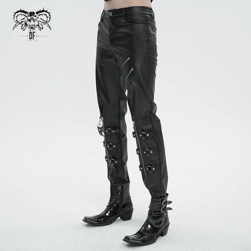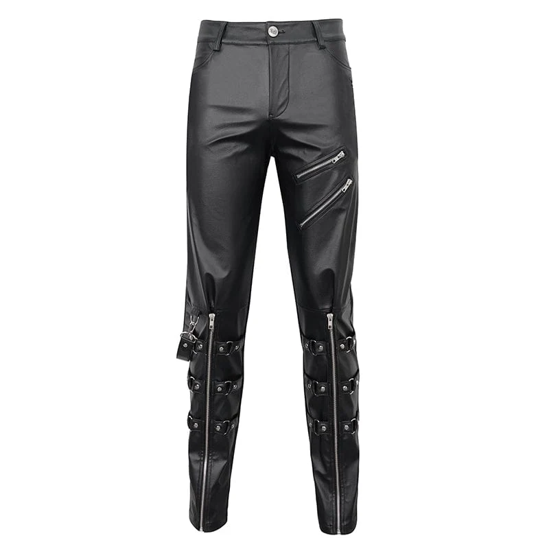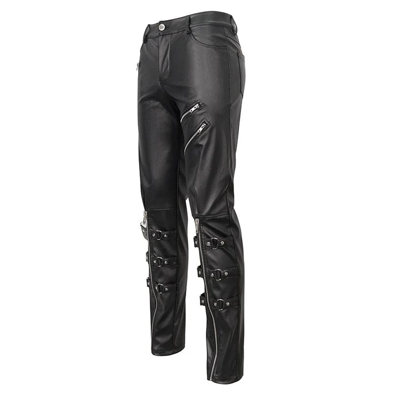 Questo paio di pantaloni punk è realizzato in ecopelle. Due cerniere sulla coscia. Due cerniere e cinghie a strati sulle gambe basse. Un cinturino staccabile sulla destra. Silhouette attillata.