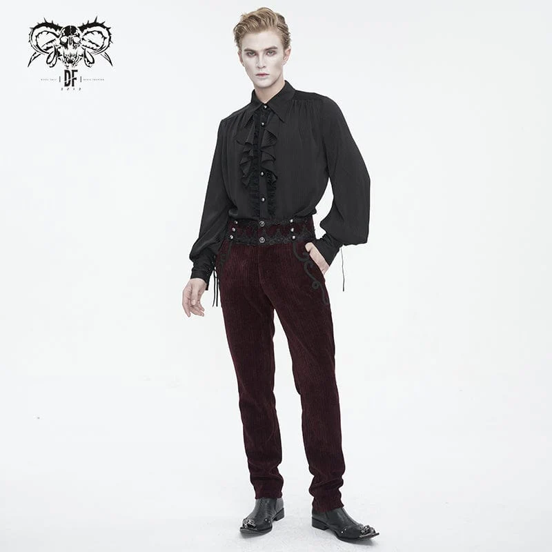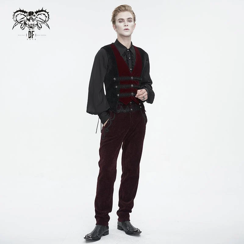 Questo paio di pantaloni gotici è realizzato in tessuto di velluto a coste. Design a vita alta. La vita è patchwork con pizzo. Il pizzo intrecciato è decorato vicino alle tasche. Silhouette aderente e tessuto privo di elastico. Disponibile in due colori.