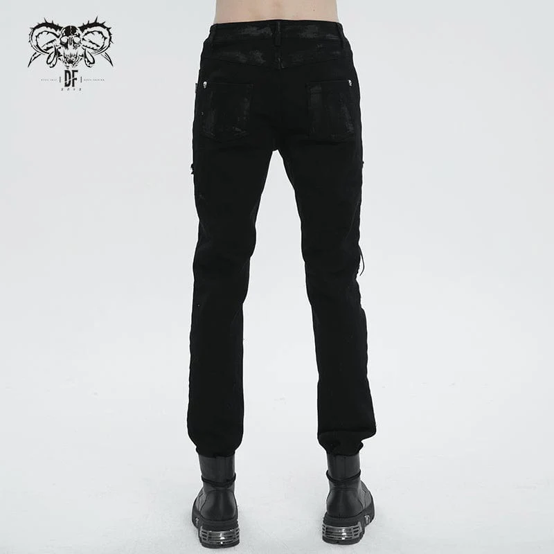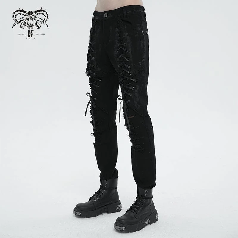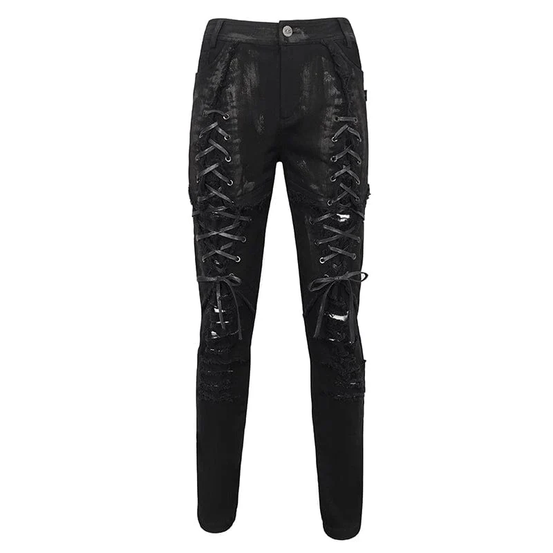 Questo paio di pantaloni punk è realizzato in tessuto invecchiato. Allacciata sulla coscia e strappata sulle ginocchia. Silhouette attillata.