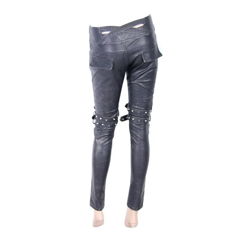 Descrizione: Il punto culminante di questi pantaloni skinny punk in stile gotico sono tre tasche con cerniera oblique sulle cosce. Le cerniere in metallo aggiungono un tocco molto interessante ai pantaloni. Le ginocchia sono dotate di due cinturini con fibbia e una cerniera in metallo con cerniera decorativa.