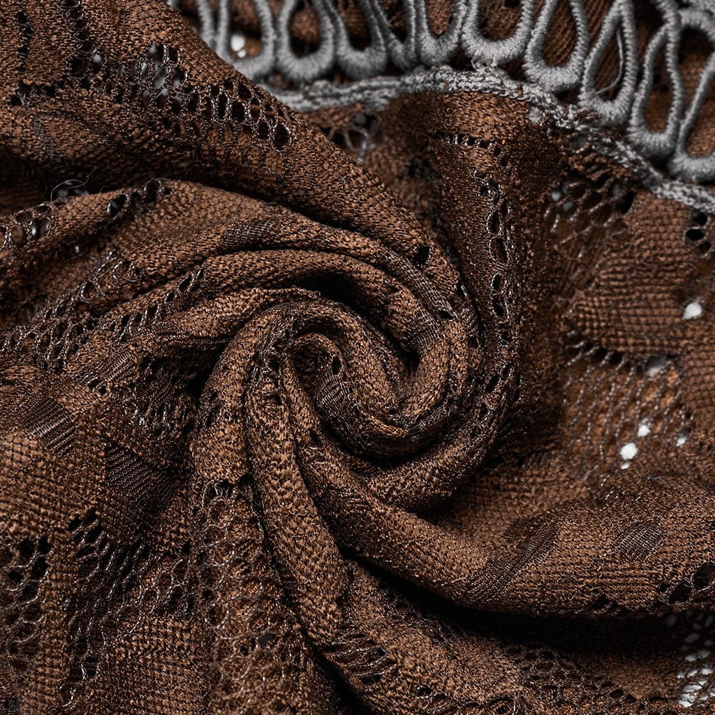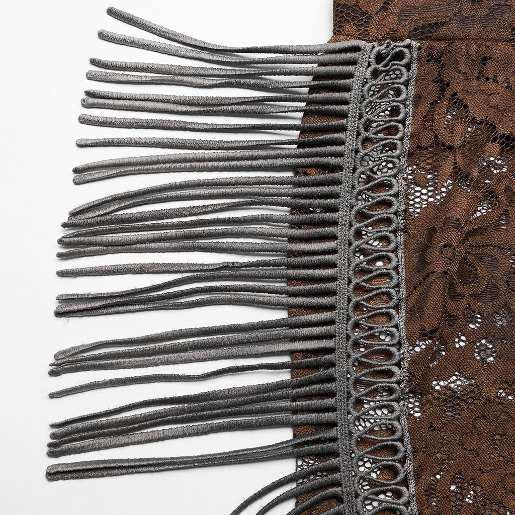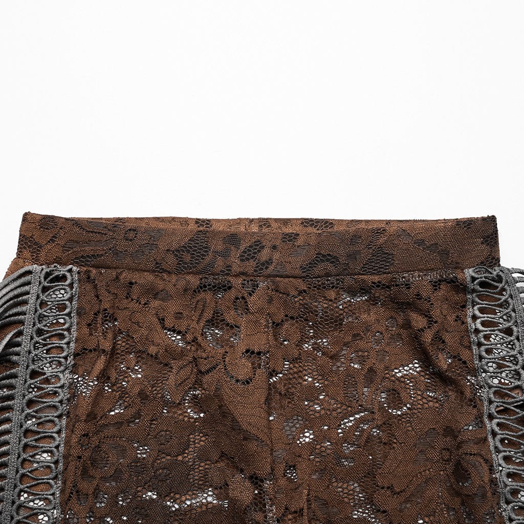 Questi eleganti pantaloni in pizzo caffè sono realizzati in rete elastica e cotone di alta qualità. Questi eleganti pantaloni a zampa d’elefante presentano un motivo floreale in pizzo, con volant sull’orlo e nappe su entrambi i lati.