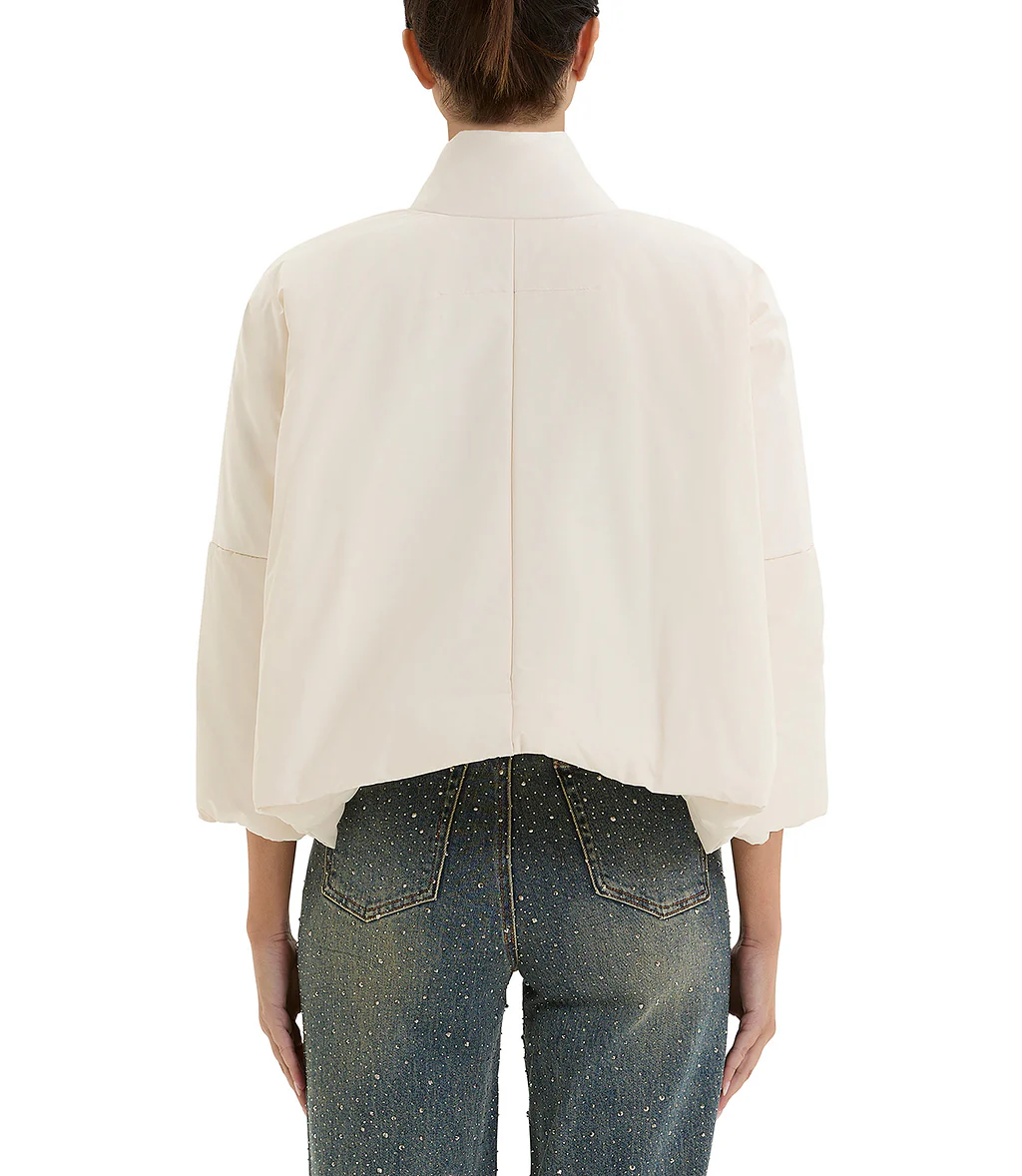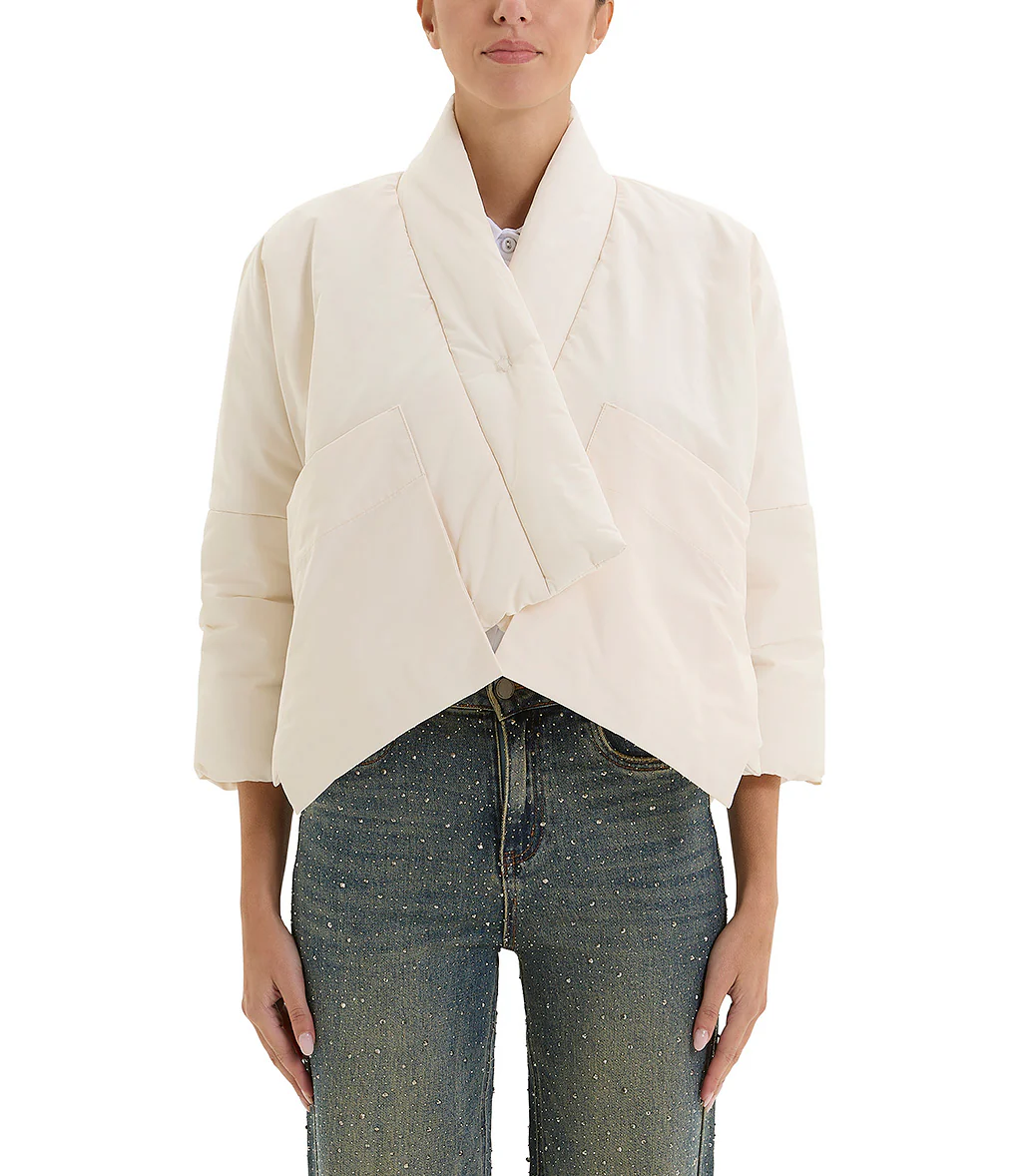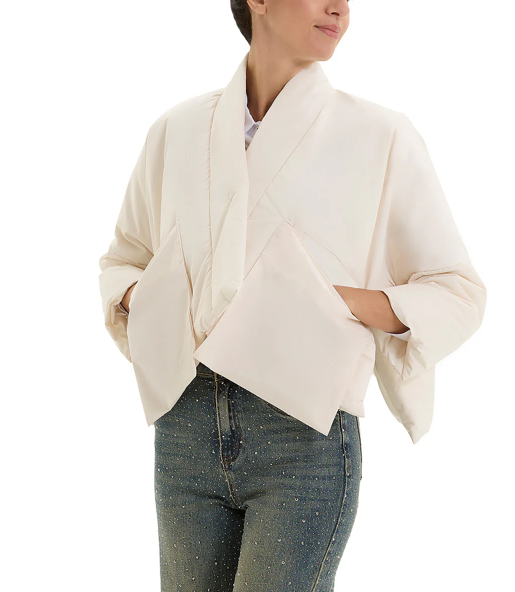 Piumino in polyestere color burro con scollo kimono asimmetrico e chiusura con un diplomatico. Presenti sul davanti delle grandi tasche a patta, con maniche a tre quarti.