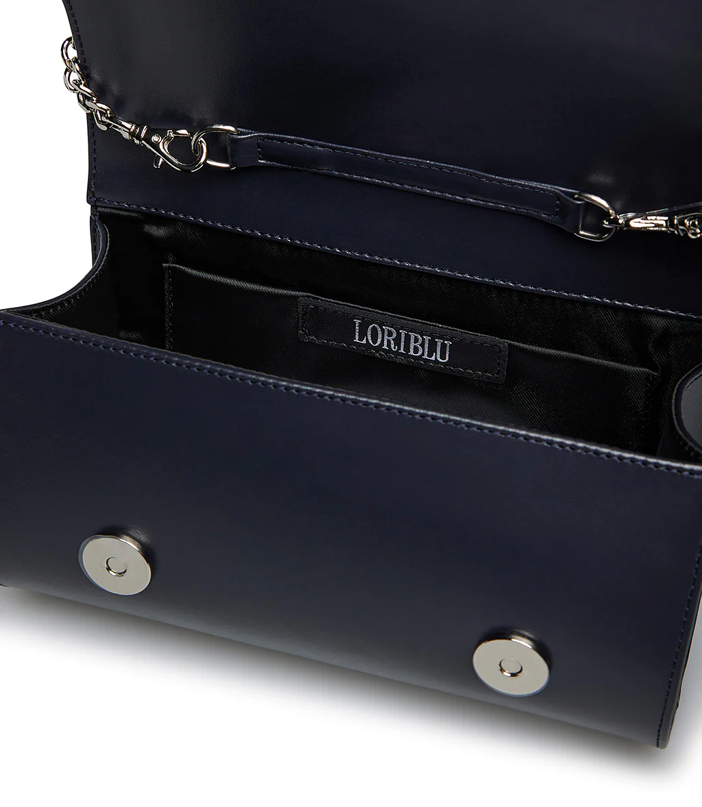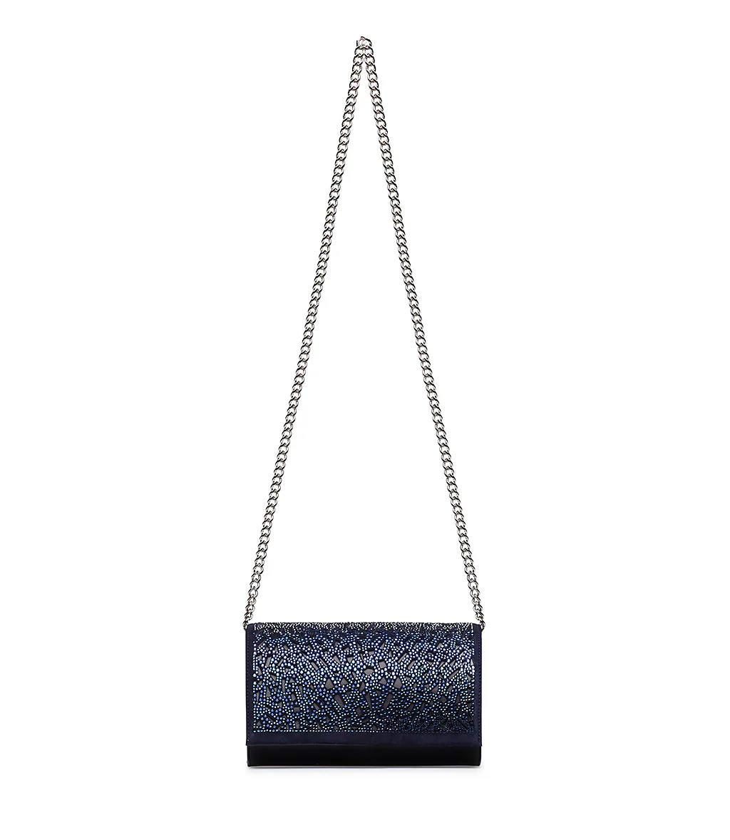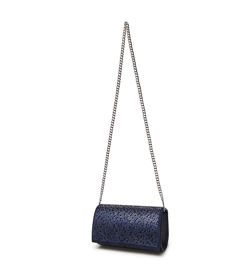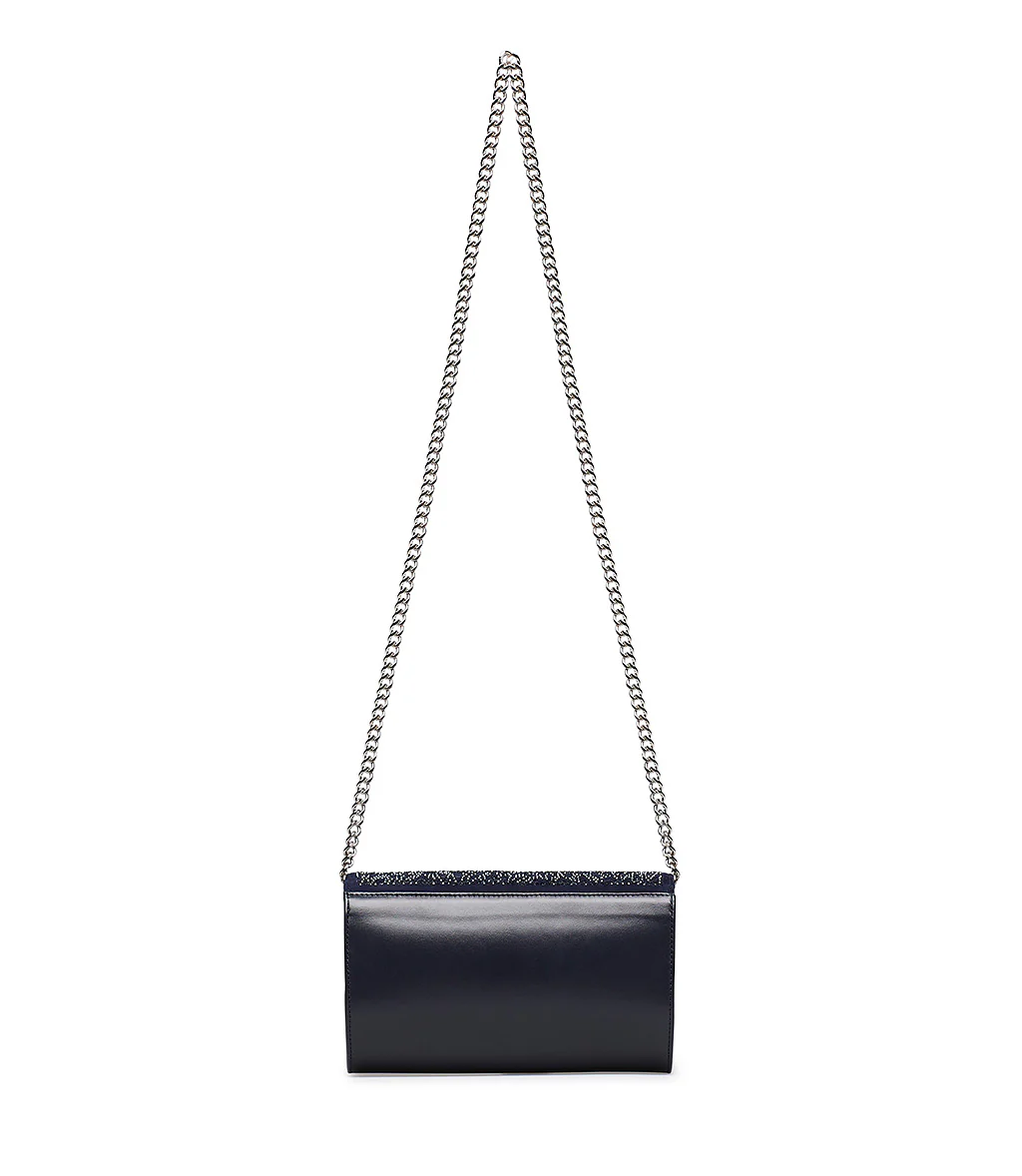 Realizzata in Italia in pregiata nappa blu scuro, la nostra pochette presenta un risvolto in pelle scamosciata ton-sur-ton ricoperto di luminosi cristalli dal design cut-out. Glamour e raffinata, rivela una chiusura magnetica nascosta e una tracolla sottile a catenella in metallo argentato. Indossala con un abito elegante al prossimo evento speciale.