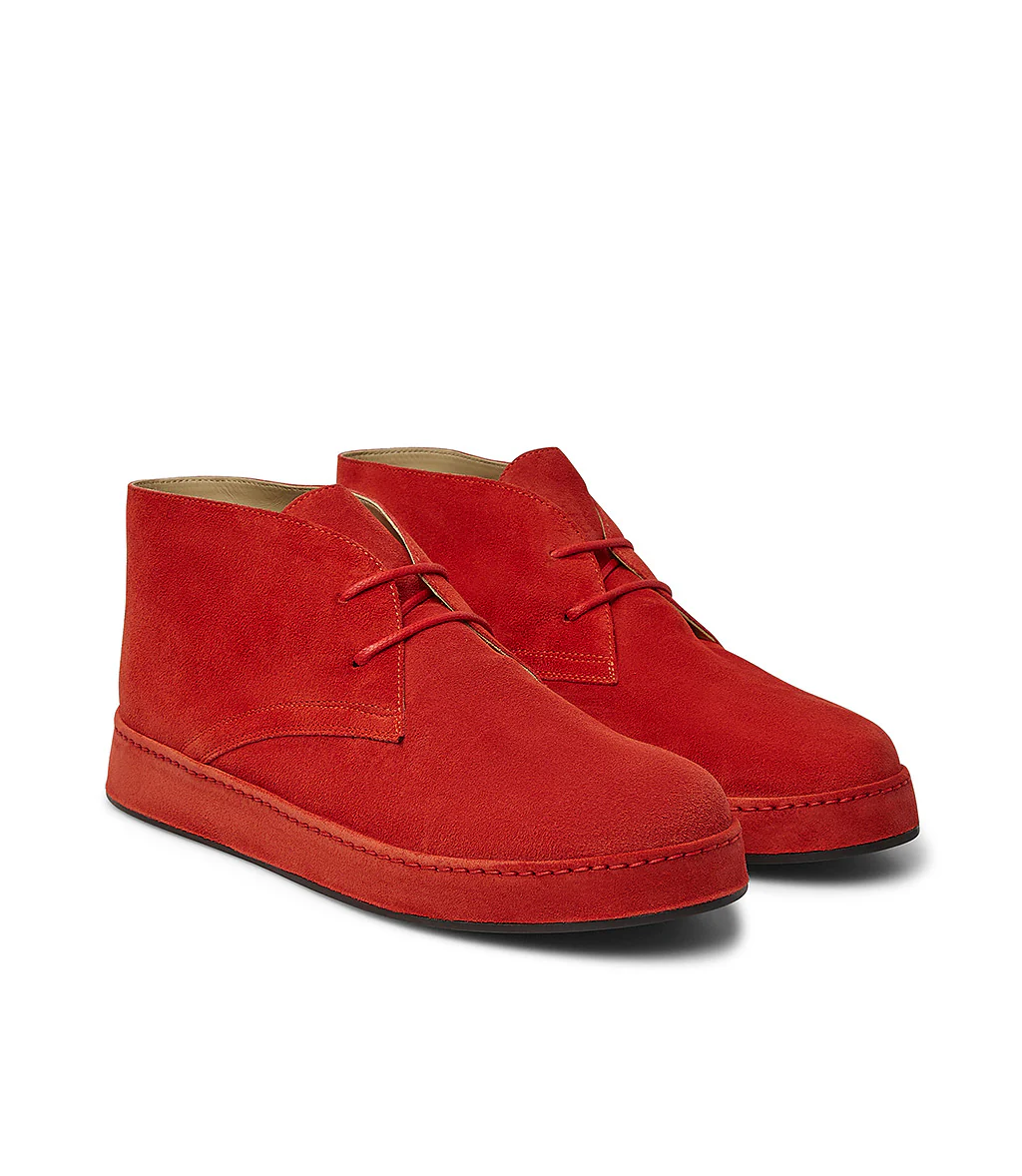 Alternativa cool ai classici stivaletti e sneakers, i nostri polacchini sono realizzati in Italia in brillante pelle scamosciata rossa. Presentano una punta arrotondata, lacci sottili cerati e una suola flatform ricoperta con fondo in gomma. Indossali con jeans e pantaloni cargo.