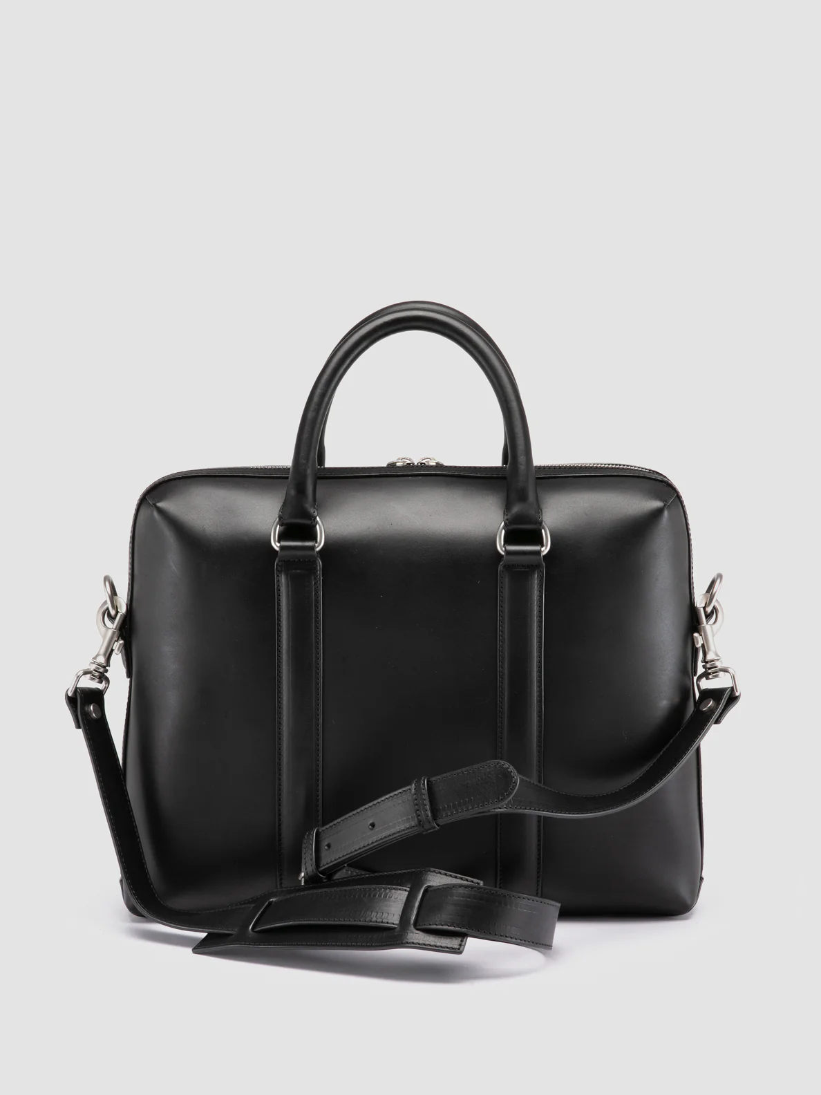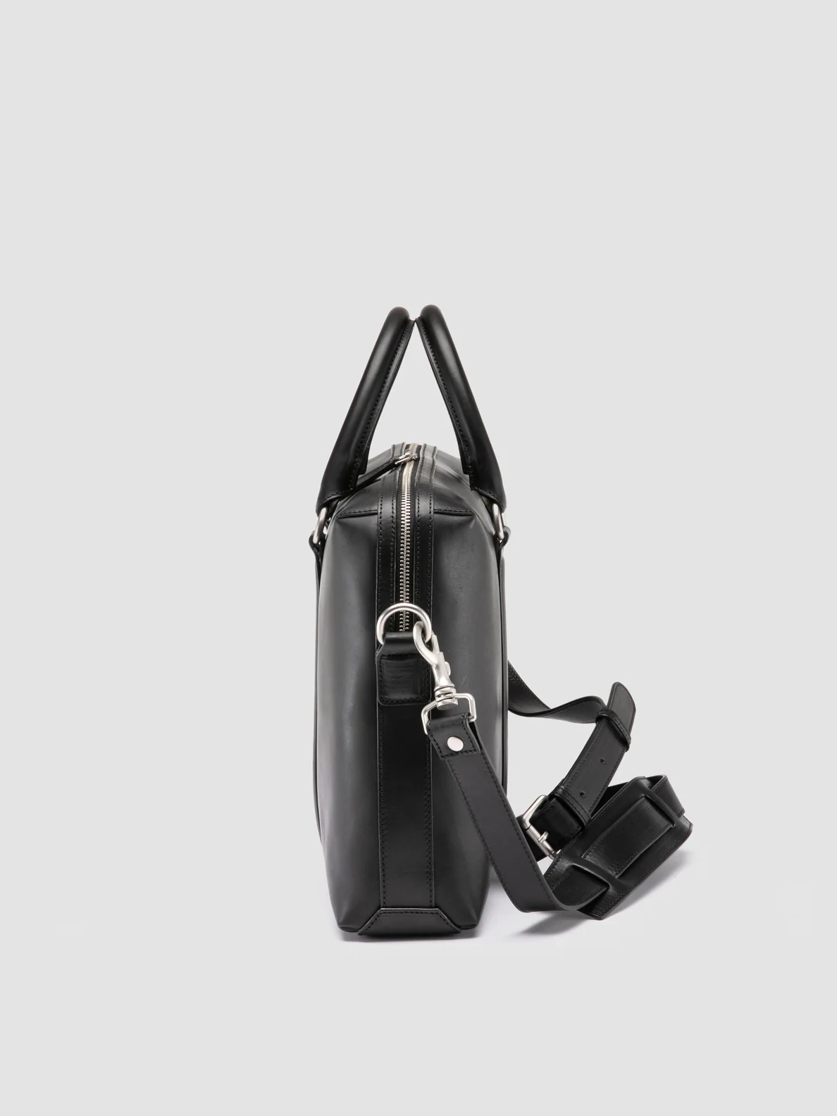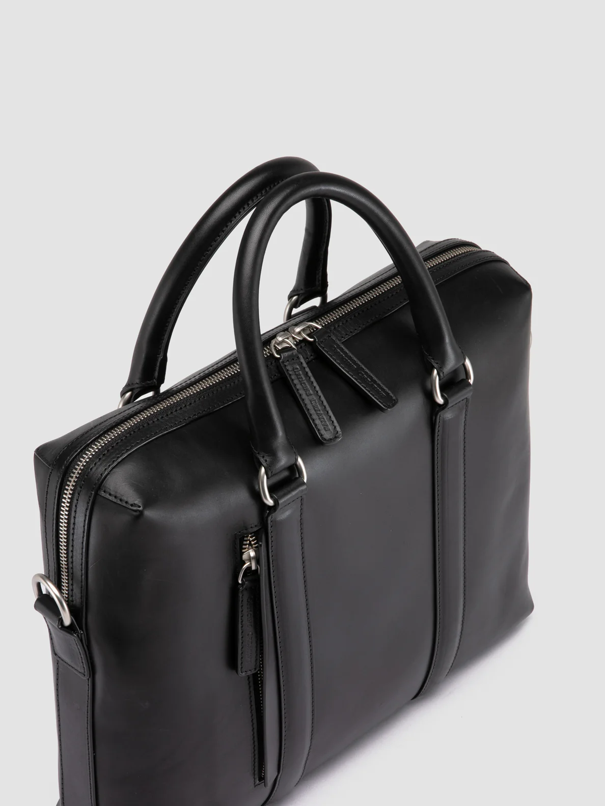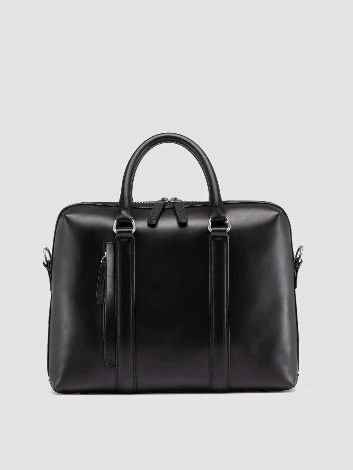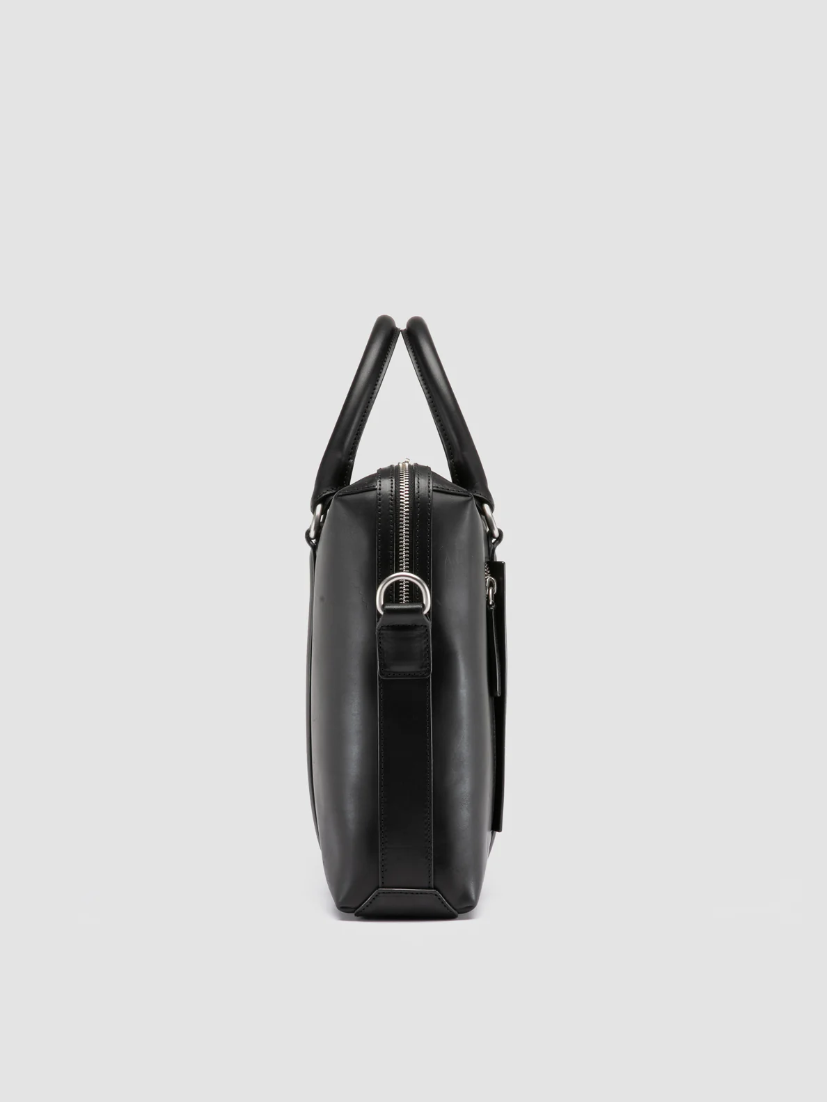 La borsa portadocumenti Quentin 019 è un prodotto sapientemente lavorato a mano in Italia in pregiata pelle nera. Presenta due manici superiori, una tracolla removibile e una pratica tasca con zip sul davanti, impreziosita da finiture in galvanica argento.