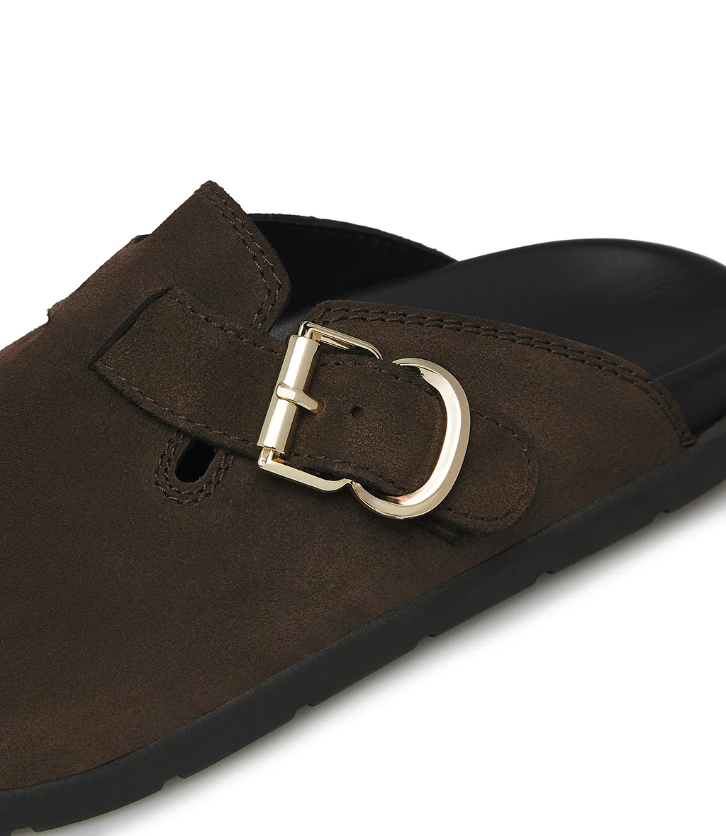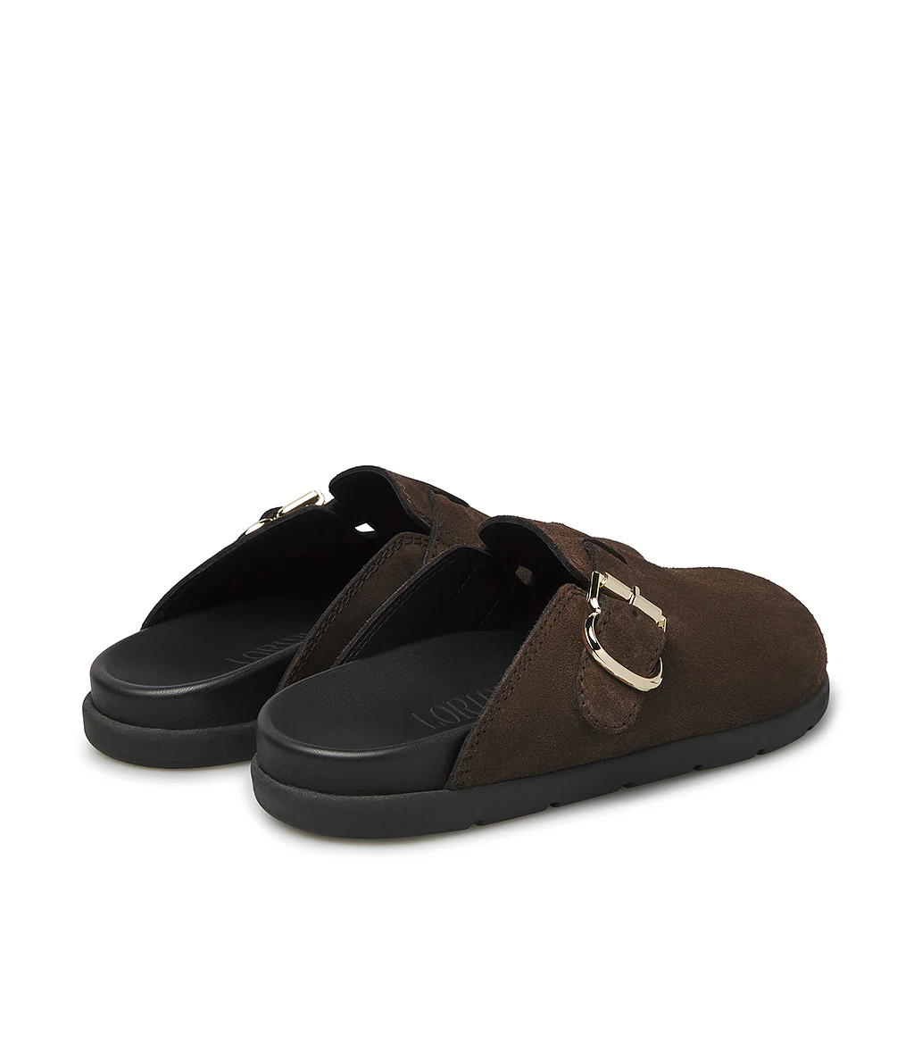 Alternativa cool alle classiche sneakers, i nostri sabot in pelle scamoscia moro presentano un design confortevole ed ergonomico impreziosito dal cinturino con fibbia in metallo dorato. Sono realizzate con cura in Italia e rivelano una punta arrotondata e una suola in gomma nera a contrasto dal tocco sportivo.