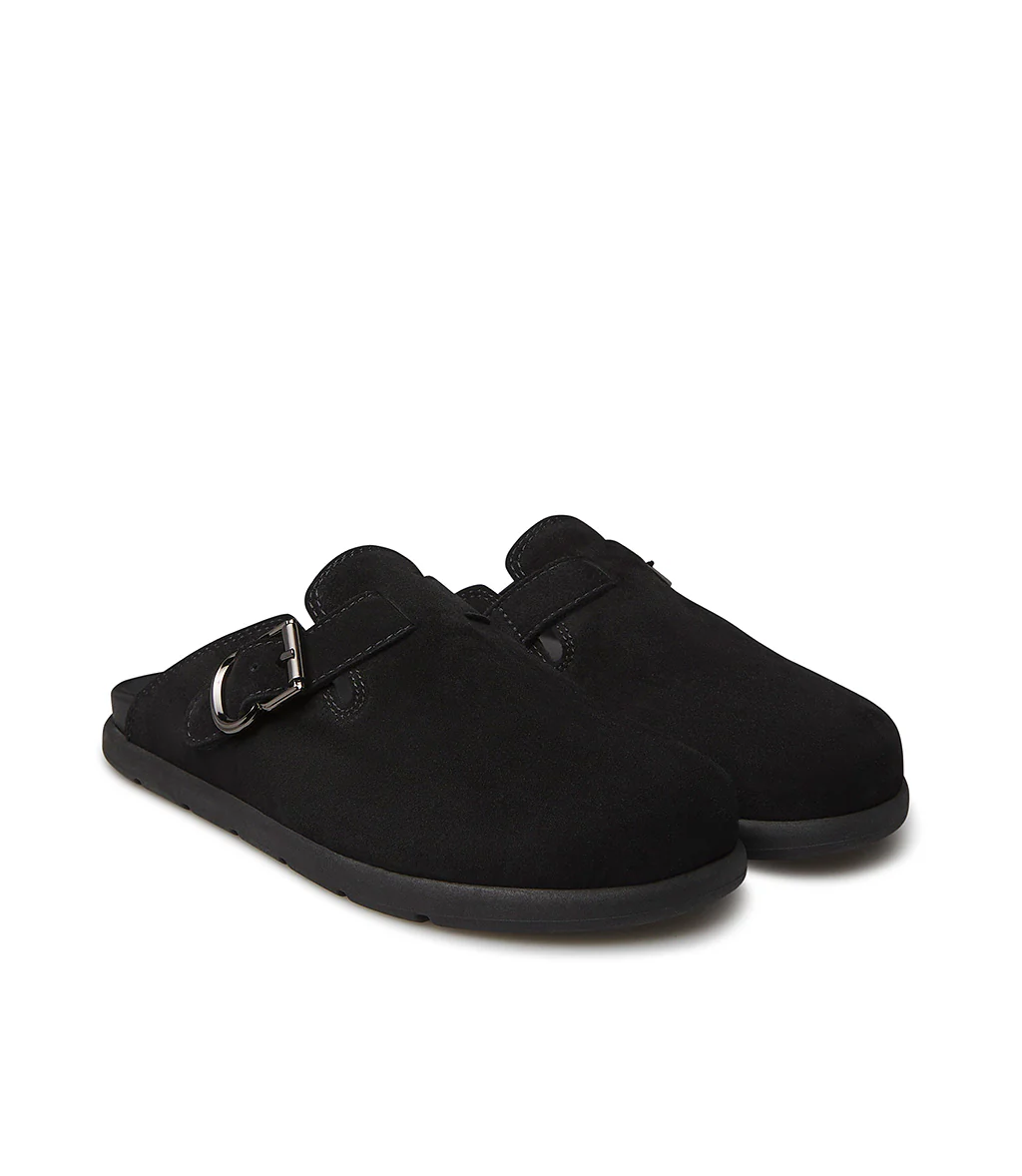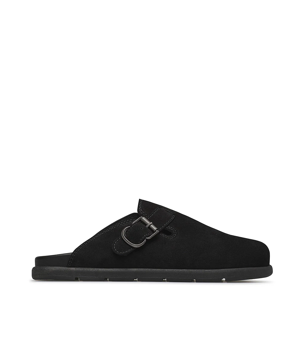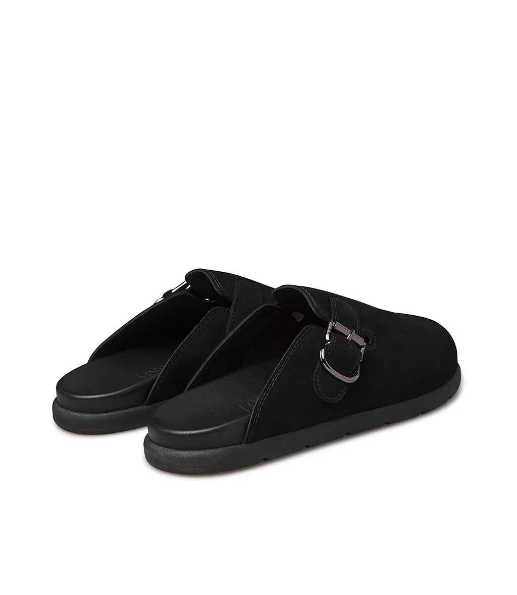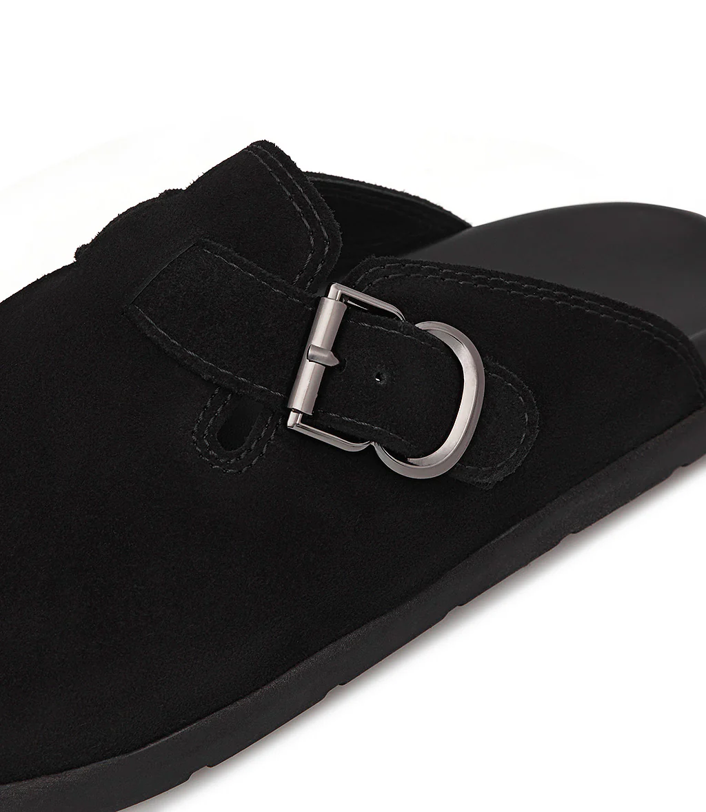 Alternativa cool alle classiche sneakers, i nostri sabot in pelle scamoscia nero presentano un design confortevole ed ergonomico impreziosito dal cinturino con fibbia in metallo. Sono realizzate con cura in Italia e rivelano una punta arrotondata e una suola in gomma dal tocco sportivo.