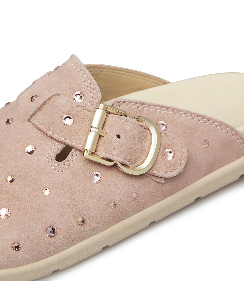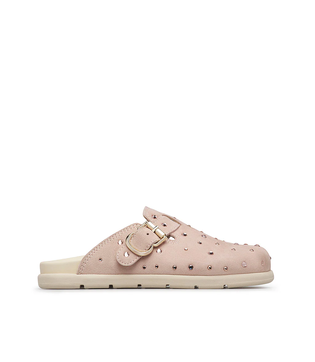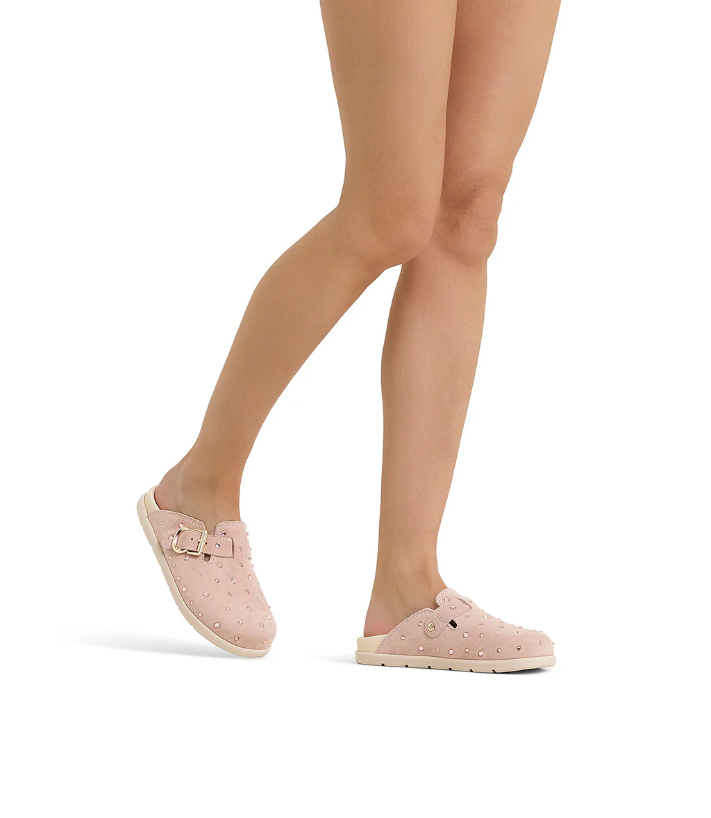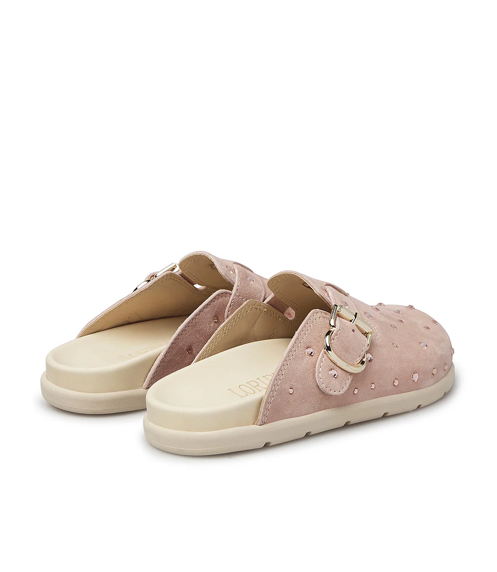 Alternativa cool alle classiche sneakers, i nostri sabot in pelle scamoscia rosa presentano un design confortevole ed ergonomico impreziosito da cristalli incastonati e dal cinturino con fibbia in metallo dorato. Sono realizzate con cura in Italia e rivelano una punta arrotondata e una suola in gomma bianca dal tocco sportivo.