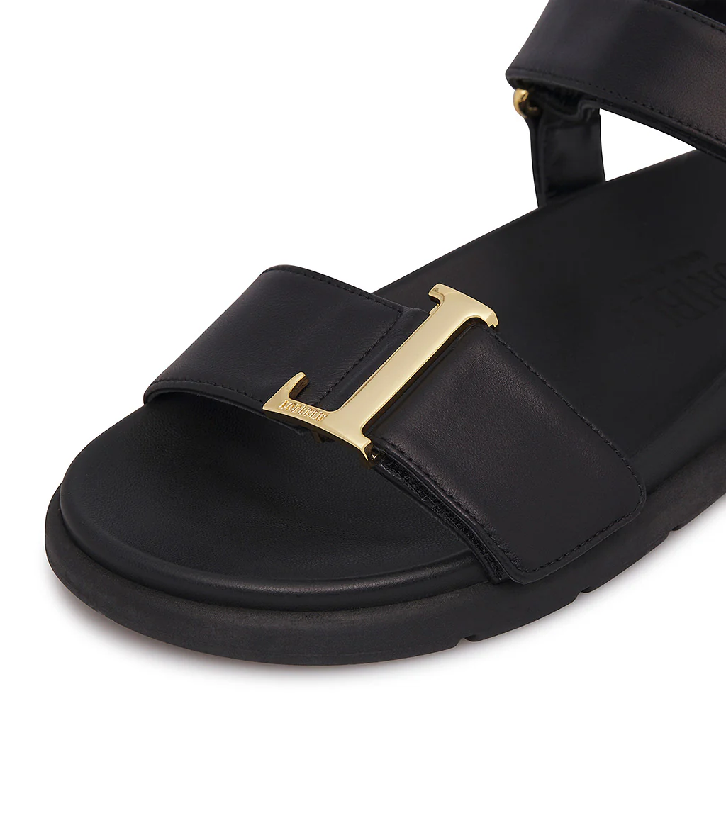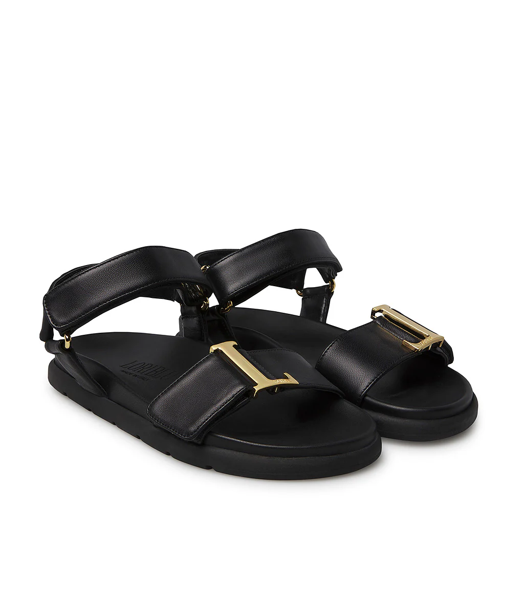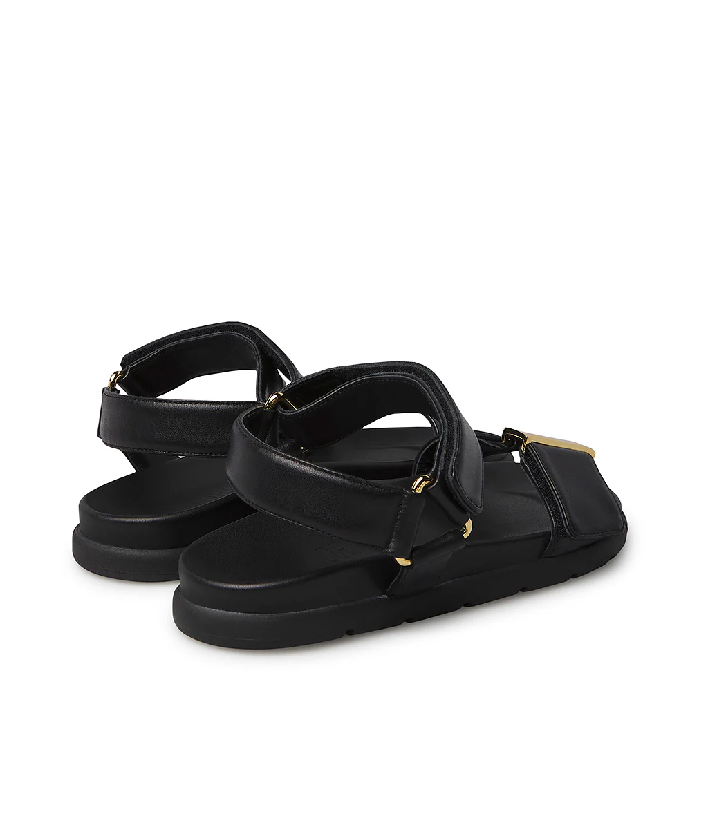 Perfetti da indossare tutti i giorni grazie al design confortevole ed elegante allo stesso tempo e alla suola platform ergonomica, i nostri sandali flat sono realizzati in pregiata nappa nera. 100% Made in Italy, spiccano grazie alla pratica chiusura velcro sul cinturino e sulla fascia fontale impreziosita dall fibbia logo in metallo dorato. Presentano punta arrotondata, suola in gomma di medio spessore dal profilo leggermente arcuato.