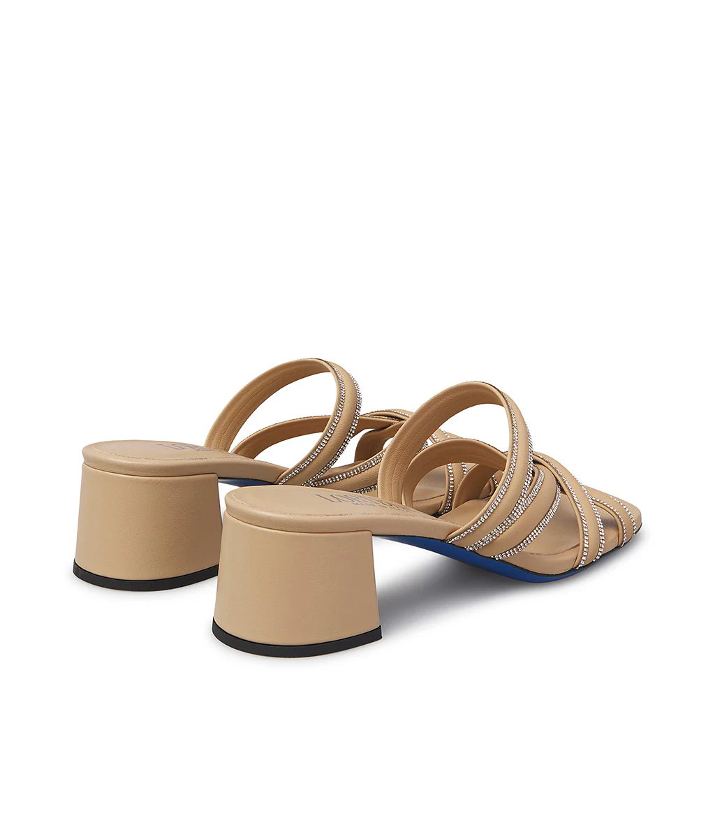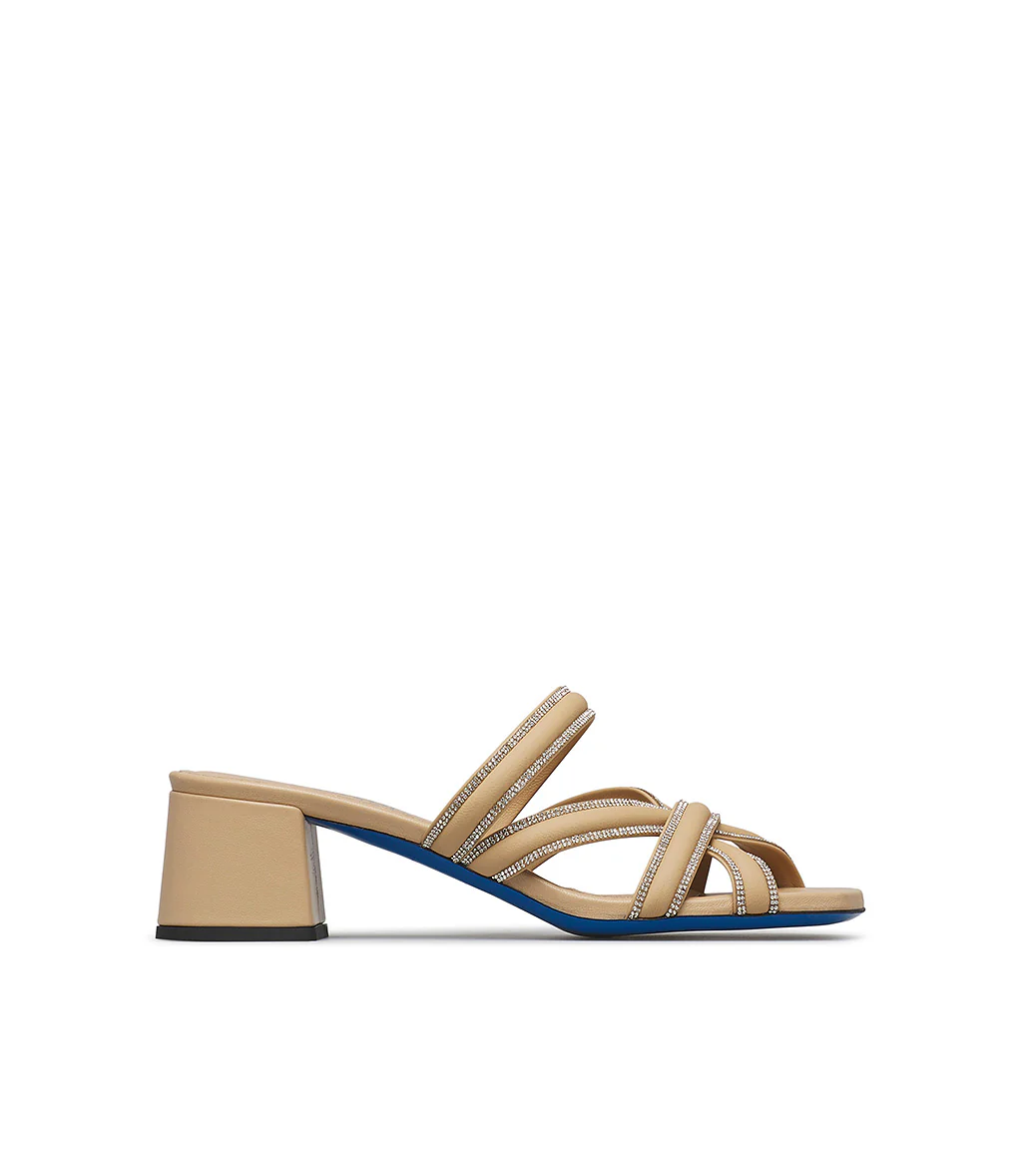 Sandalo in pregiatissima nappa color cipria. Realizzato a mano in Italia è il perfetto connubio tra stile e comfort. I cinturini intrecciati in nappa sono incorniciati da luminosi micro cristalli , un accento elegante che dona al modello una nota chic.Con tacco medio a blocco e suola iconica blu, questo sandalo è un must have di ogni guardaroba della stagione, da indossare sia in città che in vacanza.