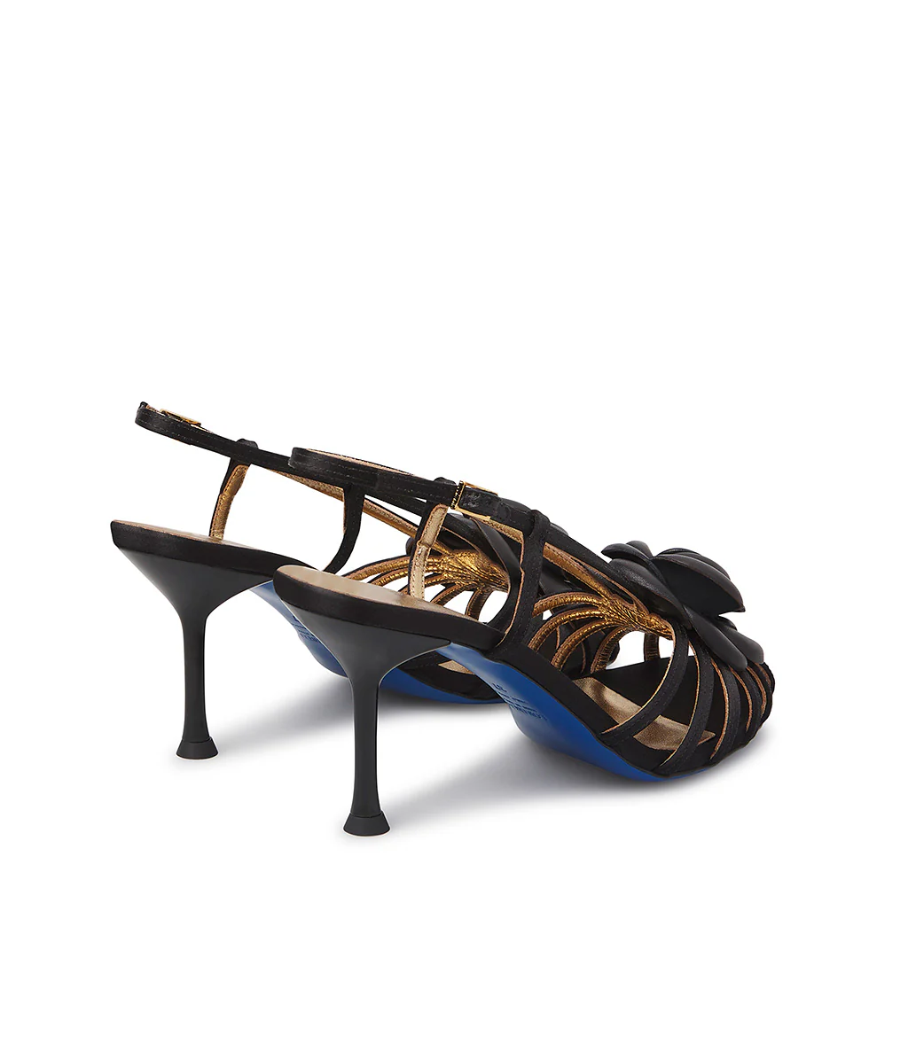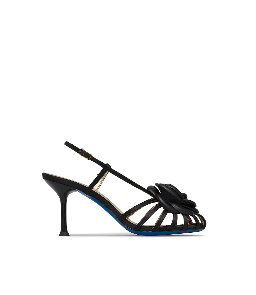 Un romantico fiore dai petali in pelle aggiunge un tocco glamour a questi seducenti sandali dall’iconico design di listini a raggiera. Sono realizzati con cura in Italia in raso nero e presentano un alto tacco a spillo, un sottile cinturino frontale con fibbia rettangolare di chiusura e la suola in cuoio blu. Mettili in risalto con il tuo outfit da party preferito.