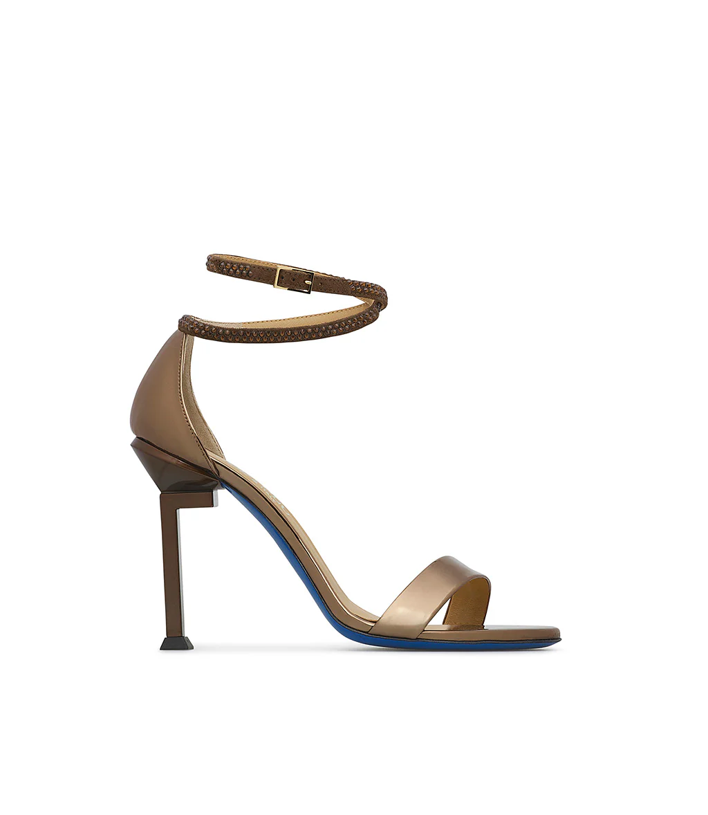 Eleganza e glamour si fondono alla perfezione nei nostri sandali in pregiata vernice bronzo della nuova collezione. Realizzati in Italia, presentano il nostro distintivo tacco a L rovesciata, cinturini sottili alla caviglia in camoscio impreziositi da cristalli tono su tono e l’iconica suola in cuoio blu. Indossali con i tuoi outfits più chic, sia di giorno che di sera.
