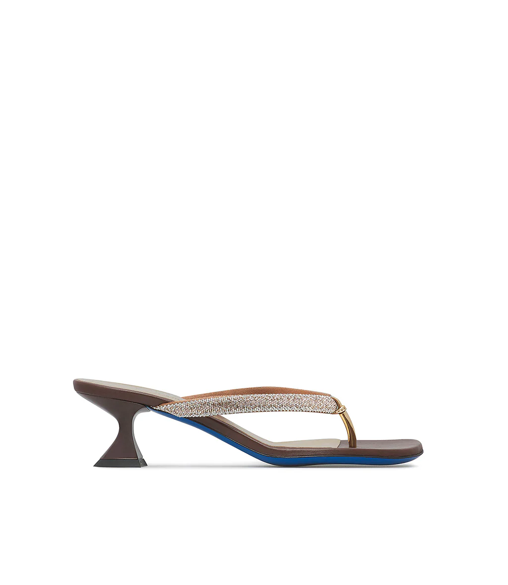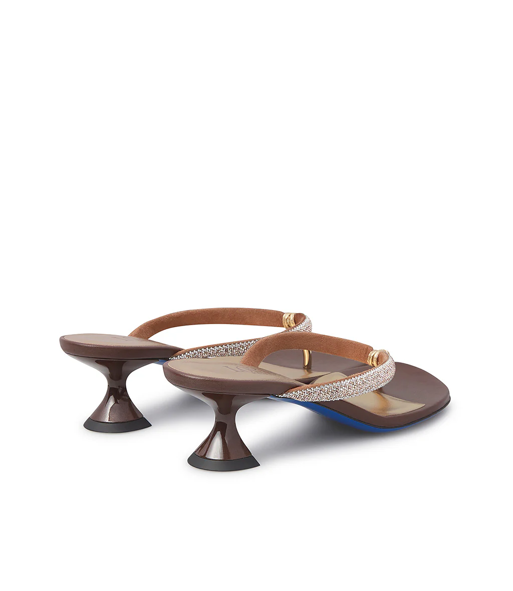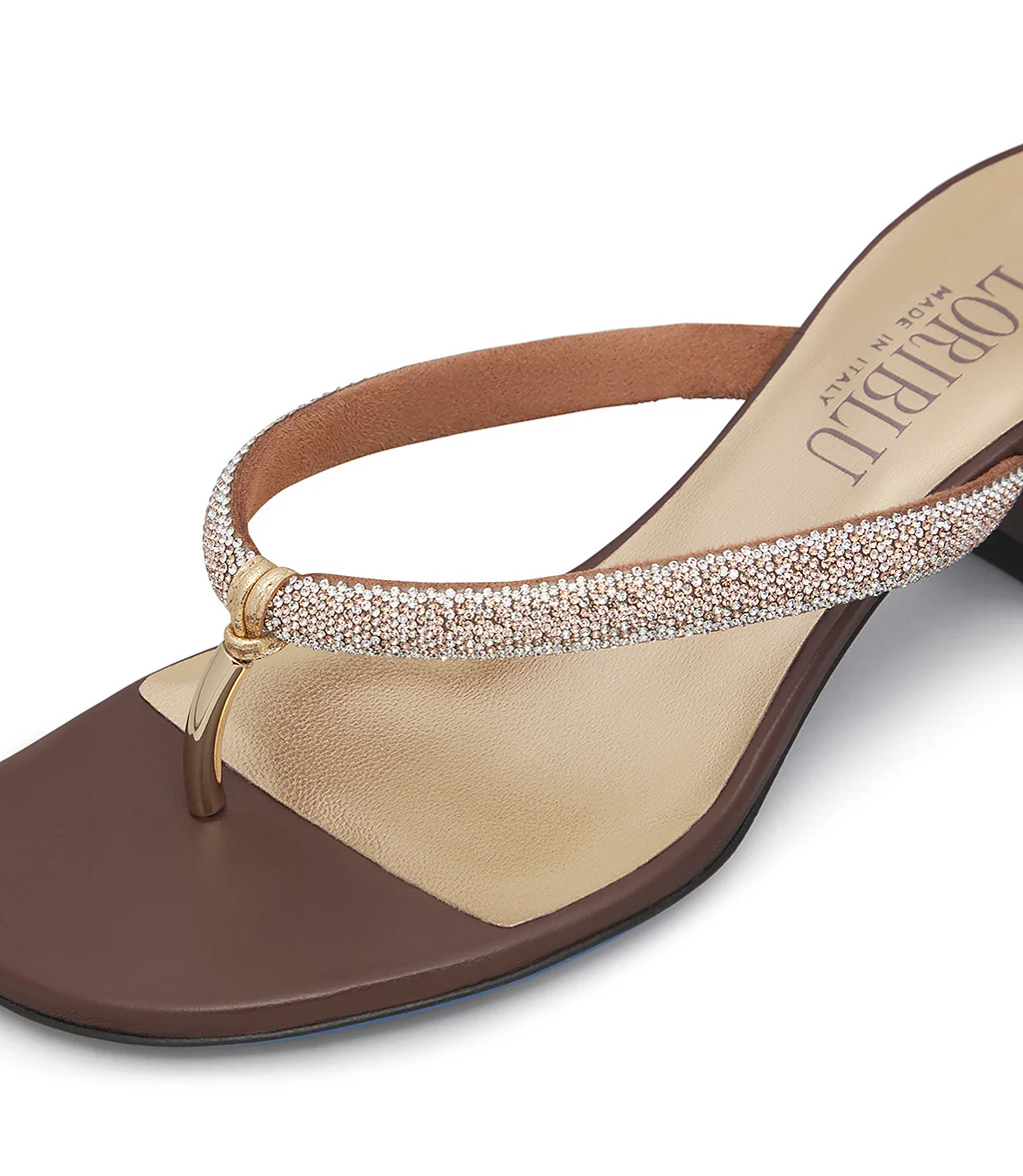 Originali e grintosi, i nostri sandali a infradito sono realizzati in Italia in vitello marrone e rivelano un cinturino tubolare impreziosito da micro cristalli tono su tono. Punta arrotondata, un confortevole tacco basso a rocchetto e l’iconica suola blu. Versatili ed eleganti, completano gli outfit preferiti della stagione estiva