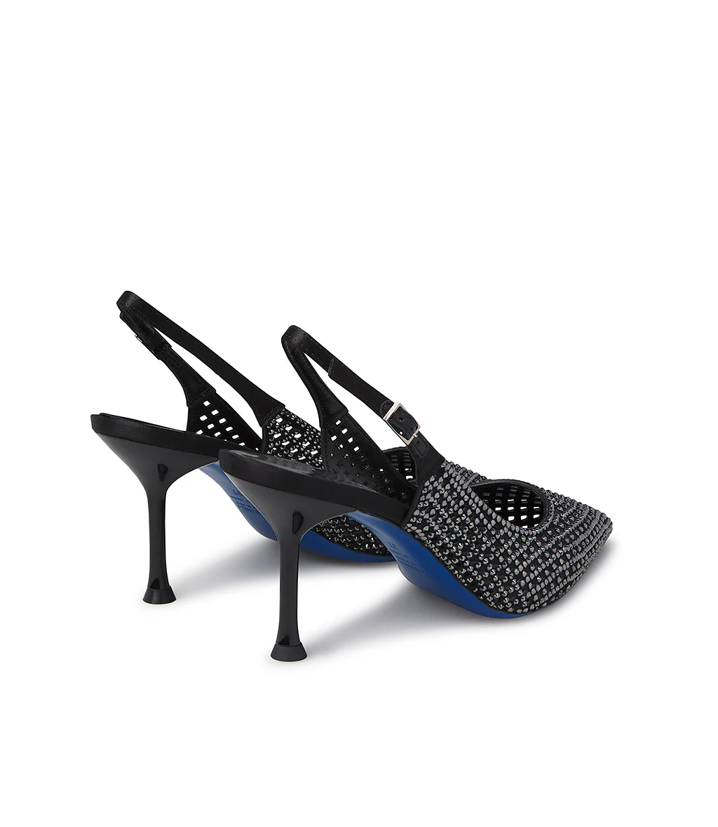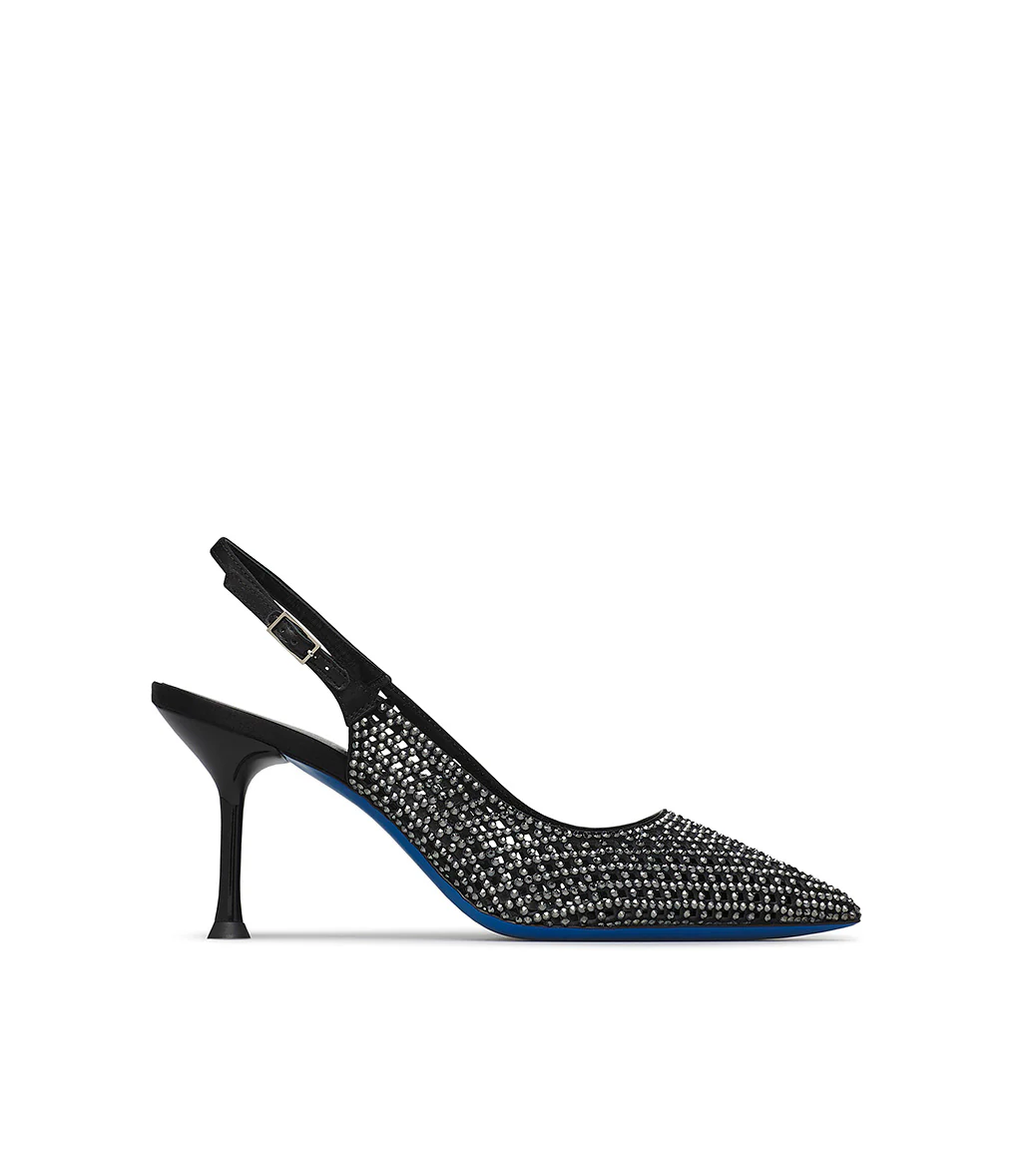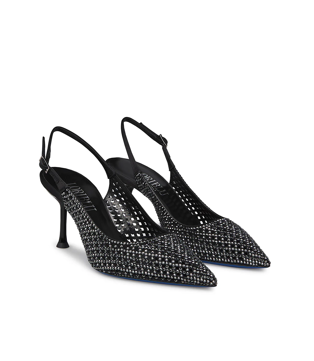 Femminili ed eleganti, le nuove slingback gioello ti conquisteranno. La delicatezza del camoscio nero dal design cut out geometrico illuminata da scintillanti cristalli argento e dalla raffinatezza del cinturino, creano un accessorio unico, caratterizzato da punta affusolata e tacco a spillo e dalla iconica suola Loriblu. Indossale nelle occasioni speciali.