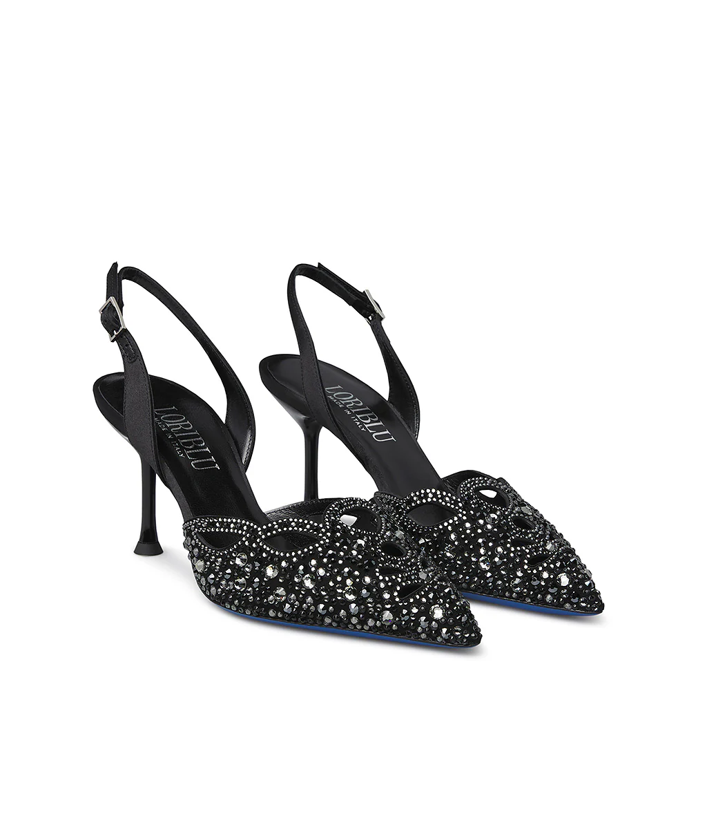 Glamour ed estremamente affinate, le nostre slingback gioiello sono perfette per completare i tuoi outfits più speciali ed esclusivi da cerimonia. Sono realizzate in Italia in pelle scamosciata nero dal design a intaglio e impreziosite da cristalli degradé argento. Rivelano un classico cinturino posteriore regolabile in raso tabacco, iconica suola in cuoio blu e un elegante tacco a rocchetto laccato.