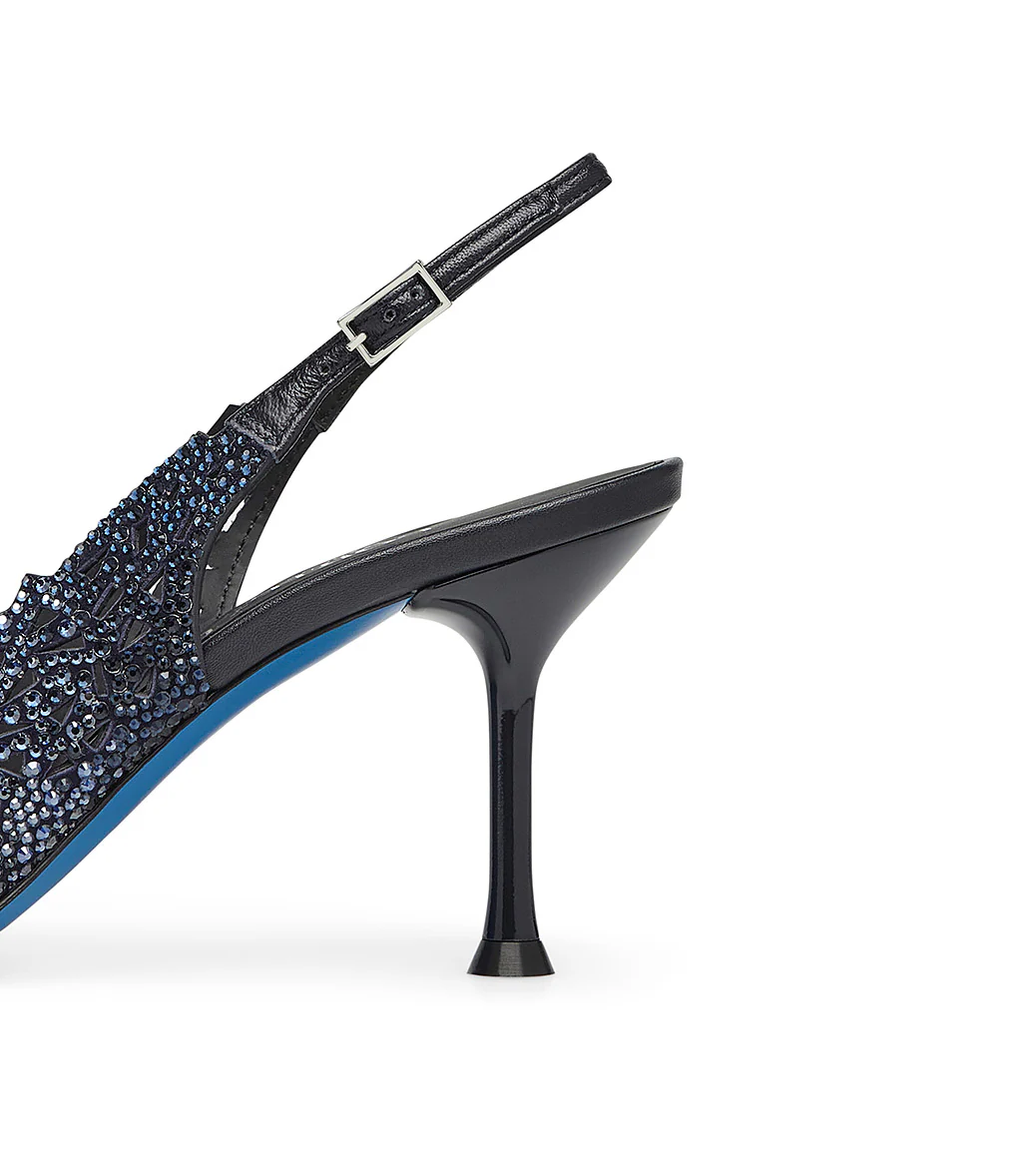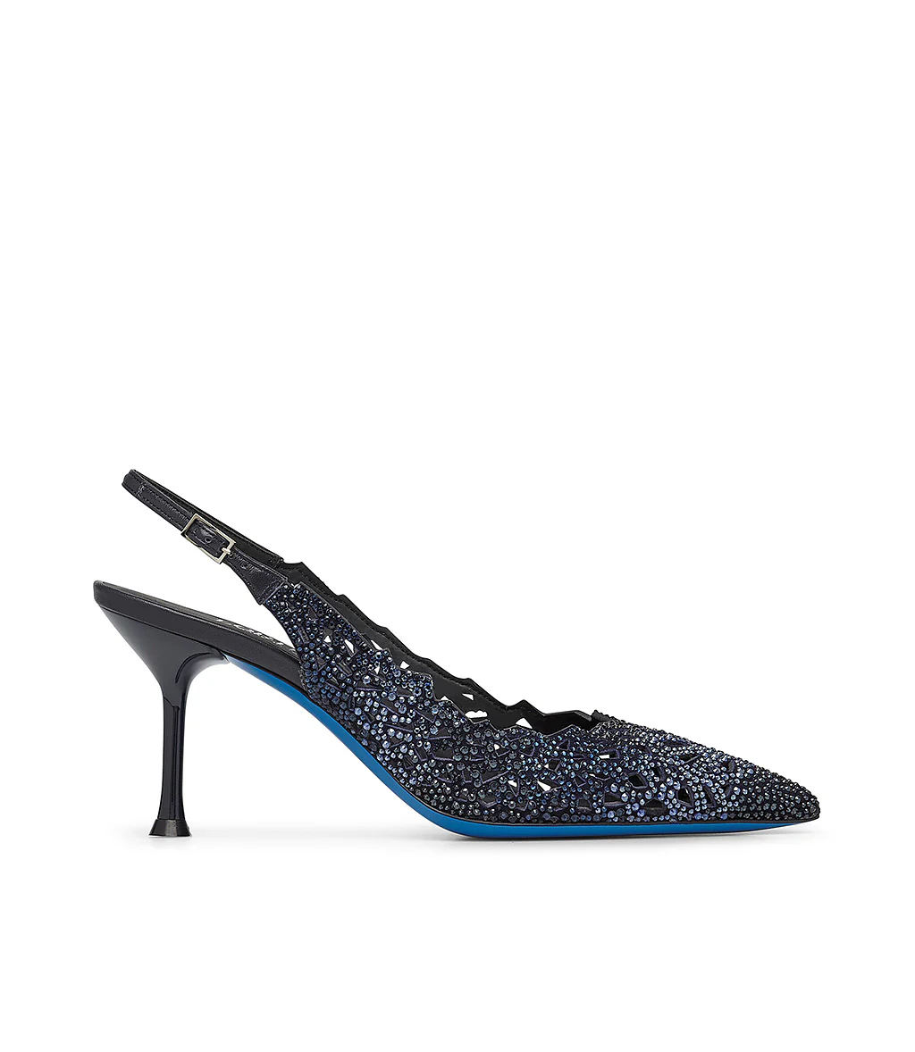 Una raffinata eleganza contraddistingue le nostre esclusive slingback in pelle scamosciata blu. Realizzate interamente in Italia, rivelano una tomaia laser-cut impreziosita da cristalli, punta affusolata, cinturino posteriore regolabile in pelle, suola iconica in cuoio blu e tacco a spillo. Rendile il focus dei tuoi outfits speciali.