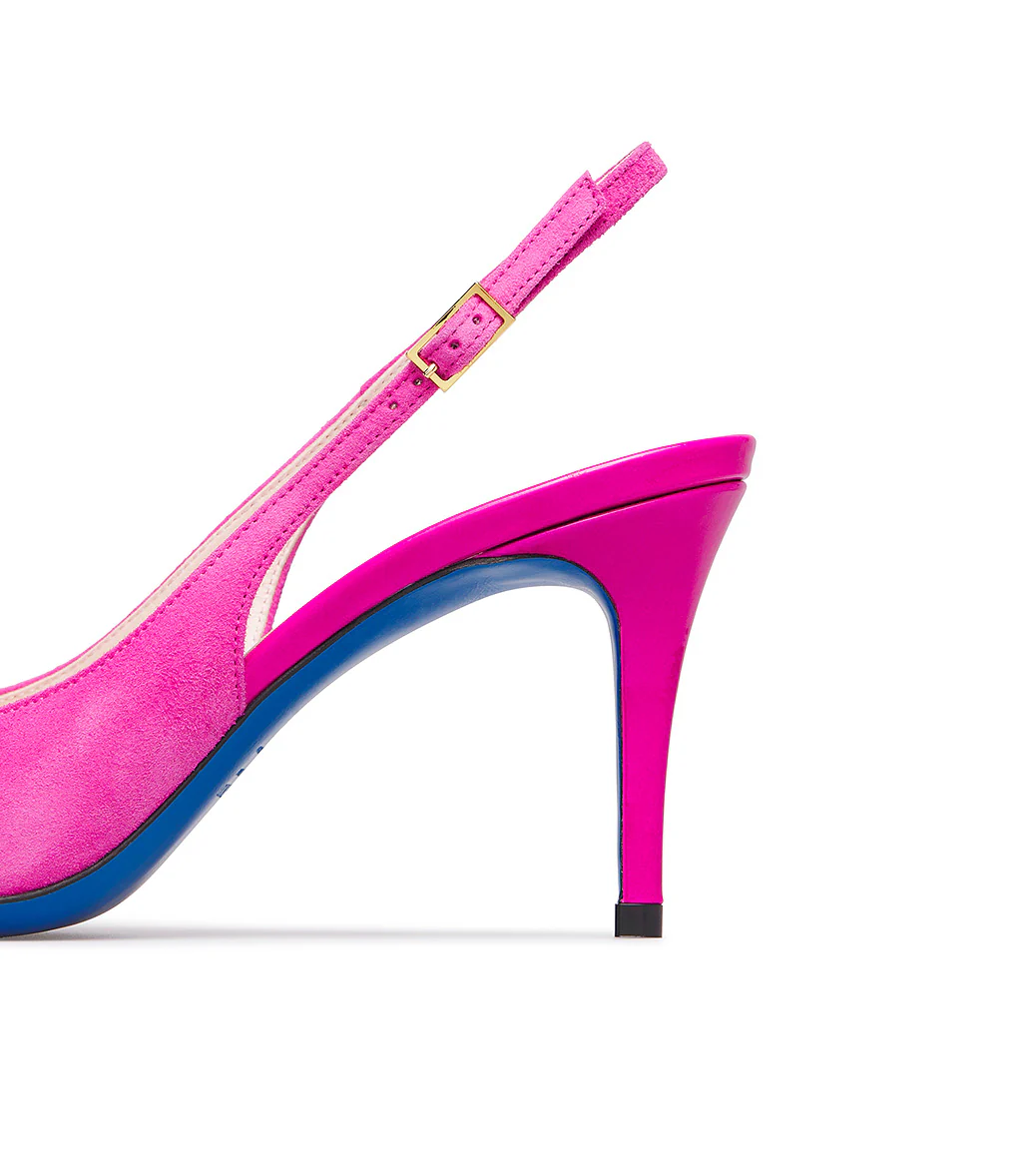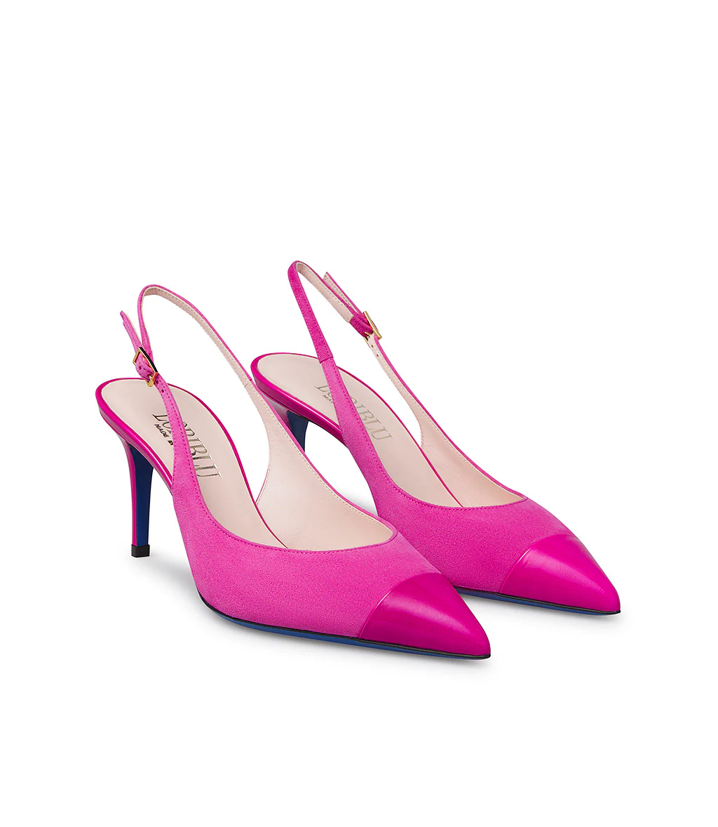 Elevate da un elegante tacco a spillo, le nostre slingback in pregiato camoscio dalle nuance fucsia con dettaglio in vernice, incantano grazie alla loro eleganza senza tempo; il classico cinturino posteriore regolabile e l’iconica suola in cuoio blu completano il design. 100% Made in Italy.