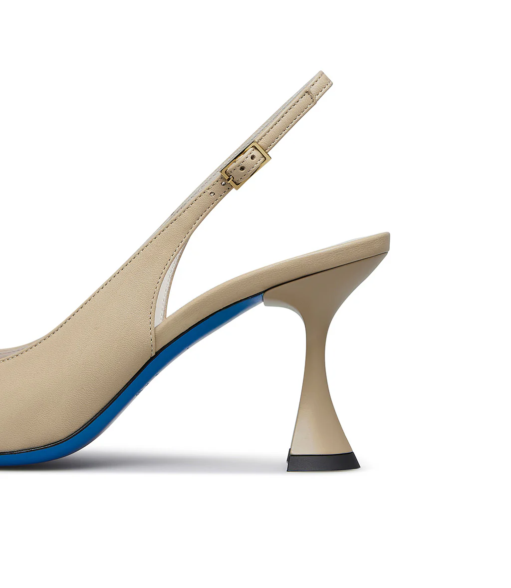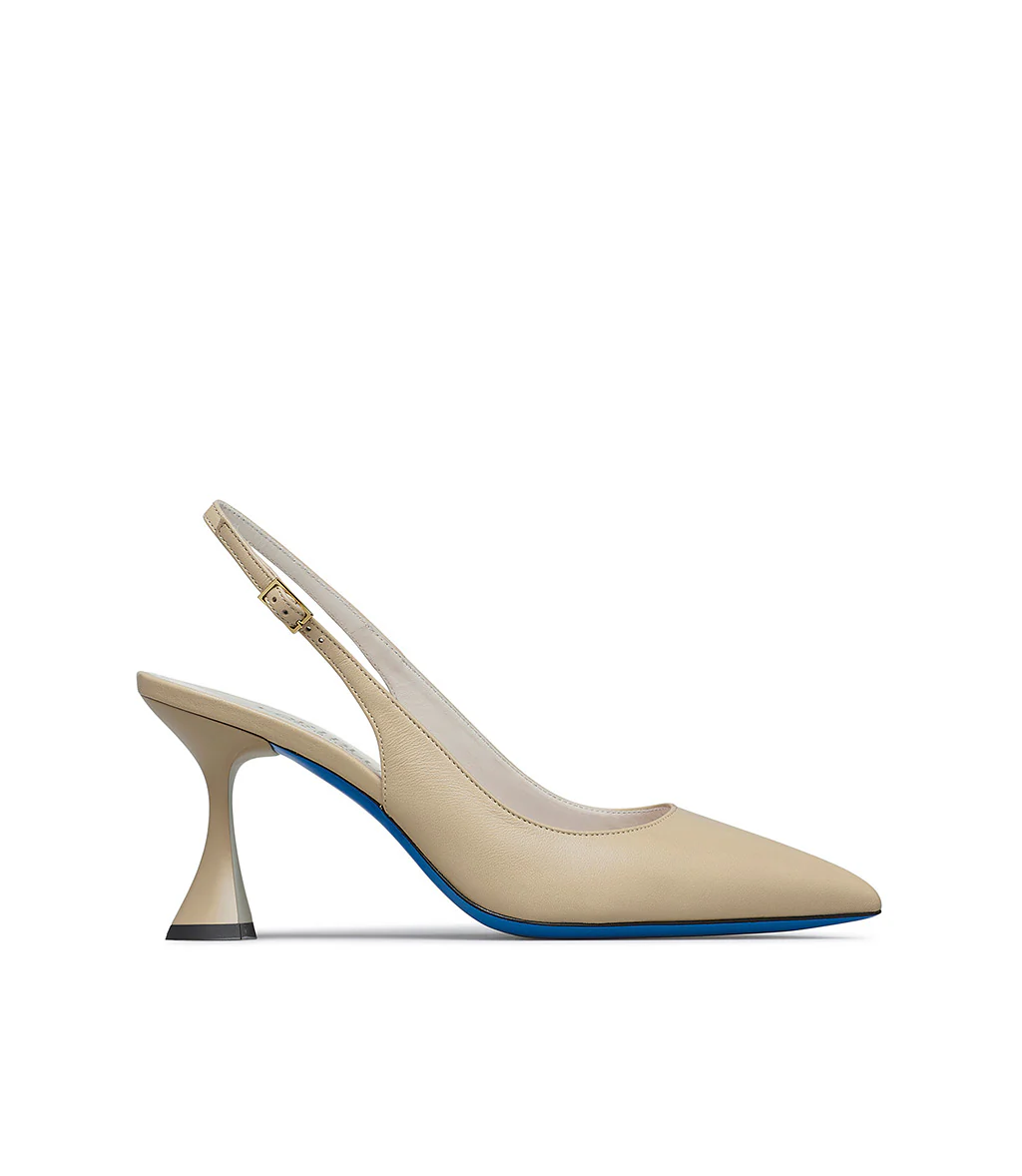 Chic e raffinate, le nostre slingback in nappa sabbia sono perfette da abbinare ad outfits eleganti e per le occasioni speciali. Sono realizzate con cura in Italia e rivelano una punta affusolata, tacco svasato, classico cinturino posteriore regolabile, fodera e soletta in pelle e distintiva suola in cuoio blu.