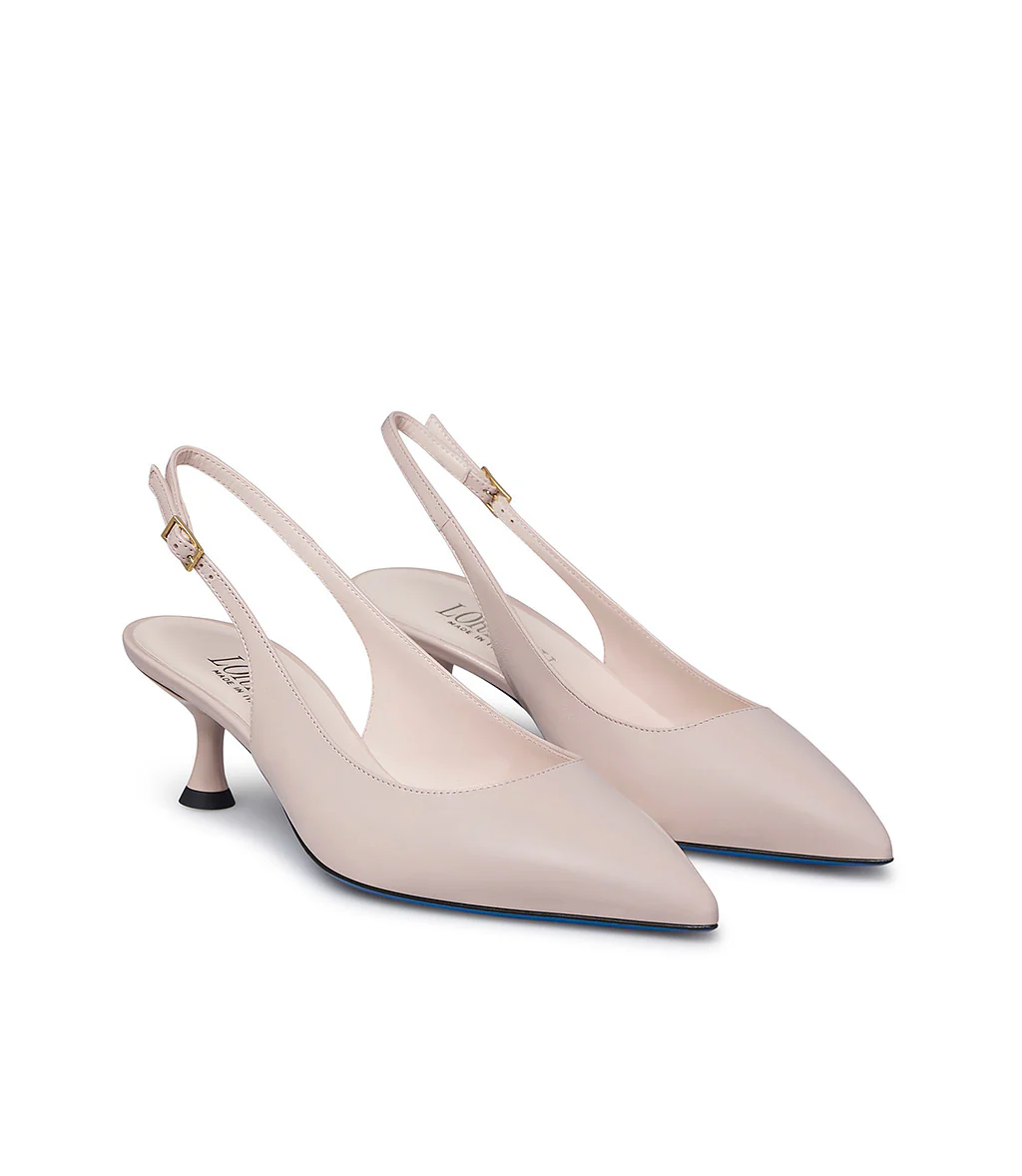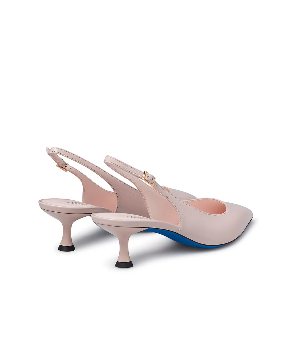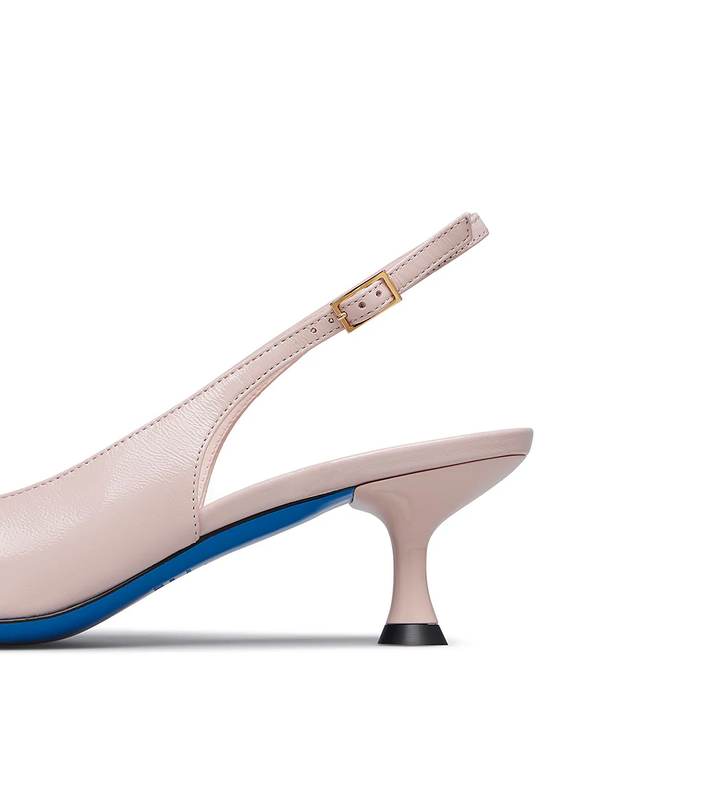 Chic e raffinate, le nostre slingback in pelle lucida nuance rosa petalo sono perfette da abbinare ad outfits eleganti e per le occasioni speciali. Sono realizzate con cura in Italia e rivelano una punta affusolata, tacco a rocchetto, classico cinturino posteriore regolabile, fodera e soletta in pelle e distintiva suola in cuoio blu.