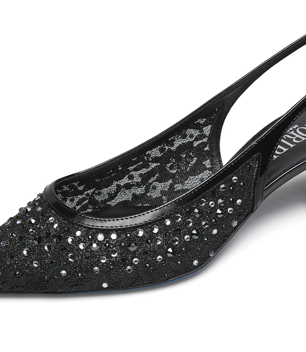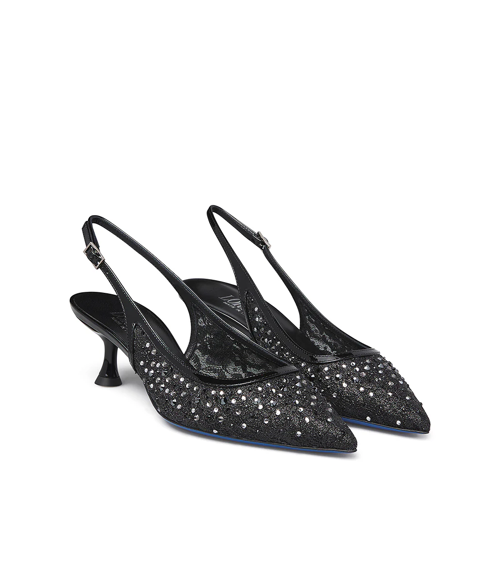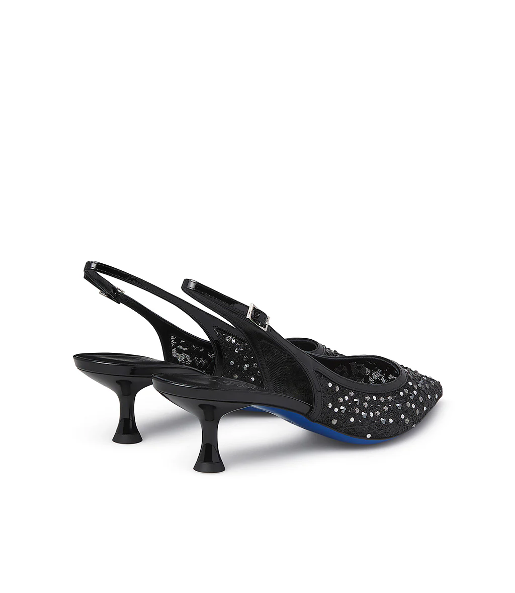 Femminili ed eleganti, le nuove slingback in pizzo e vernice nero ti conquisteranno. La delicatezza del pizzo e la raffinatezza dei dettagli in vernice si uniscono alla luminosità dei cristalli in argento creando un accessorio unico. Punta affusolata, tacco a rocchetto e l’iconica suola Loriblu completano il modello. Indossale nelle occasioni speciali.