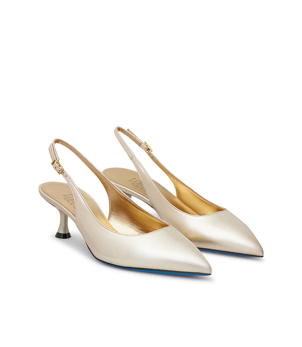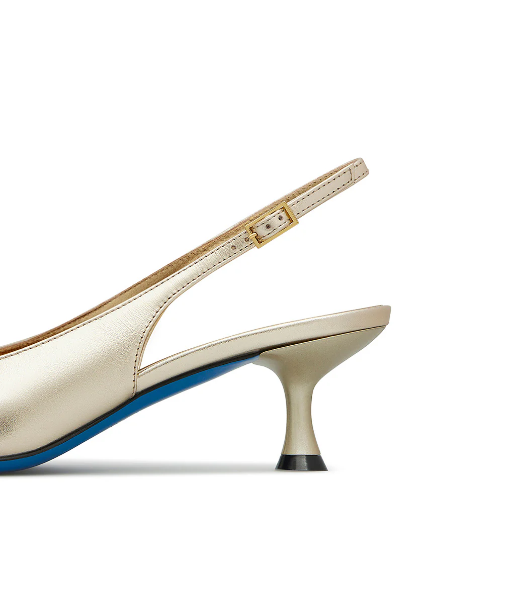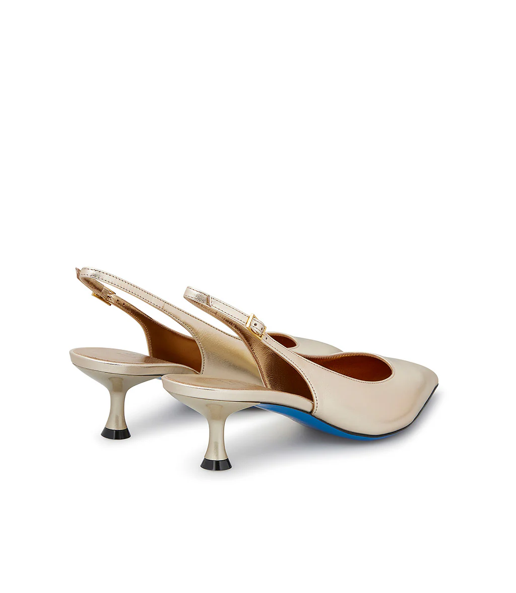 Chic e raffinate, le nostre slingback in vitello oro sono perfette da abbinare ad outfits eleganti e per le occasioni speciali. Sono realizzate con cura in Italia e rivelano una punta affusolata, tacco a rocchetto, classico cinturino posteriore regolabile, fodera e soletta in pelle e distintiva suola in cuoio blu.