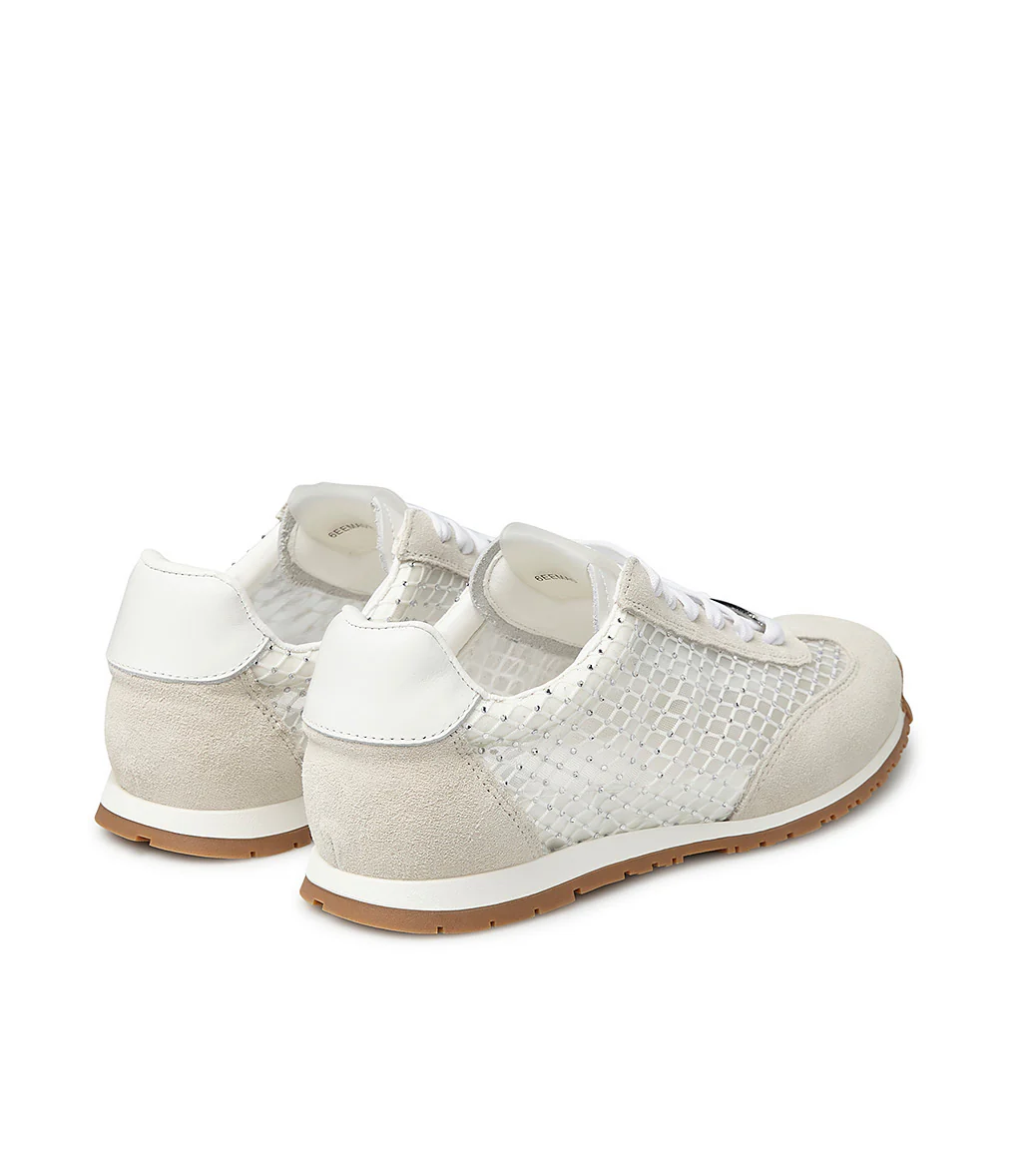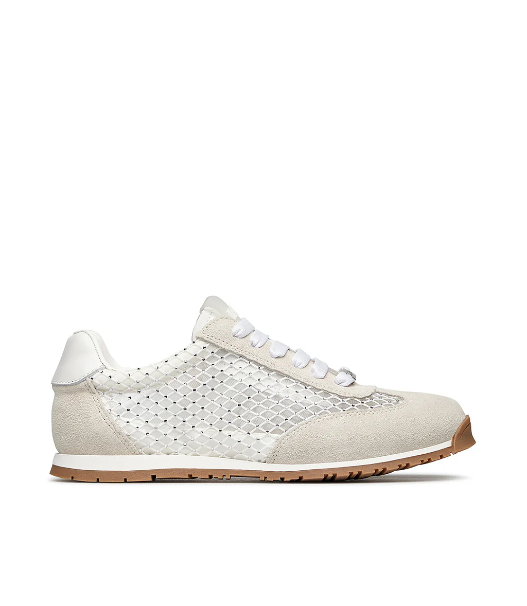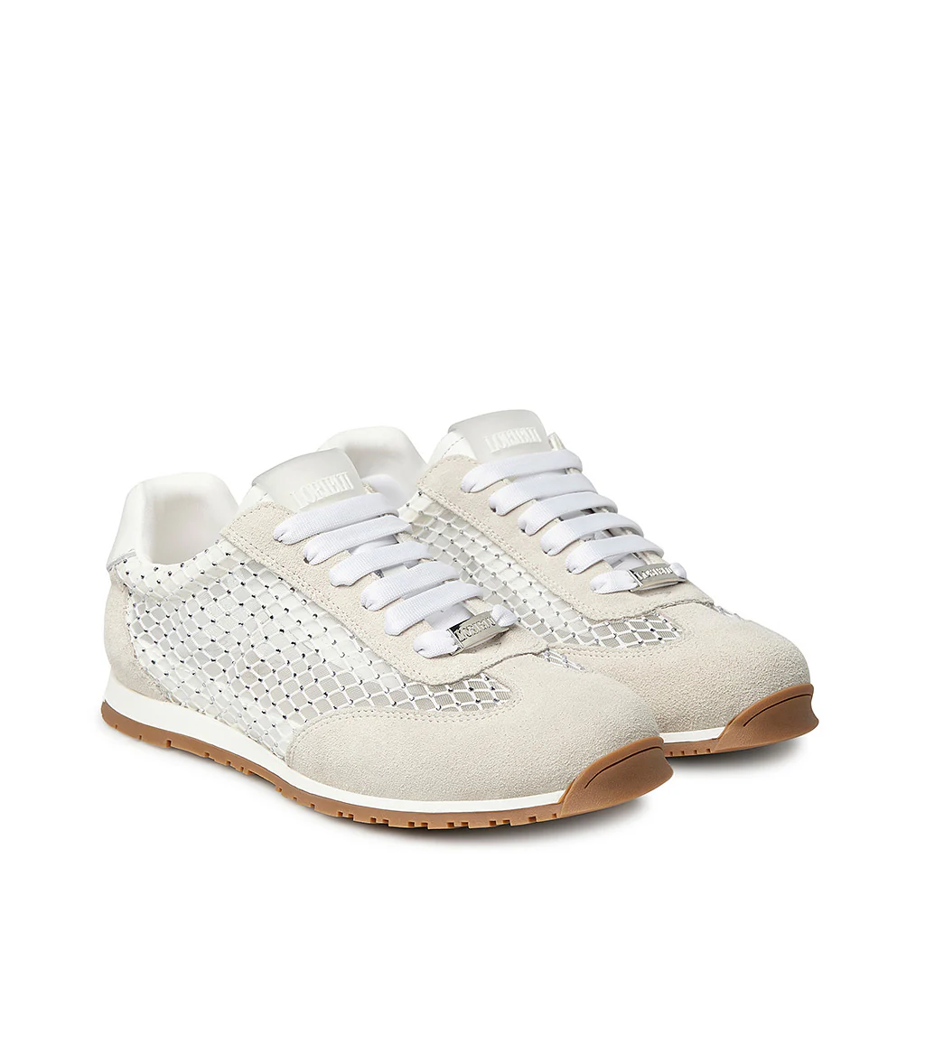 Carattere sporty-chic per le nostre sneaker della nuova collezione Realizzate in Italia in pregiato camoscio panna, si contraddistinguono per lo scintillio dei microcristalli tono su tono sui delicati inserti in rete. Lacci frontali in raso bianco con logo in metallo.La suola chunky in gomma a contrasto si abbina perfettamente con il design.