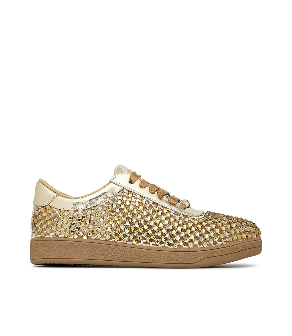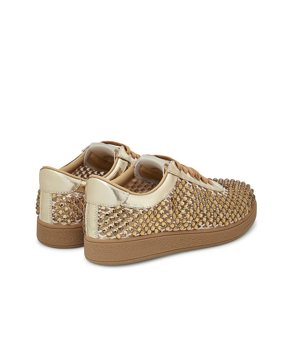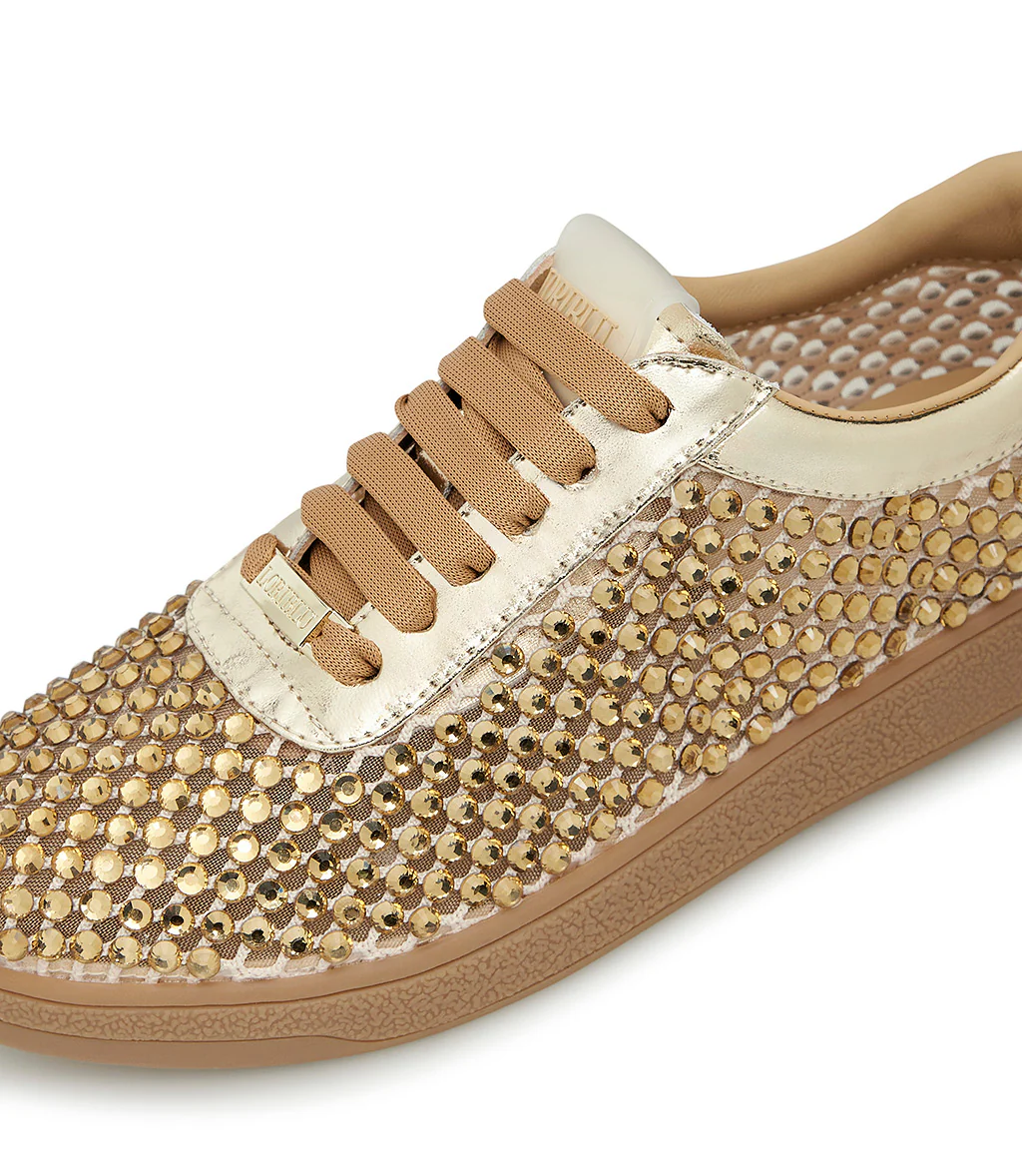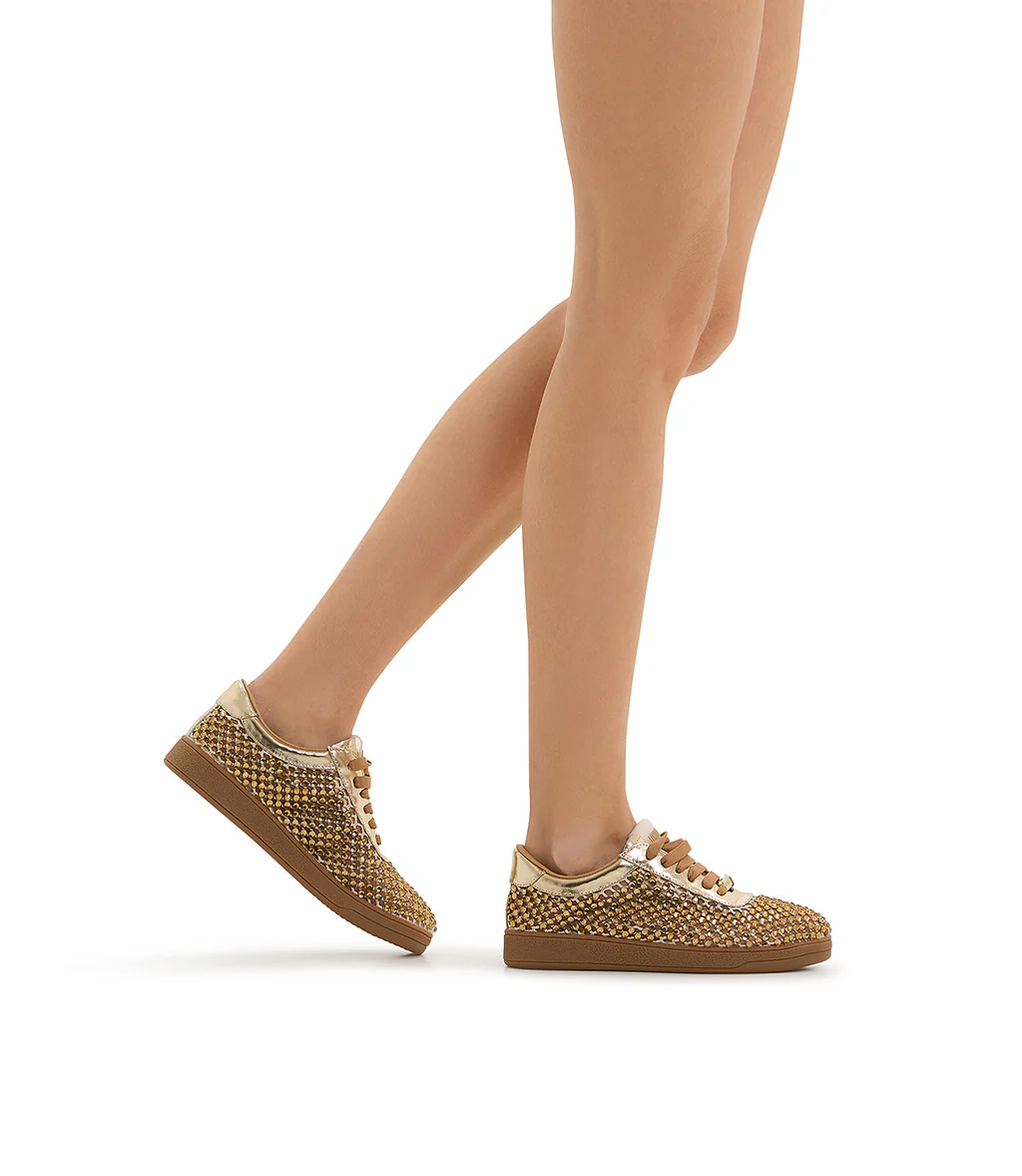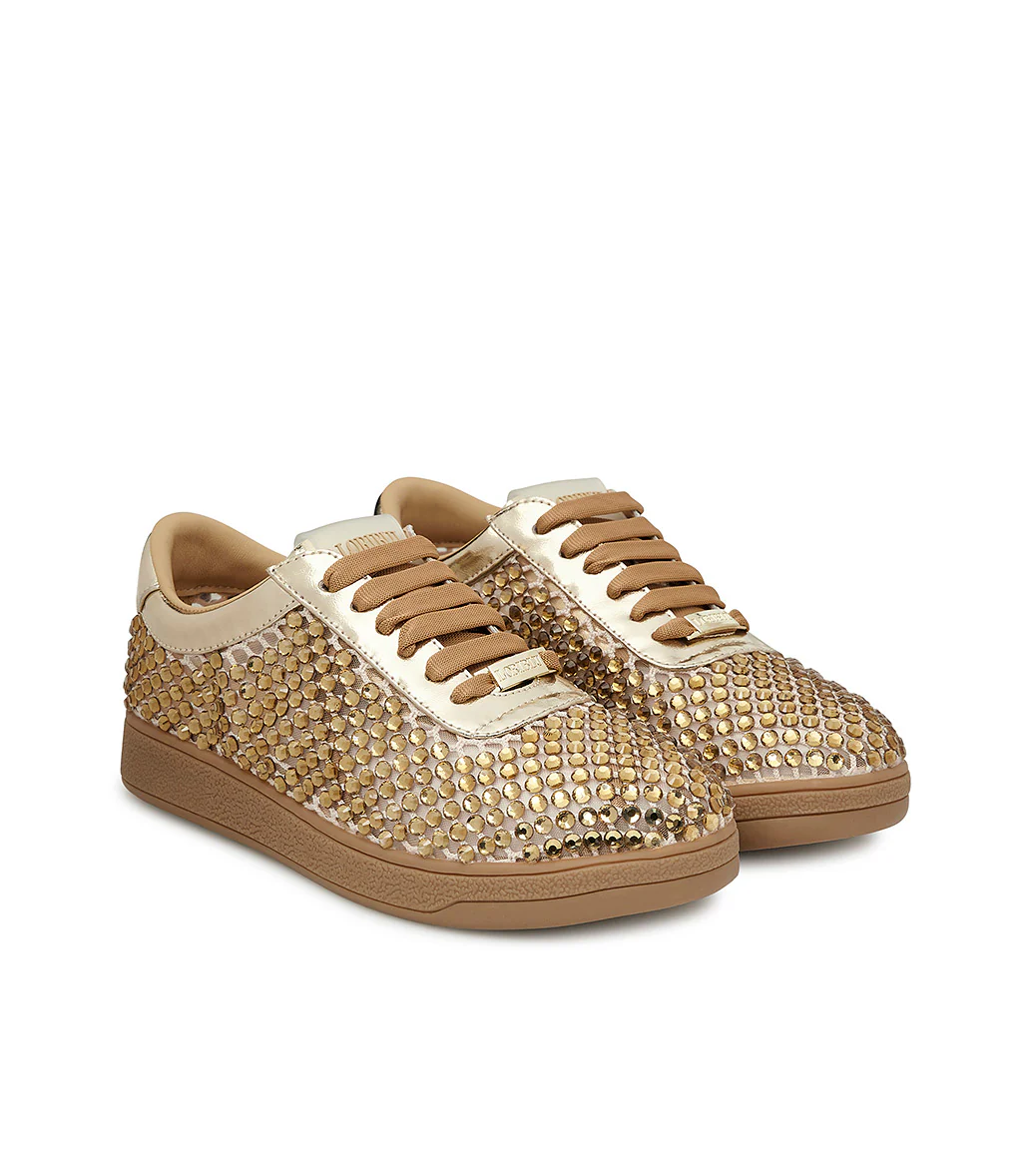 Un mix di luminosità e comfort, le nuove sneakers firmate Loriblu sono l’accessorio perfetto per la tua estate. Realizzate in camoscio color oro laminato, sono interamente impreziosite da una pioggia di cristalli tono su tono. Un modello perfetto per giocare con i look casual della nuova stagione. Suola platform in gomma.