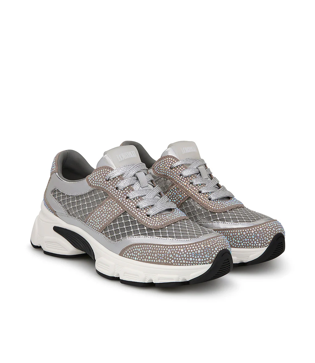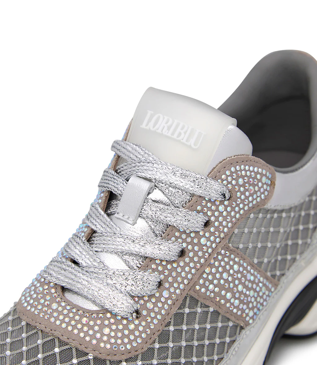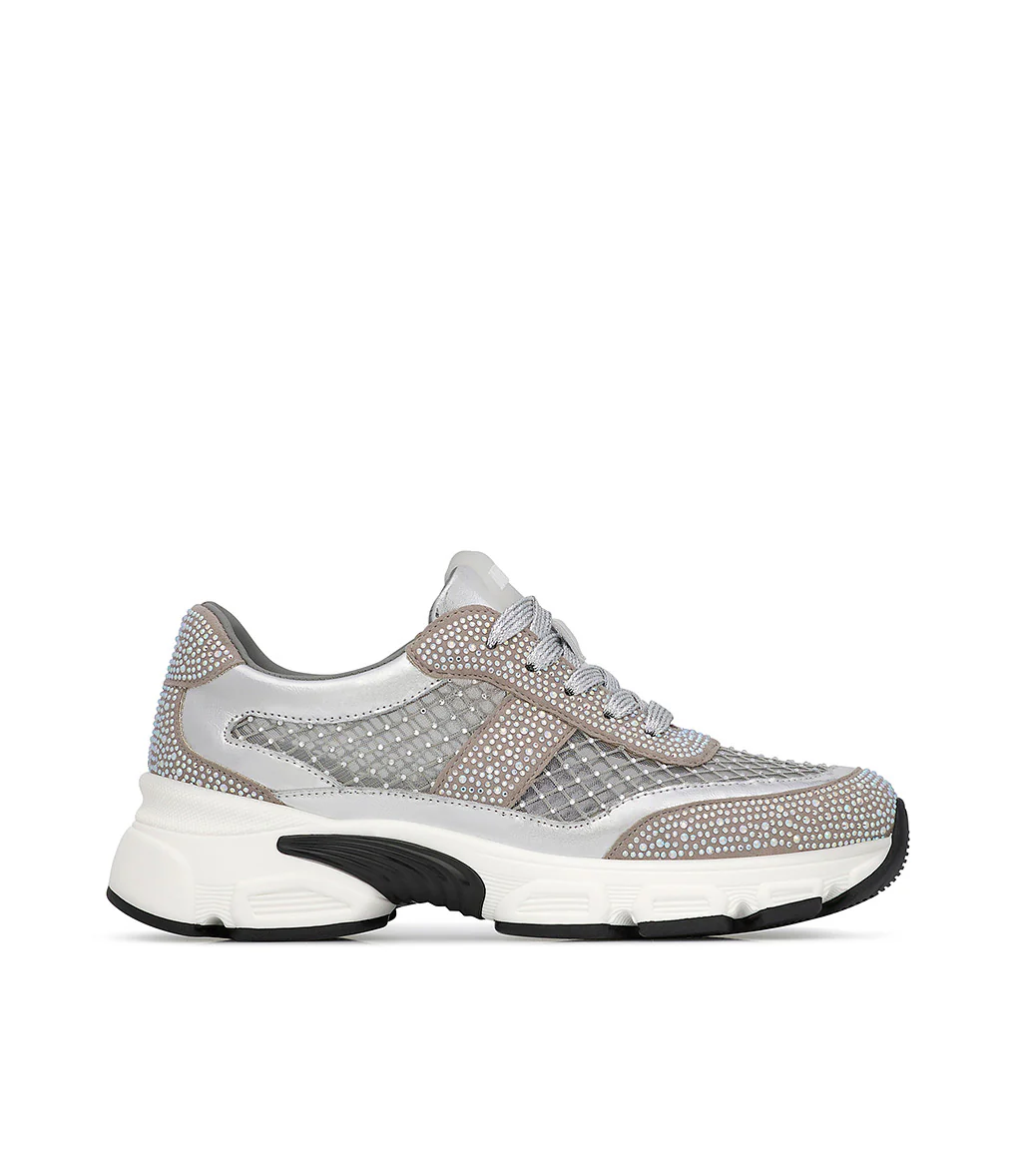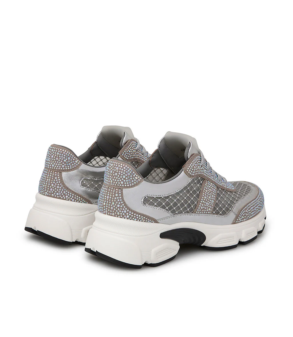 Carattere sporty-chic per le nostre sneaker della nuova collezione Realizzate in Italia in pregiato vitello argento, si contraddistinguono per lo scintillio dei cristalli tono su tono e per i delicati inserti in rete anch’essi impreziositi da microcristalli dalle sfumature cangianti. La suola chunky in gomma bianca si abbina perfettamente con il design.