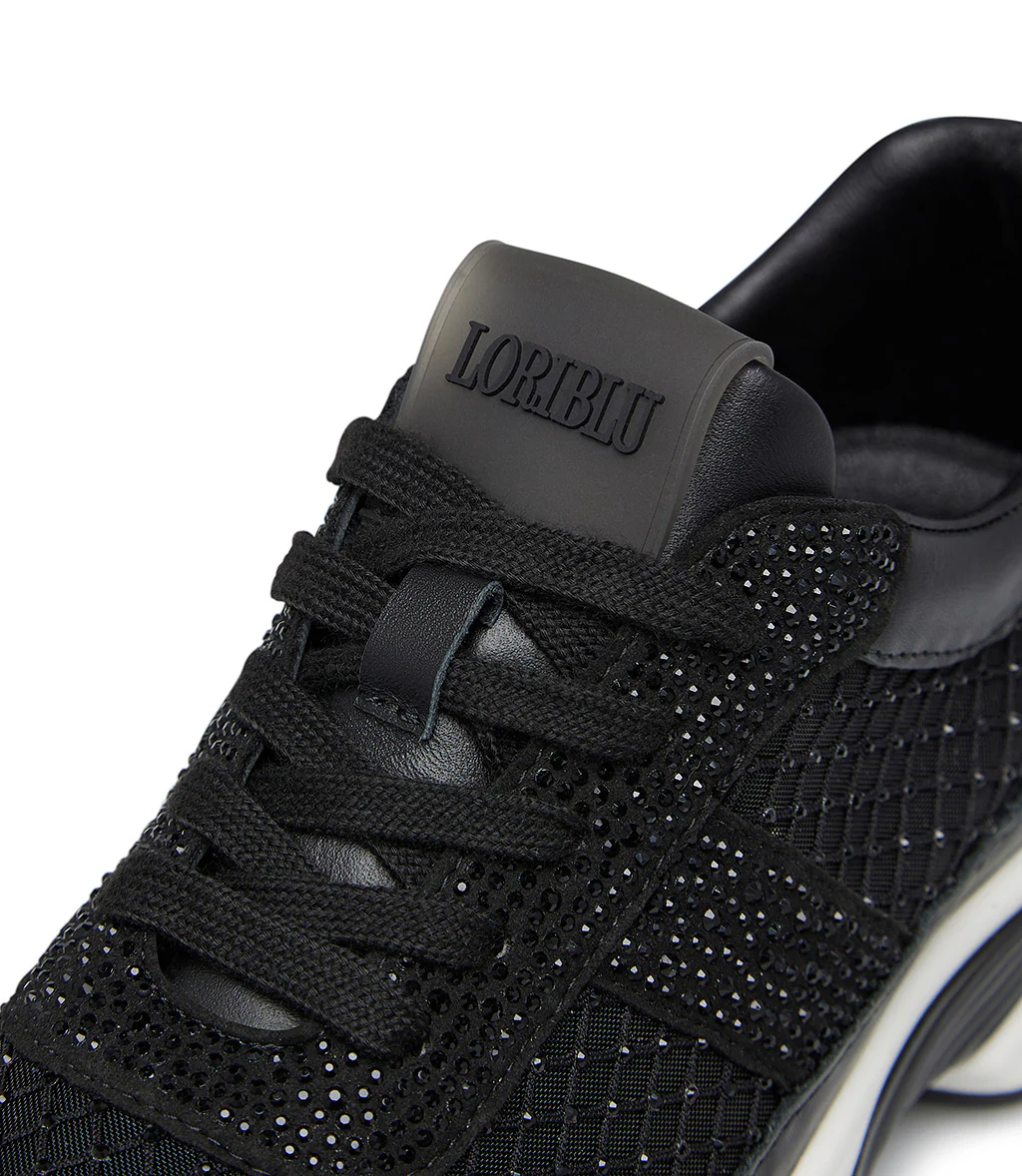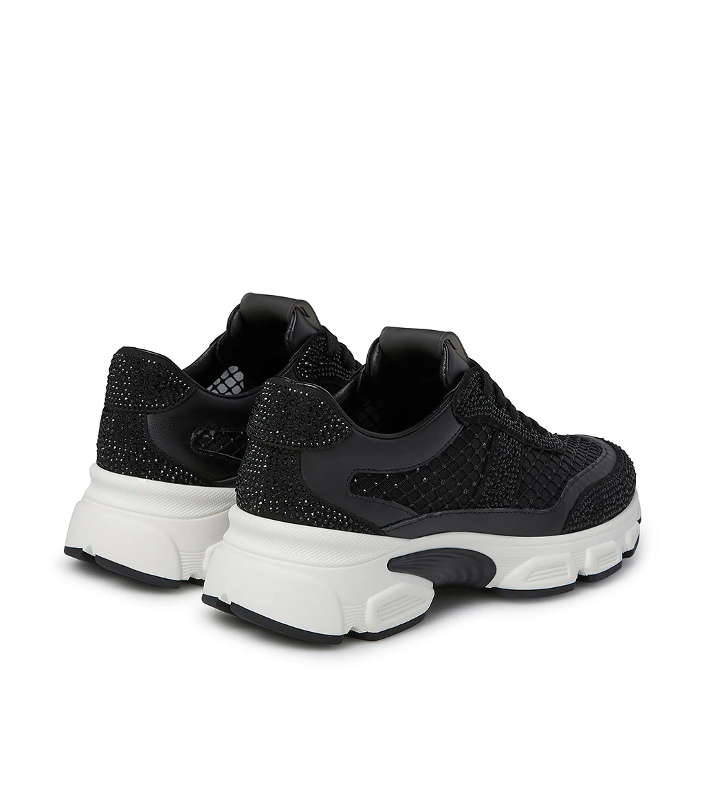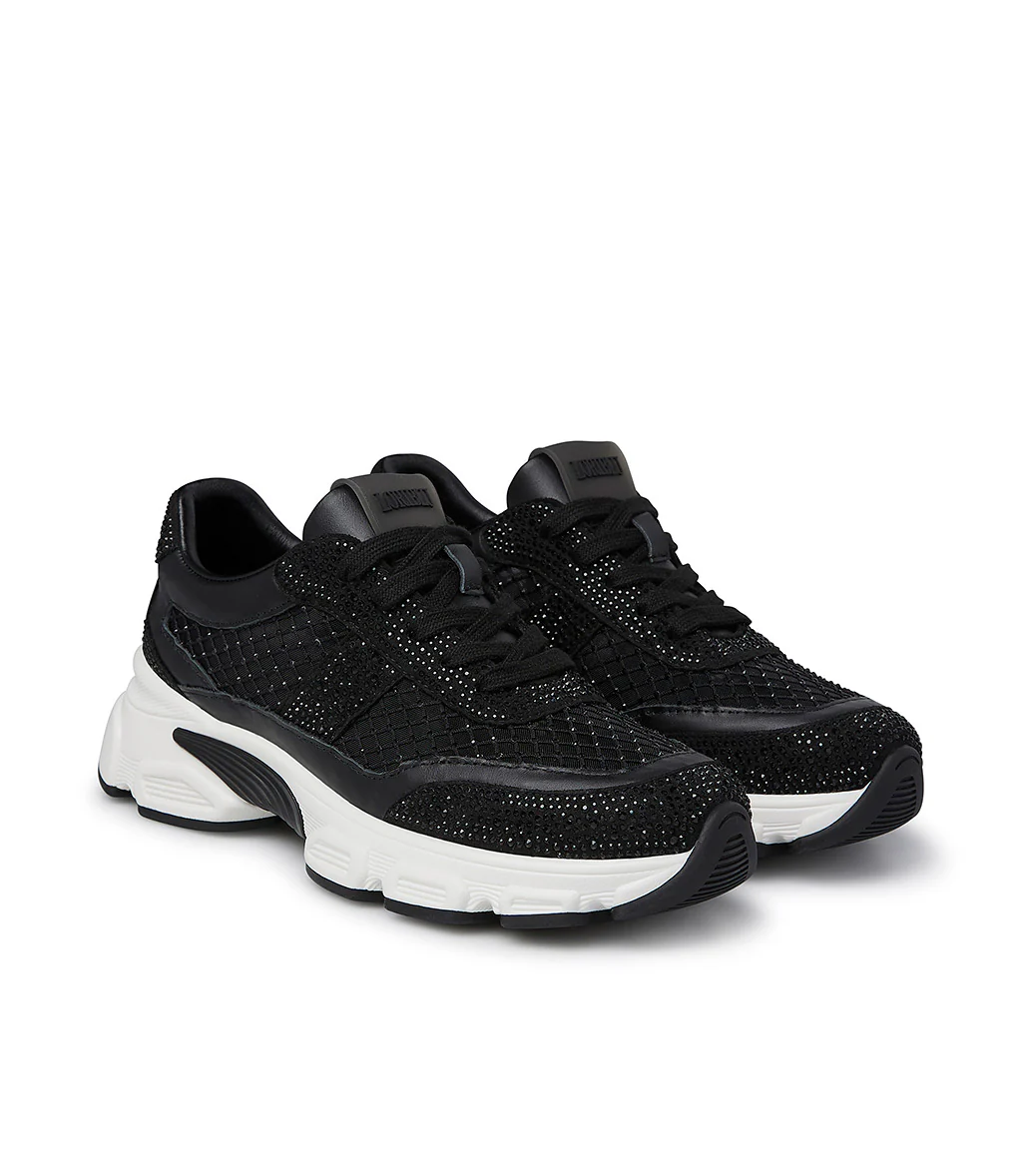 Carattere sporty-chic per le nostre sneaker della nuova collezione Realizzate in Italia in pregiato vitello nero, si contraddistinguono per lo scintillio dei cristalli tono su tono e per i delicati inserti in rete anch’essi impreziositi da micro cristalli dalle sfumature cangianti. La suola chunky in gomma bianca si abbina perfettamente con il design.