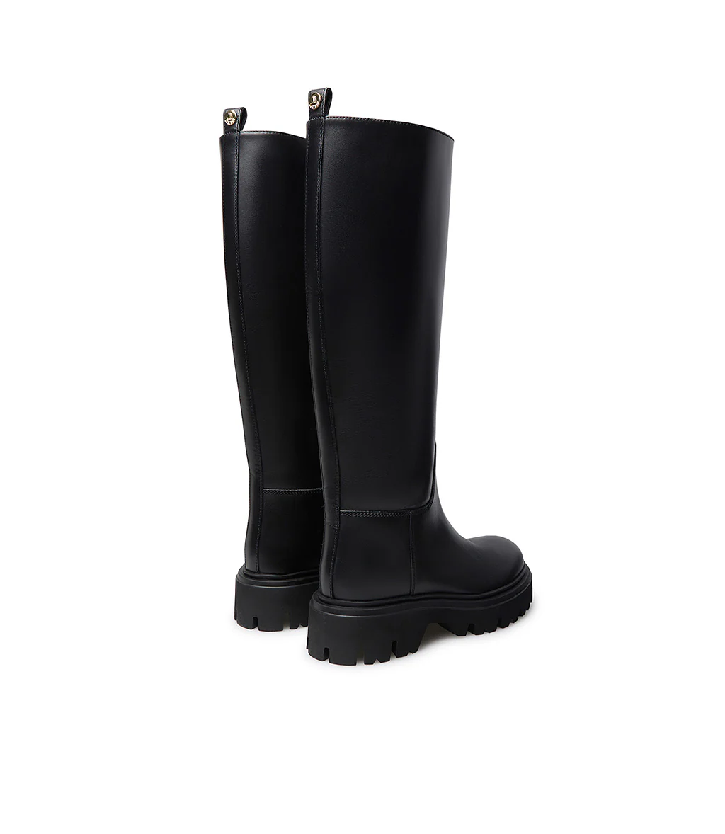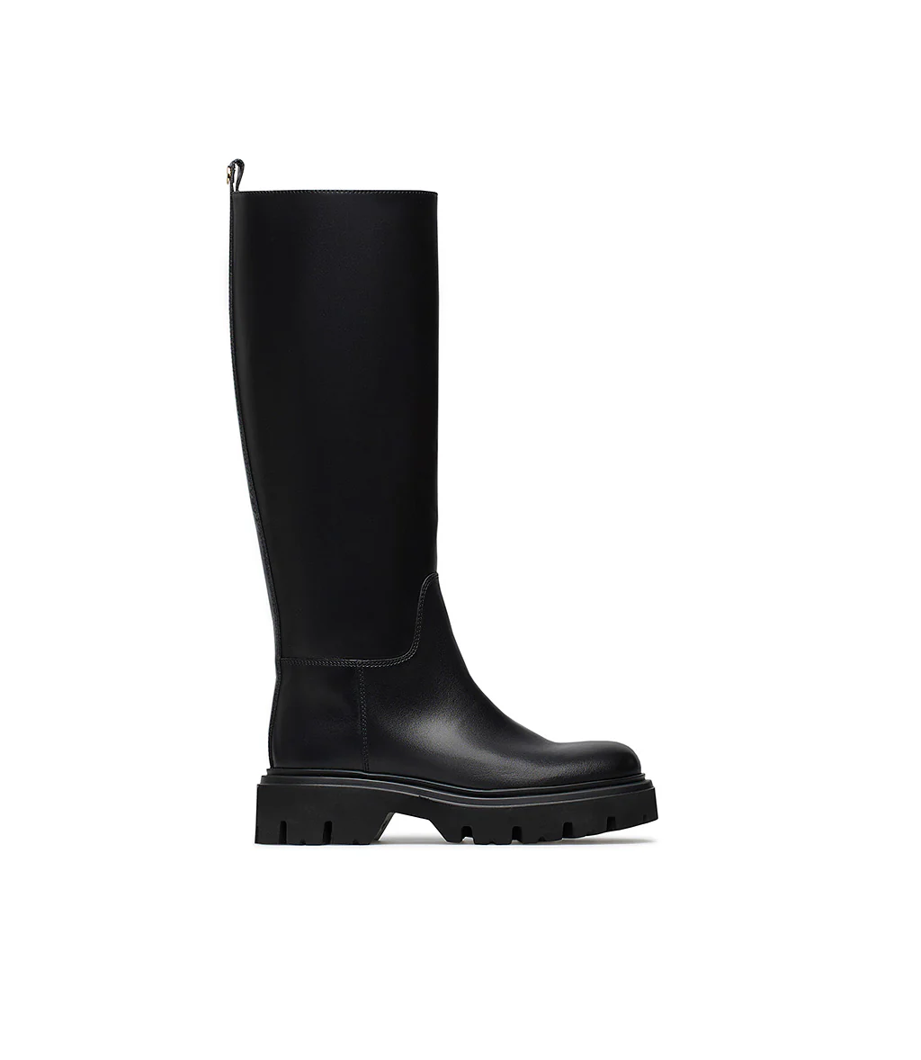Comodi e grintosi, questi stivali stile cavallerizzo della nostra nuova collezione Autunno-Inverno, sono perfetti per aggiungere un tocco rock ai tuoi outfits quotidiani. Sono realizzati in Italia in vitello nero e presentano punta a mandorla arrotondata, suola in gomma carrarmato. Indossali con un abito in chiffon e una giacca in pelle.