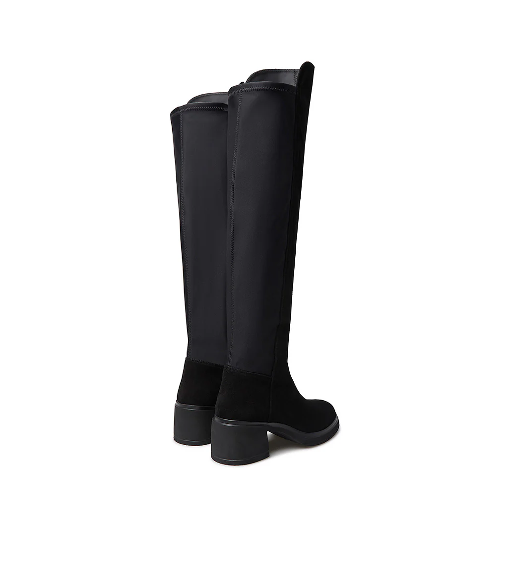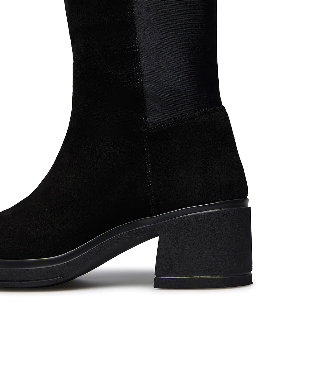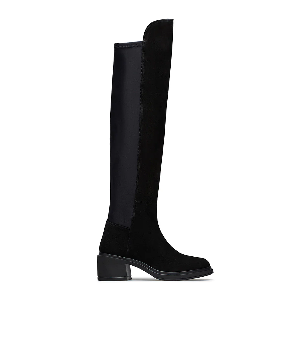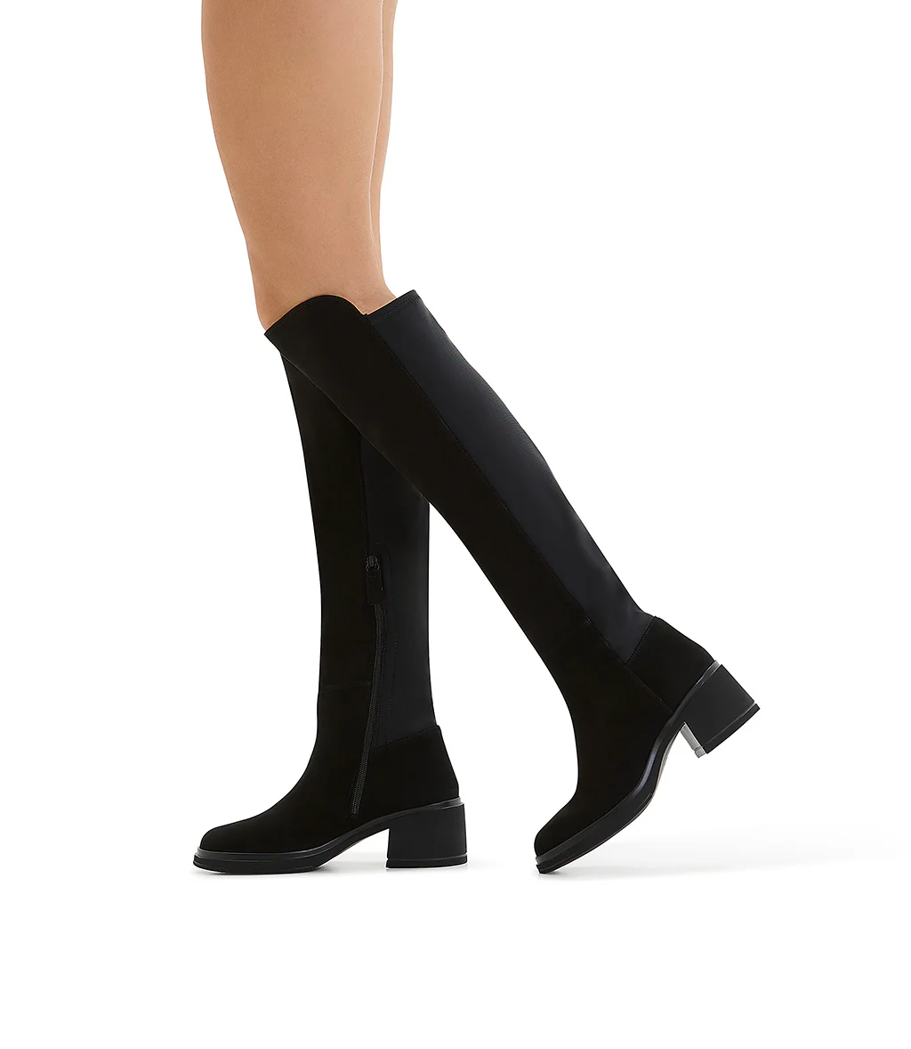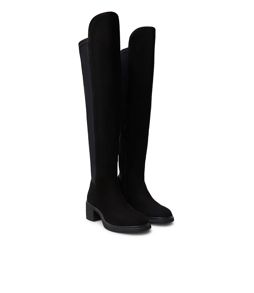 I nostri esclusivi cuissardes uniscono alla perfezione comfort ed eleganza. Sono realizzati in Italia in morbida pelle scamosciata nera e presentano una punta affusolata,presentano una punta arrotondata, pannello frontale con bordo più alto arrotondato, retro in morbido tessuto stretch, suola in gomma con tacco a blocco leggermente svasato. Mettili in risalto con una mini o con un paio di leggings a stampa.