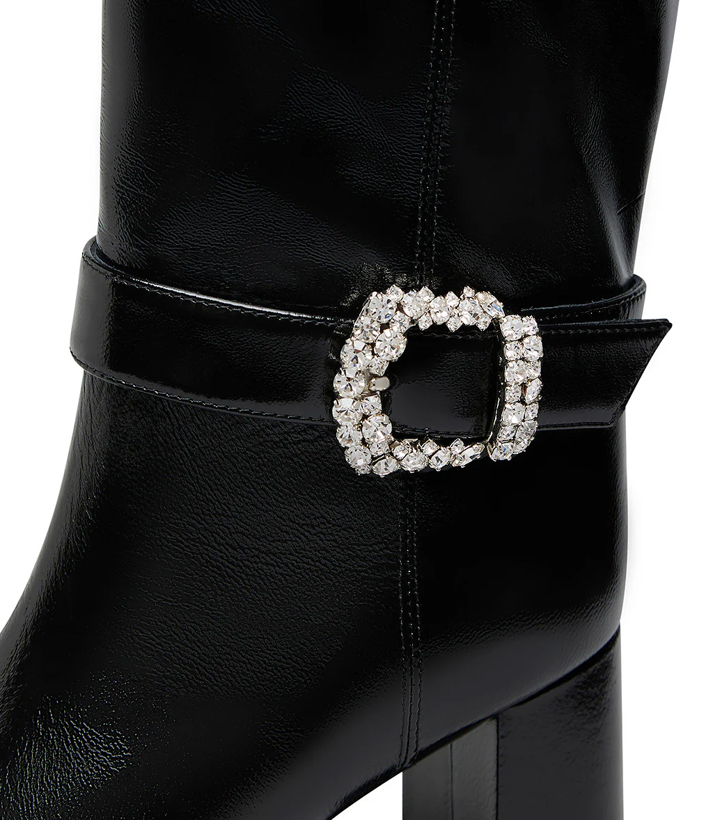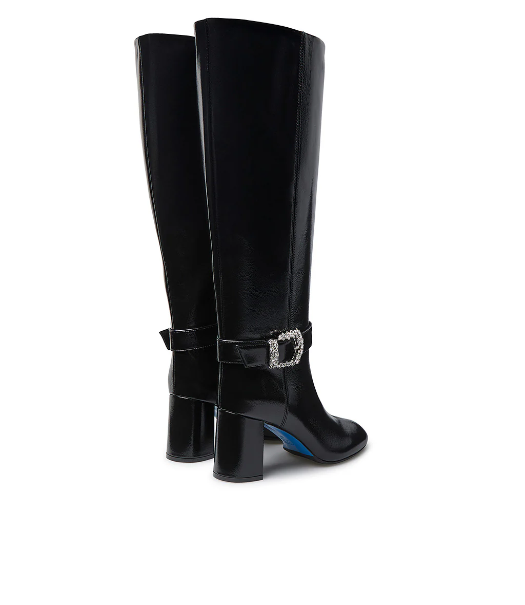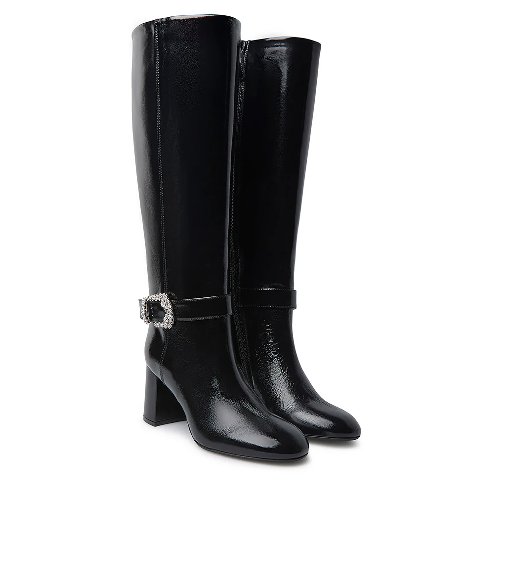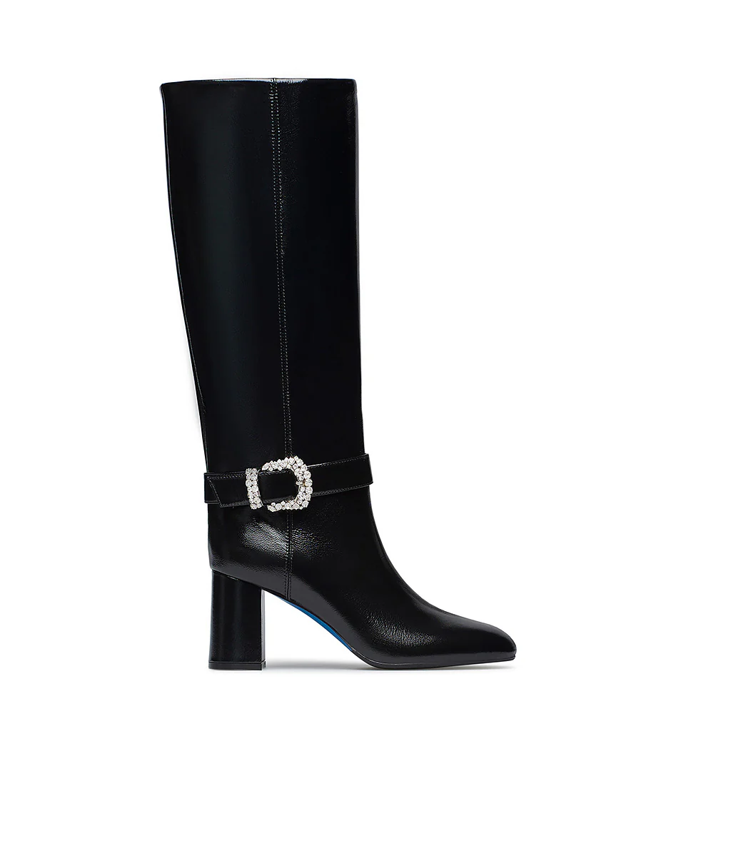 Realizzati in Italia in pelle lucida nero, i nostri stivali spiccano grazie alla fibbia metallo dorato con cristalli sul cinturino alla caviglia. Rivelano una punta a mandorla, chiusura con zip, tacco a blocco e la nostra iconica suola in cuoio blu. Indossali da mattino a sera con i tuoi nuovi outfits della stagione fredda.