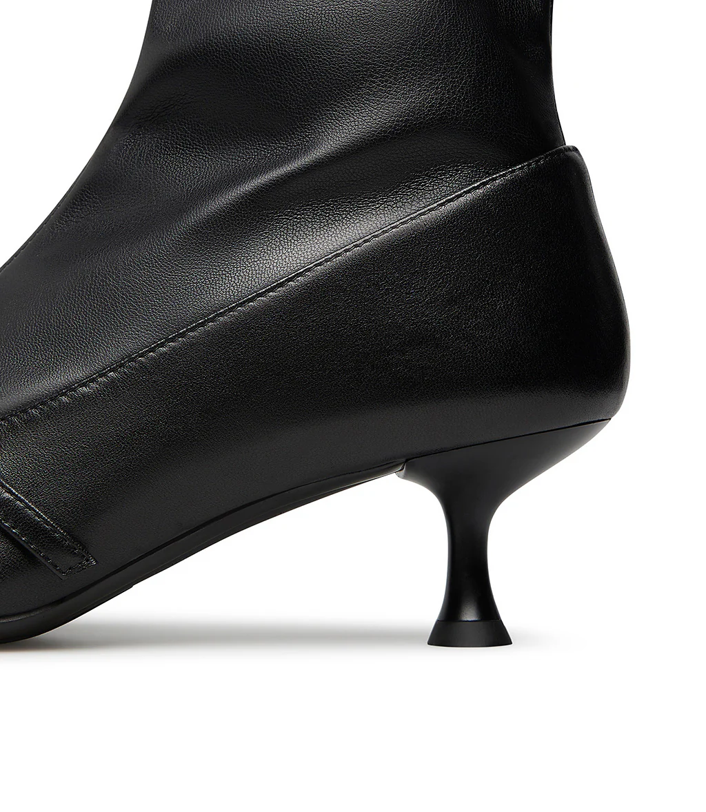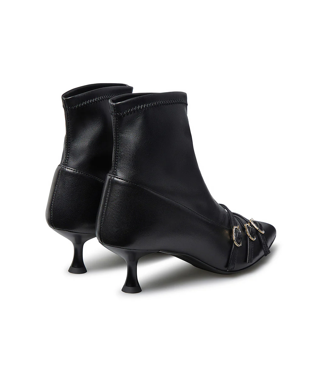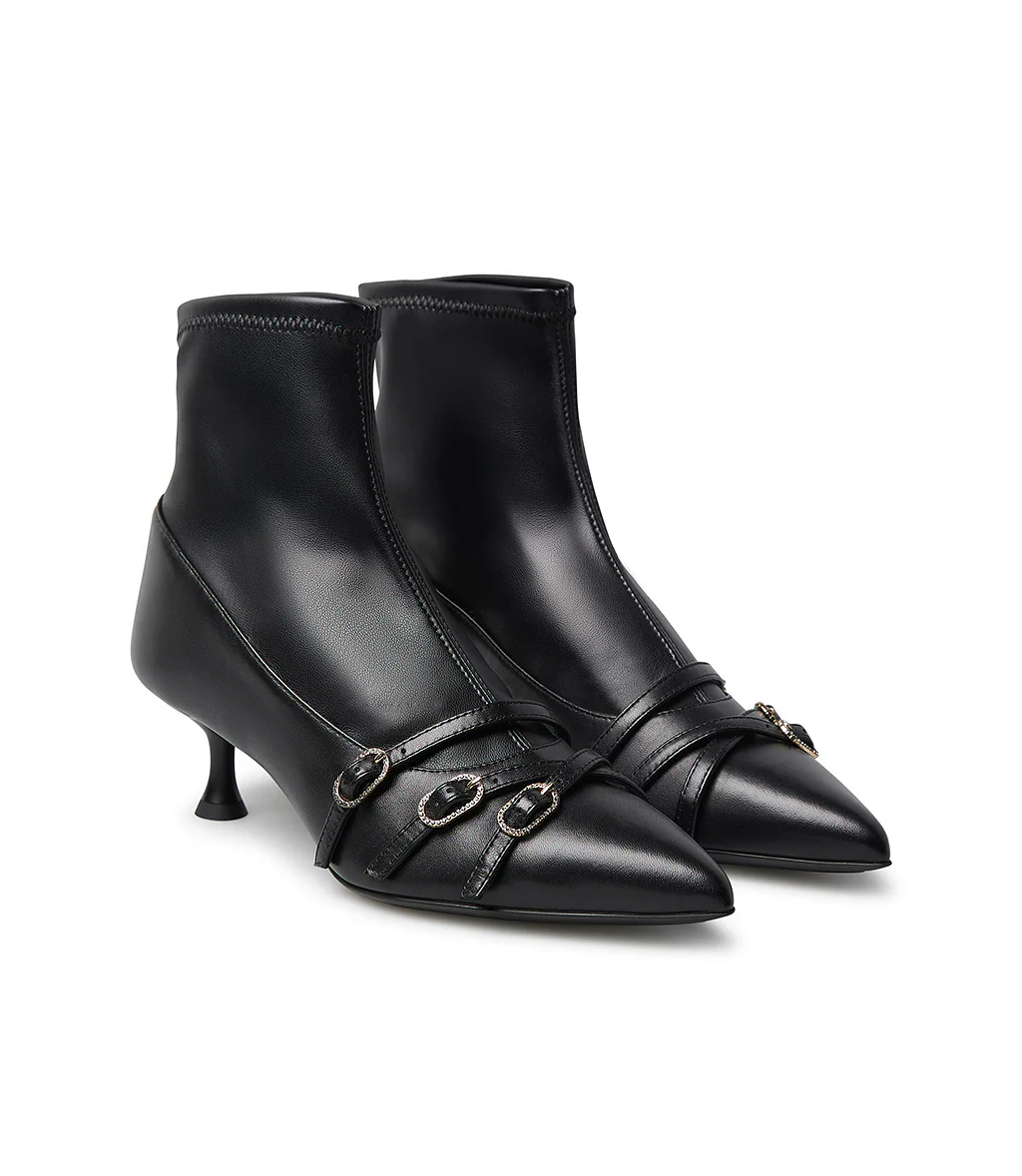 Questo nuovo stivaletto Loriblu unisce sensualità e raffinatezza in un unico modello. Realizzato in nappa nera liscia con inserto elastico effetto calza, avvolge il piede e la caviglia con una linea affusolata ed estremamente femminile. Il design è impreziosito da tre cinturini sottili con fibbie gioiello dorate e cristalli che aggiungono un tocco brillante e distintivo. Il tacco a stiletto slancia la figura con eleganza, rendendo questa scarpa ideale per ogni evento e serate glamour.