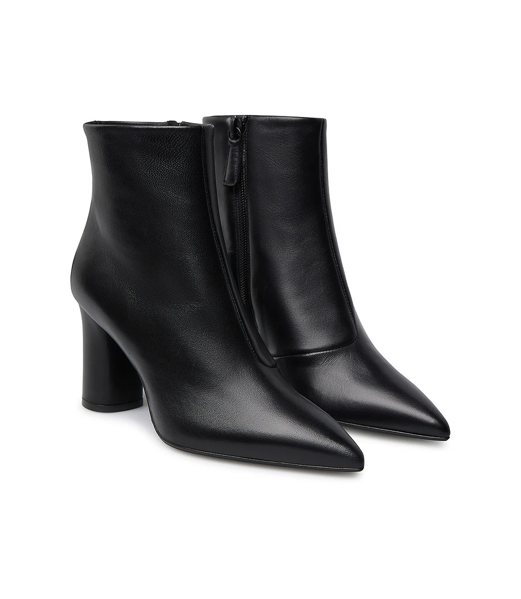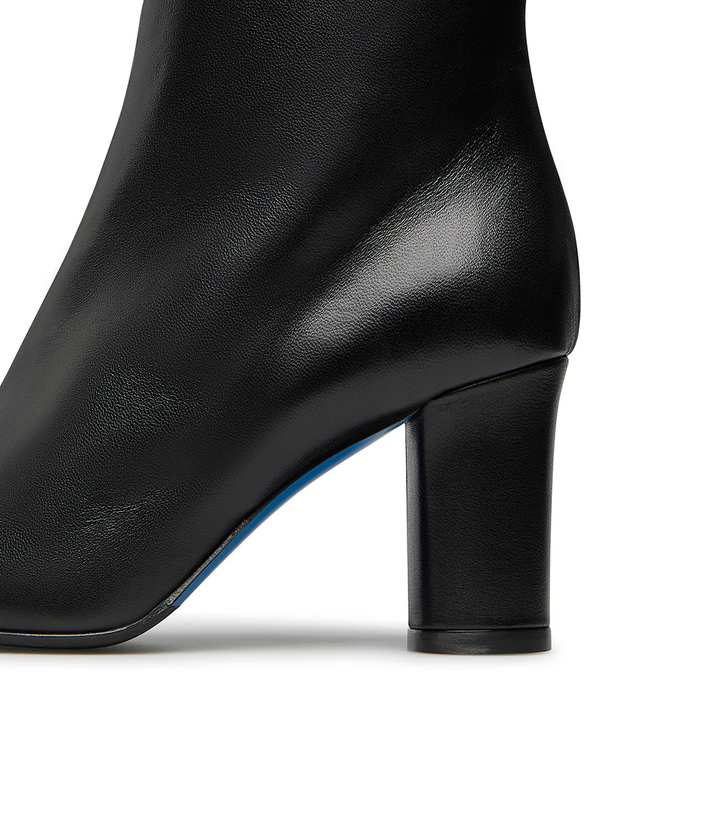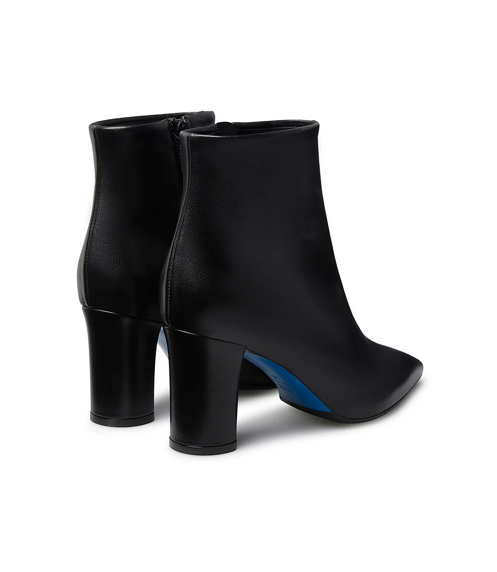 Realizzati in Italia in morbida nappa nera, i nostri stivaletti presentano un’elegante silhouette con punta affusolata, chiusura laterale con zip, iconica suola in cuoio blu e tacco alto a blocco. Perfetti da abbinare agli outfits giornalieri della stagione
