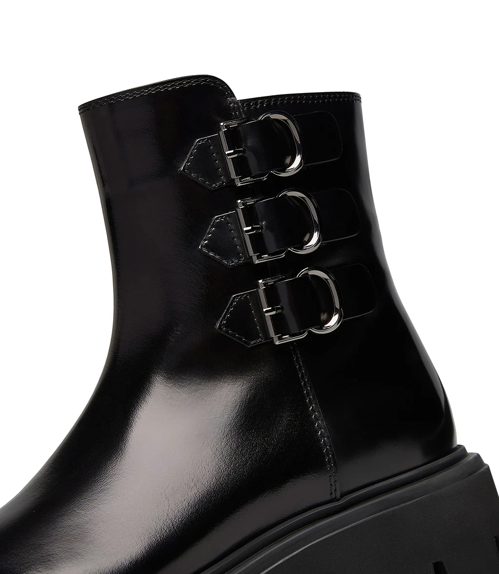 Grintosi e audaci, i nostri stivaletti in vitello nero spazzolato sono personalizzati da cinturini con fibbie argentate e dalla suola chunky in gomma carrarmato. Realizzati interamente in Italia, presentano una punta arrotondata e una chiusura laterale con zip. Indossali con i tuoi outfits quotidiani della nuova stagione autunno-inverno