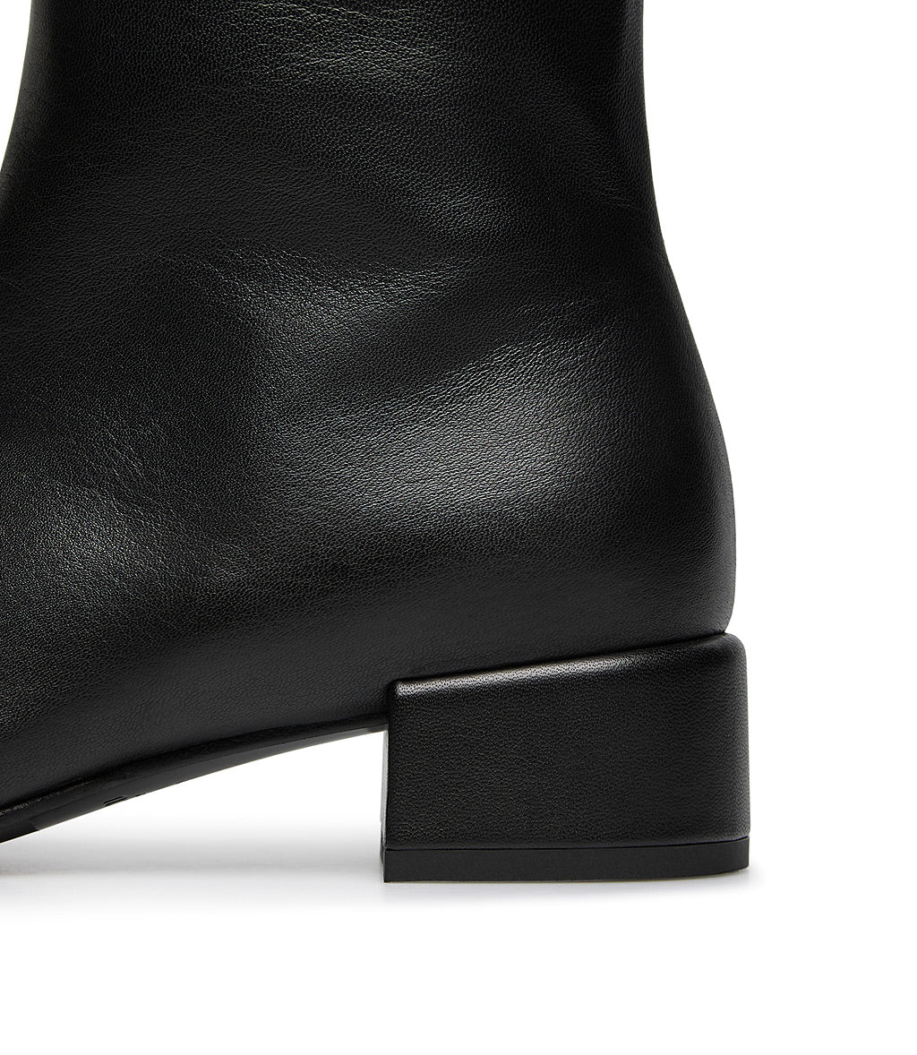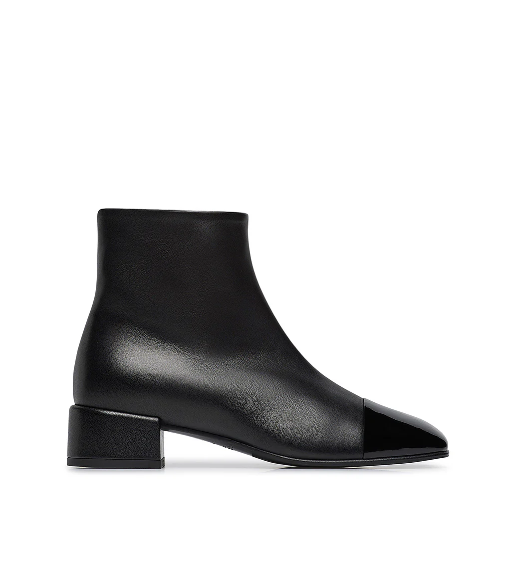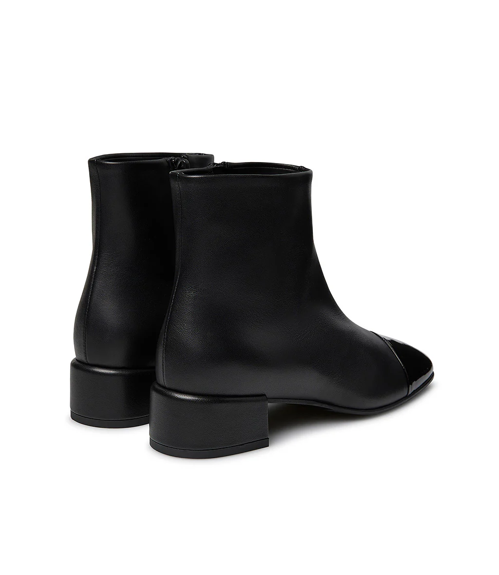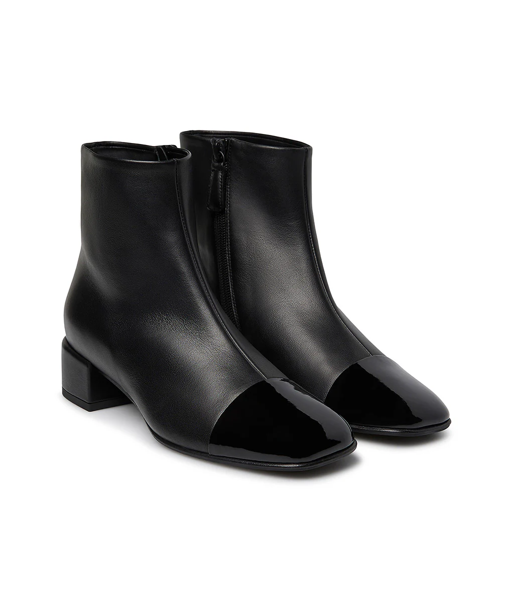 Realizzati con cura in Italia, presentano una silhouette contemporanea e confortevole con tacco basso di design, tomaia in morbida nappa nera, chiusura laterale con zip e dettaglio a contrasto in vernice nera sulla punta arrotondata. Estremamente versatile da indossare tutti i giorni con gli outfit preferiti.
