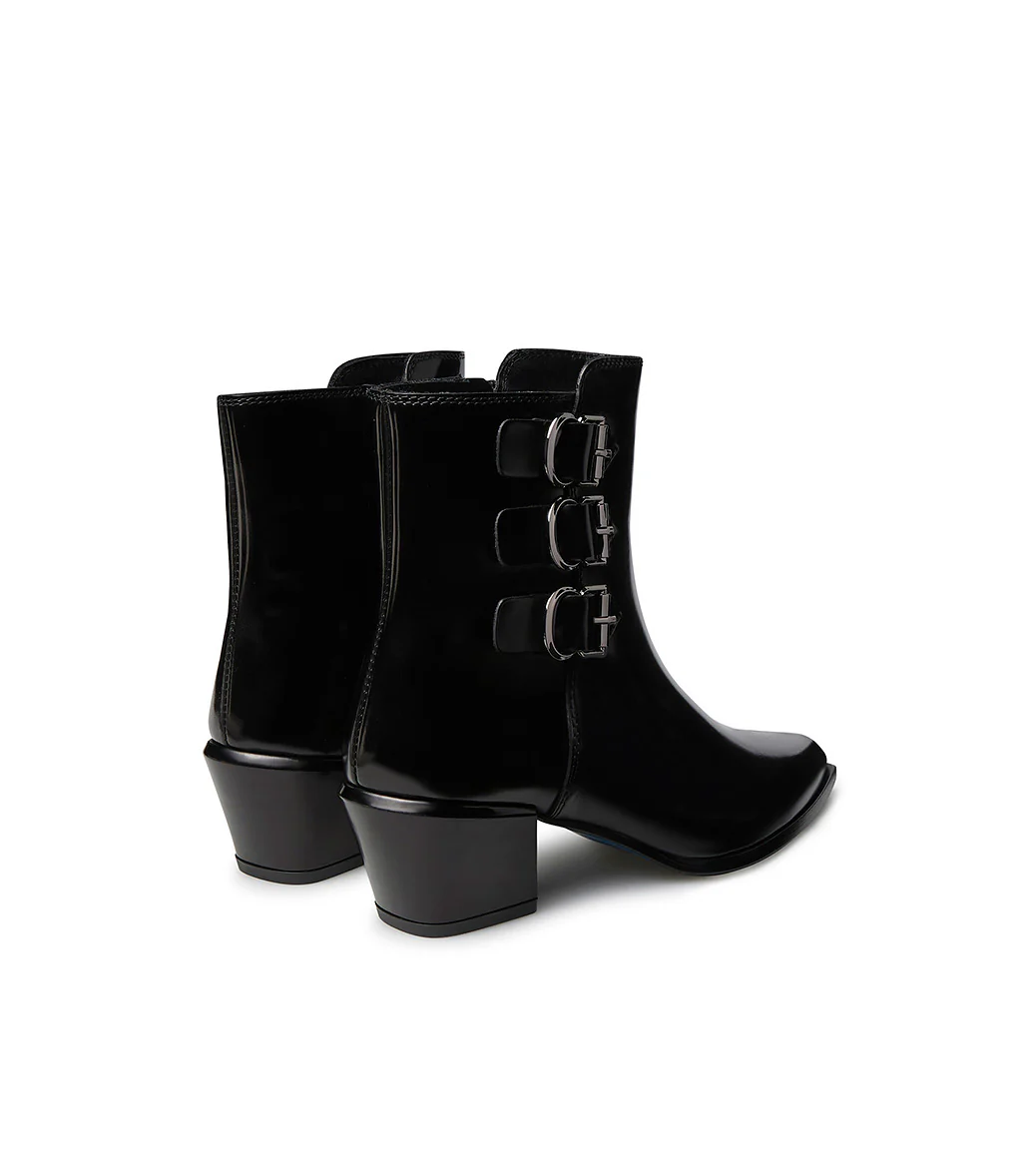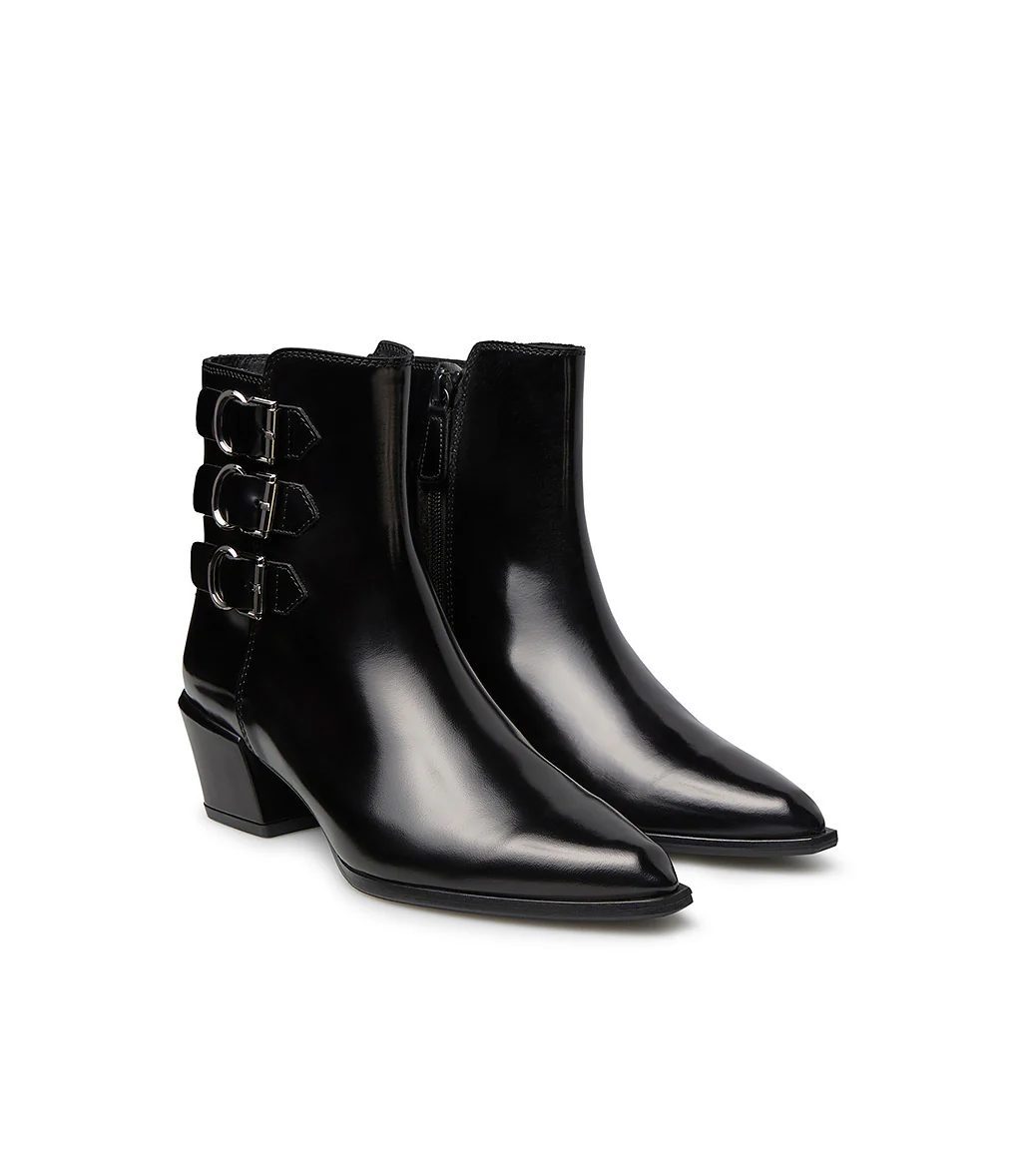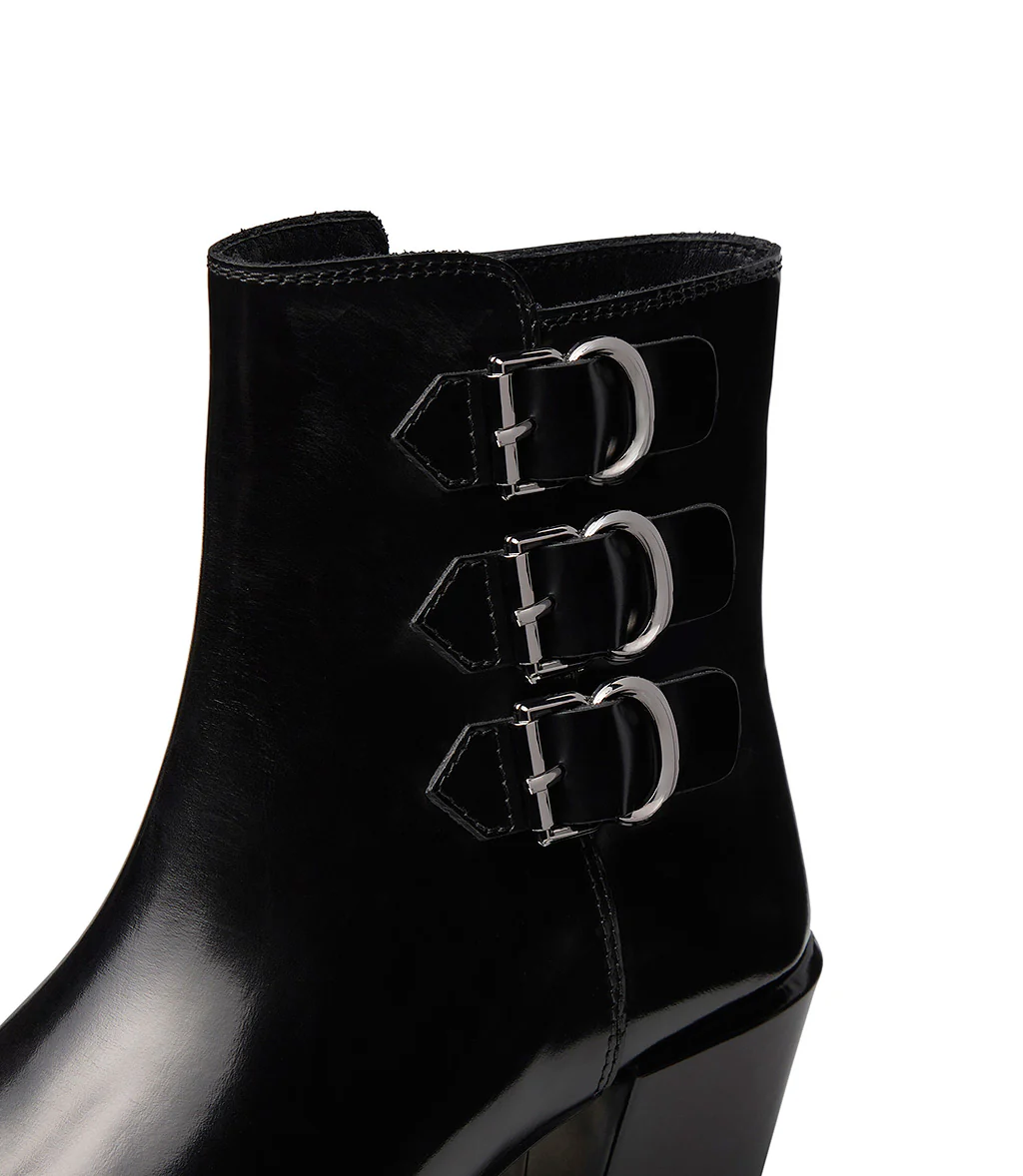 Perfetti per questa stagione autunno-inverno, i nostri stivaletti texani sono la combinazione perfetta tra uno stile elegante e contemporaneo. Realizzati in vitello nero spazzolato rivelano una zip laterale e tre cinturini ognuno completati con fibbie metalliche che assicurano praticità e comfort senza rinunciare allo stile. La punta sfilata e il tacco comodo esaltano il loro stile grintoso. Rigorosamente made in Italy, questi stivaletti sono ideali da abbinare a qualsiasi outfit.