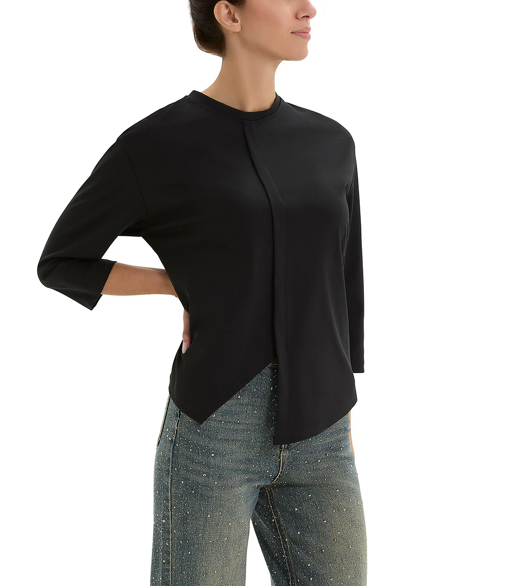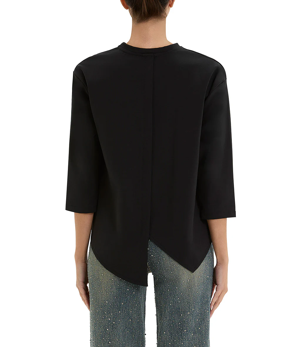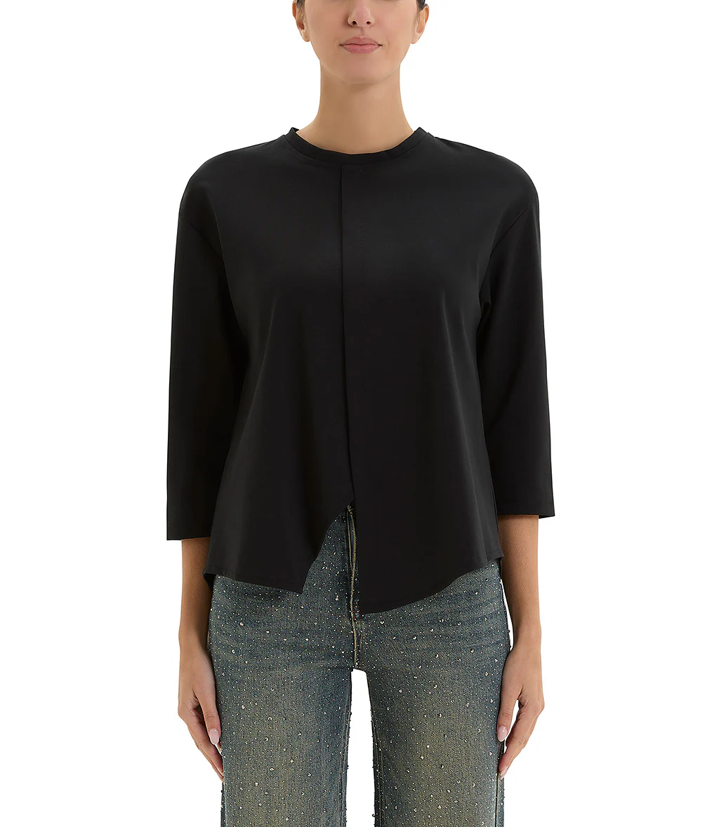 T- shirt a manica lunga nero con il fondo asimmetrico e girocollo rifinito con un bordo sottile. Il dietro presenta un fondo leggermente stondato e più lungo.