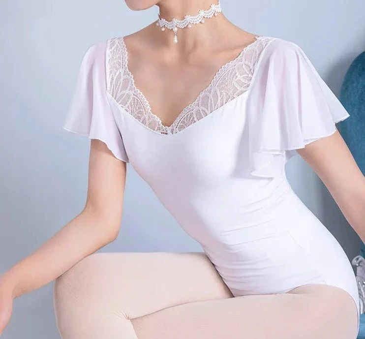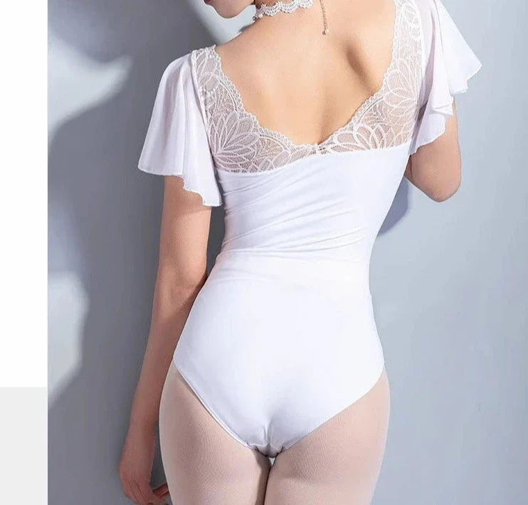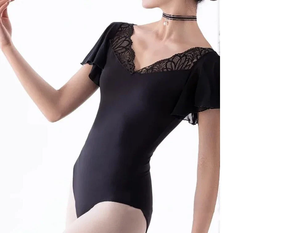 This elegant leotard features a lace neckline, and flutter sleeves that give it a soft and sophisticated look. Lycra, Polyester, Spandex. Imported. Choker not included.