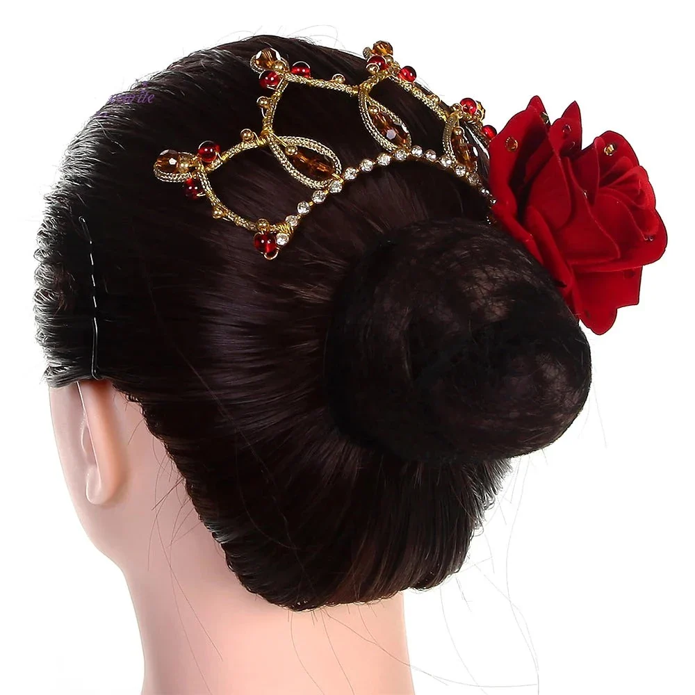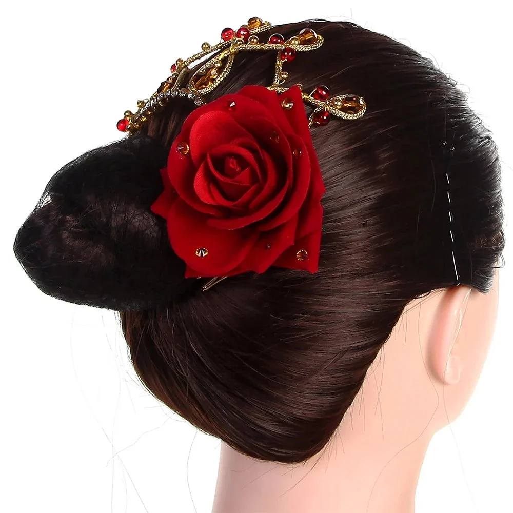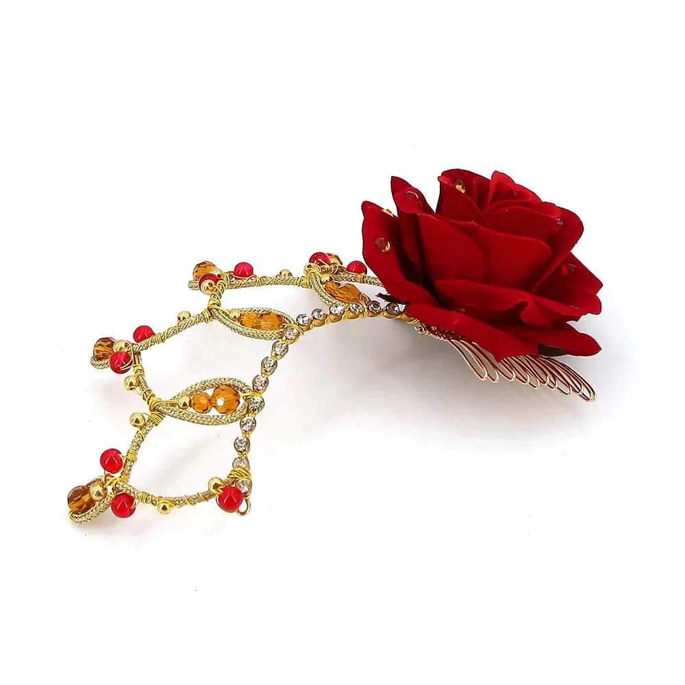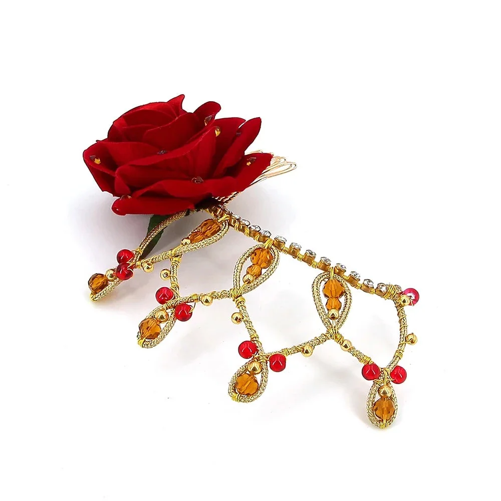 Pretty crystals and an artifical rose lend flair to this pretty red flower headpiece.