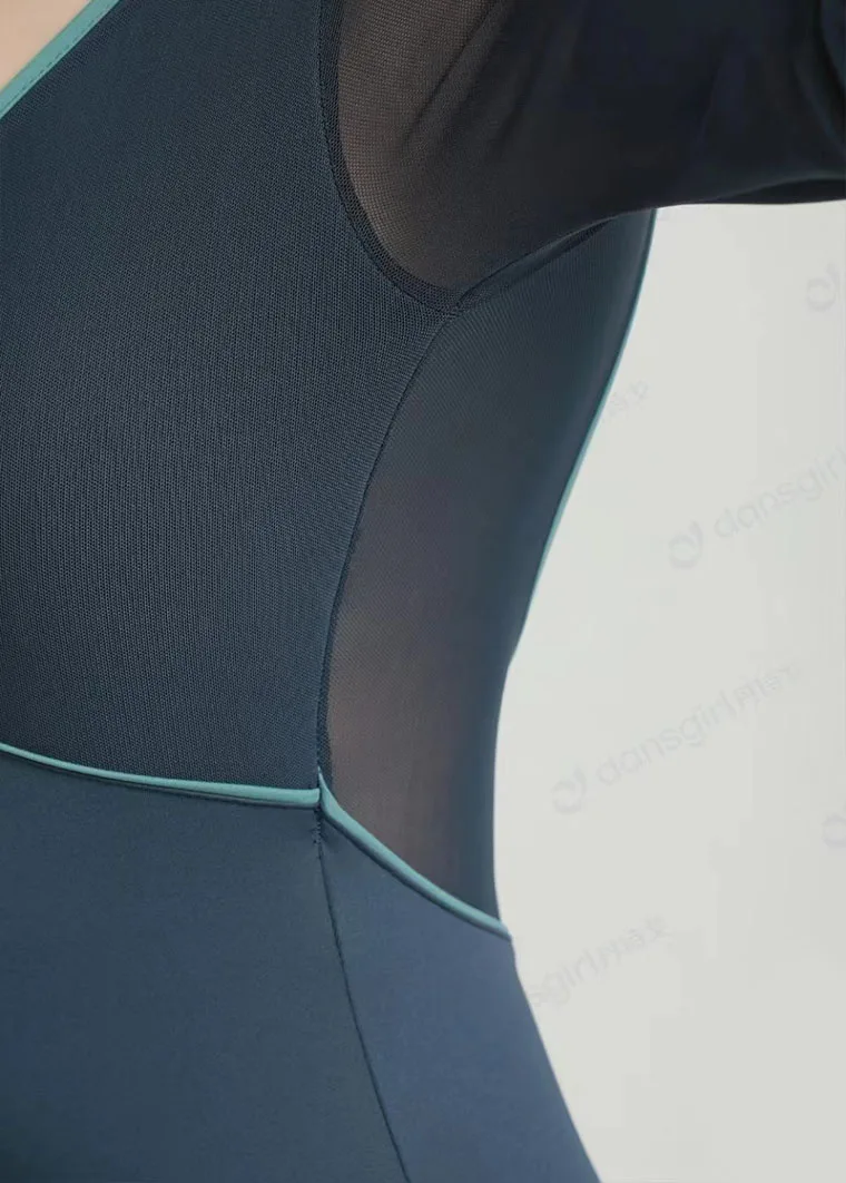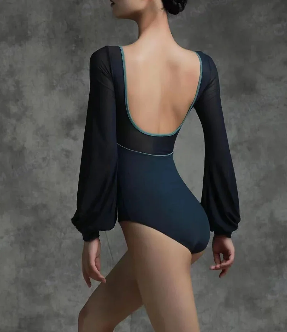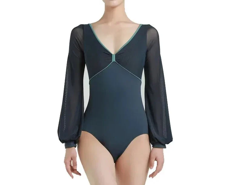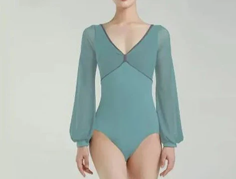 This attractive long sleeve leotard features a pinched v -neck and mesh lantern sleeves. Lycra. Polyester, Imported