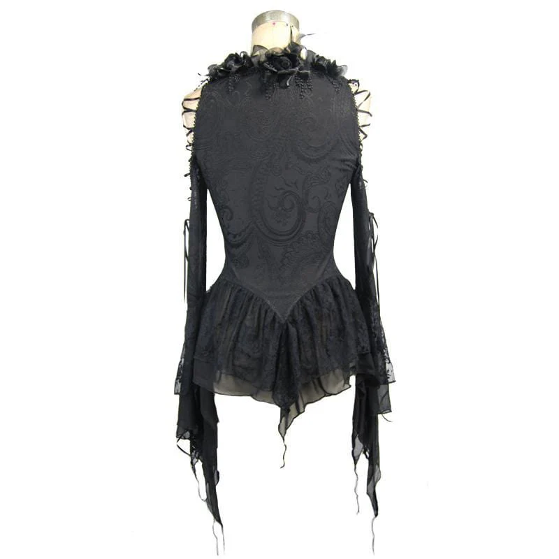 Descripton detailing Dettagli attenti e splendidi dettagli definiscono lo stile di questa camicetta. La parte superiore ha un profondo scollo a V che è tenuto insieme nella parte anteriore con allacciatura a nastro e bordato con delicati ricami e pizzo, nastro e rifiniture in piuma. Le maniche lunghe sono tagliate alle spalle esponendo le loro delicate curve. Le maniche lunghe a campana sono rastremate all’estremità e rifinite con volant.