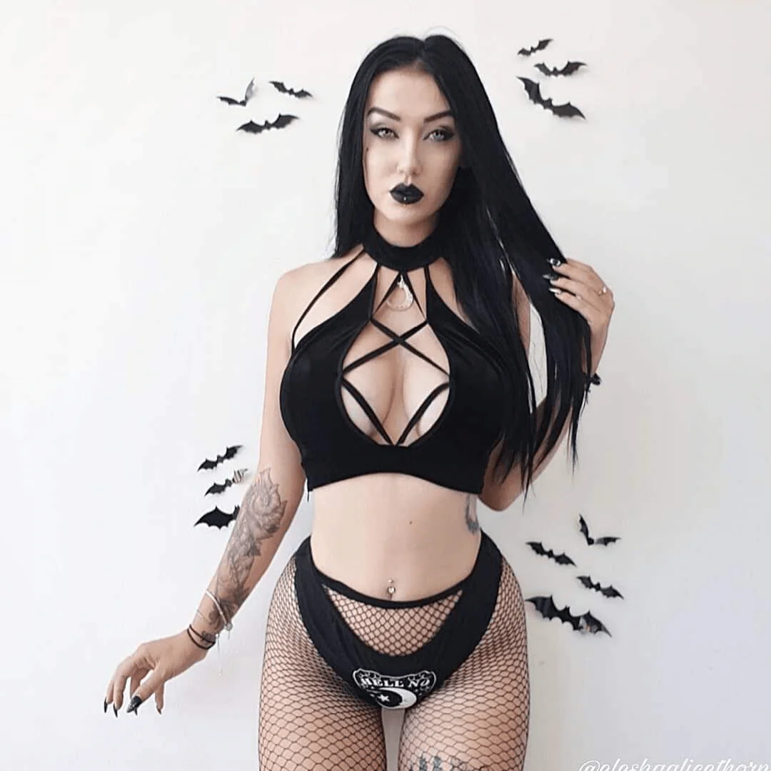 Descrizione: Il top corto ha tutti i segni punk. Lo scollo all’americana ha un profondo scollo che è tenuto insieme da spalline incrociate e un colletto a fascia che si adatta vicino al collo. La parte superiore della vita ha una falce di luna in filigrana che pende dalla gola.