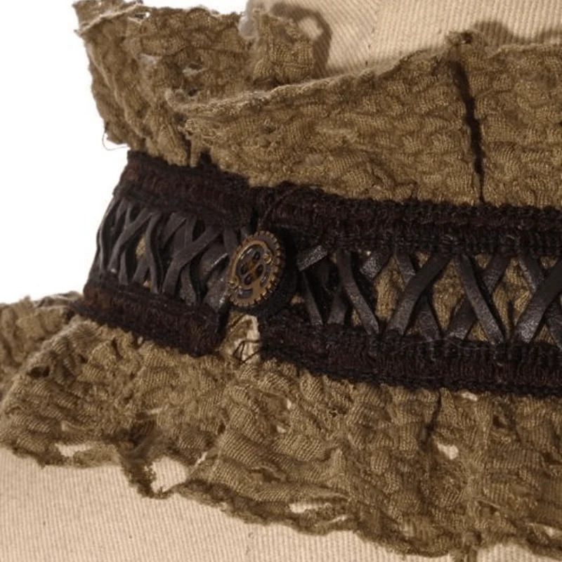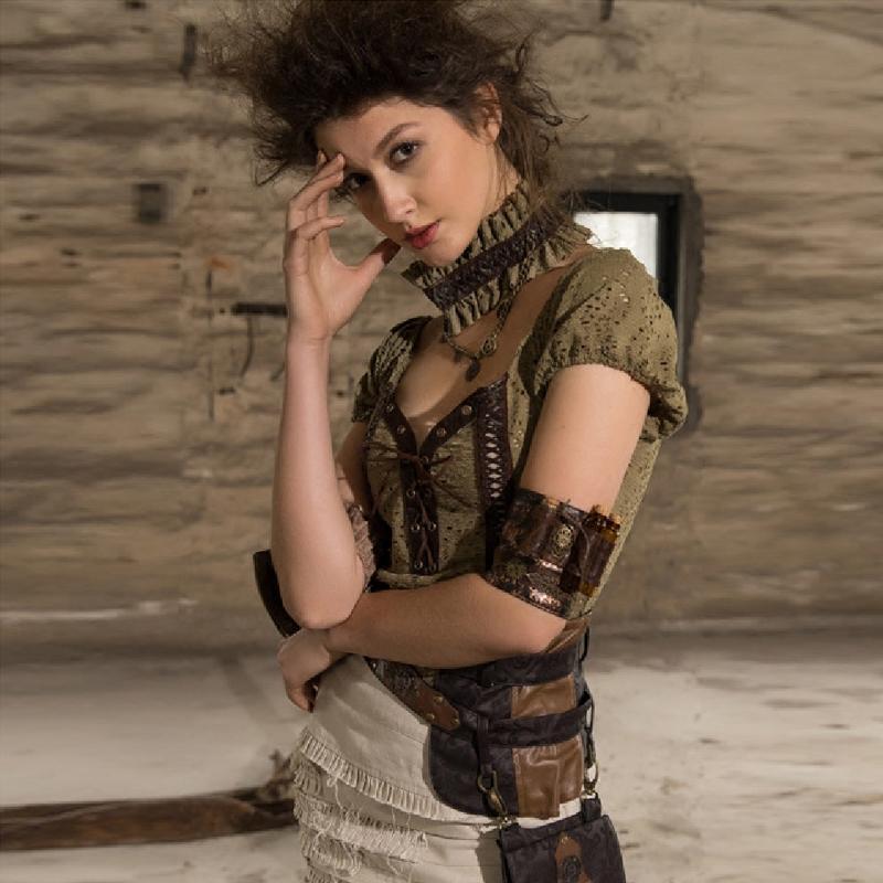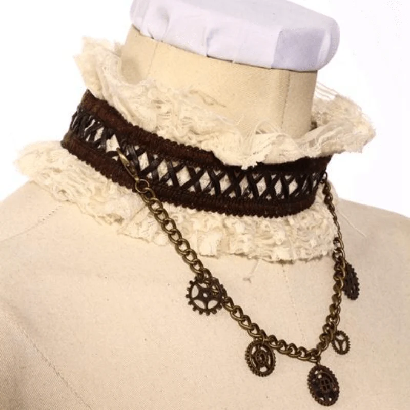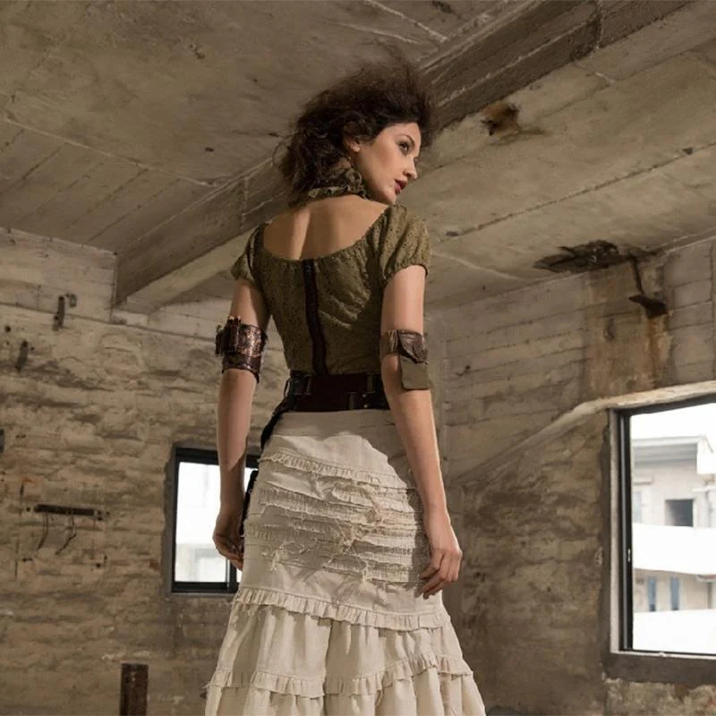 Descrizione: Top in pizzo interamente foderato con pizzo a contrasto e rifiniture in nastro sul davanti. La camicetta a maniche corte a sbuffo ha una scollatura a cuore con una mezza apertura nella parte anteriore che è assicurata da un anello di tenuta e una chiusura in pizzo. La camicetta presenta un collo in pizzo impreziosito da un ingranaggio in metallo e ornamento a catena.