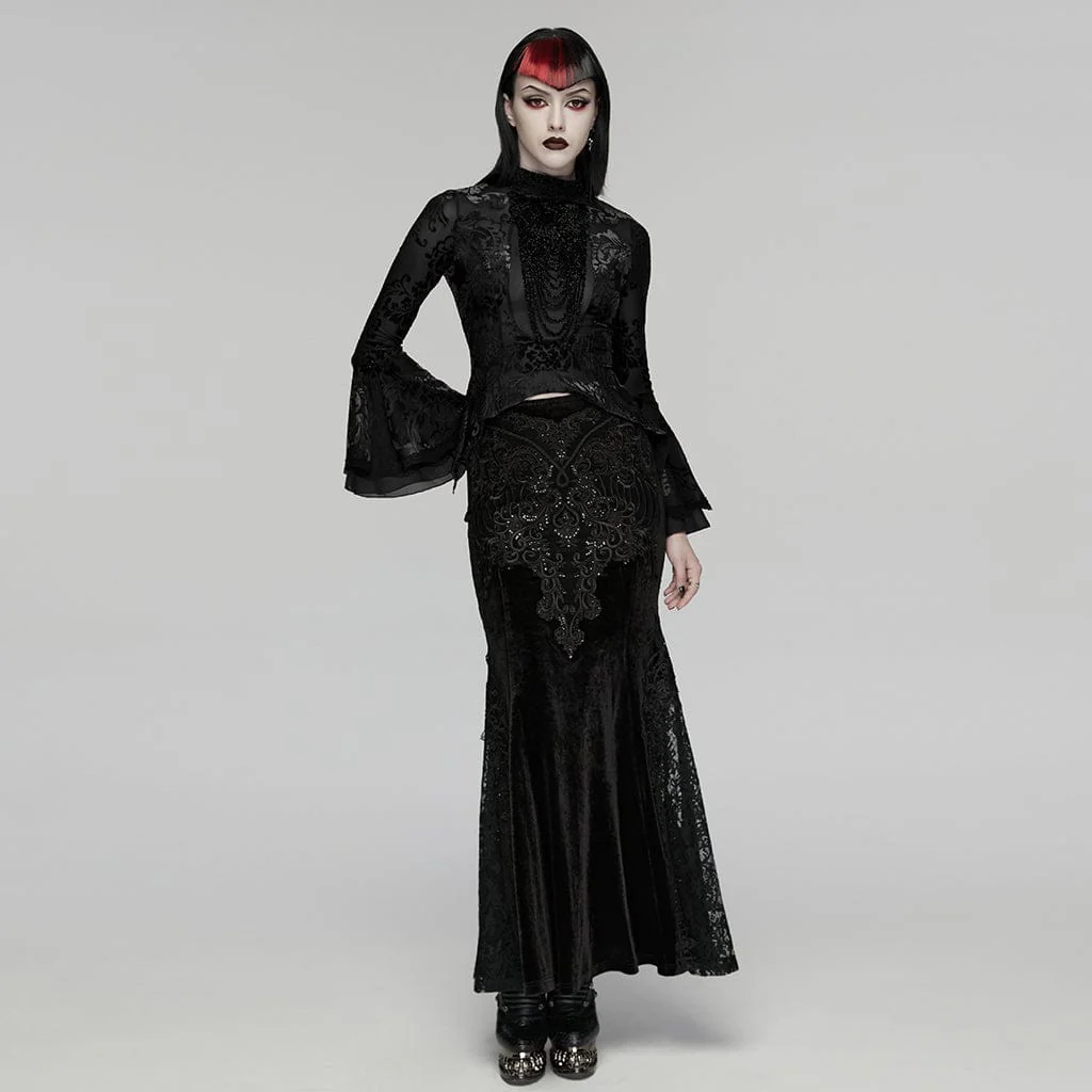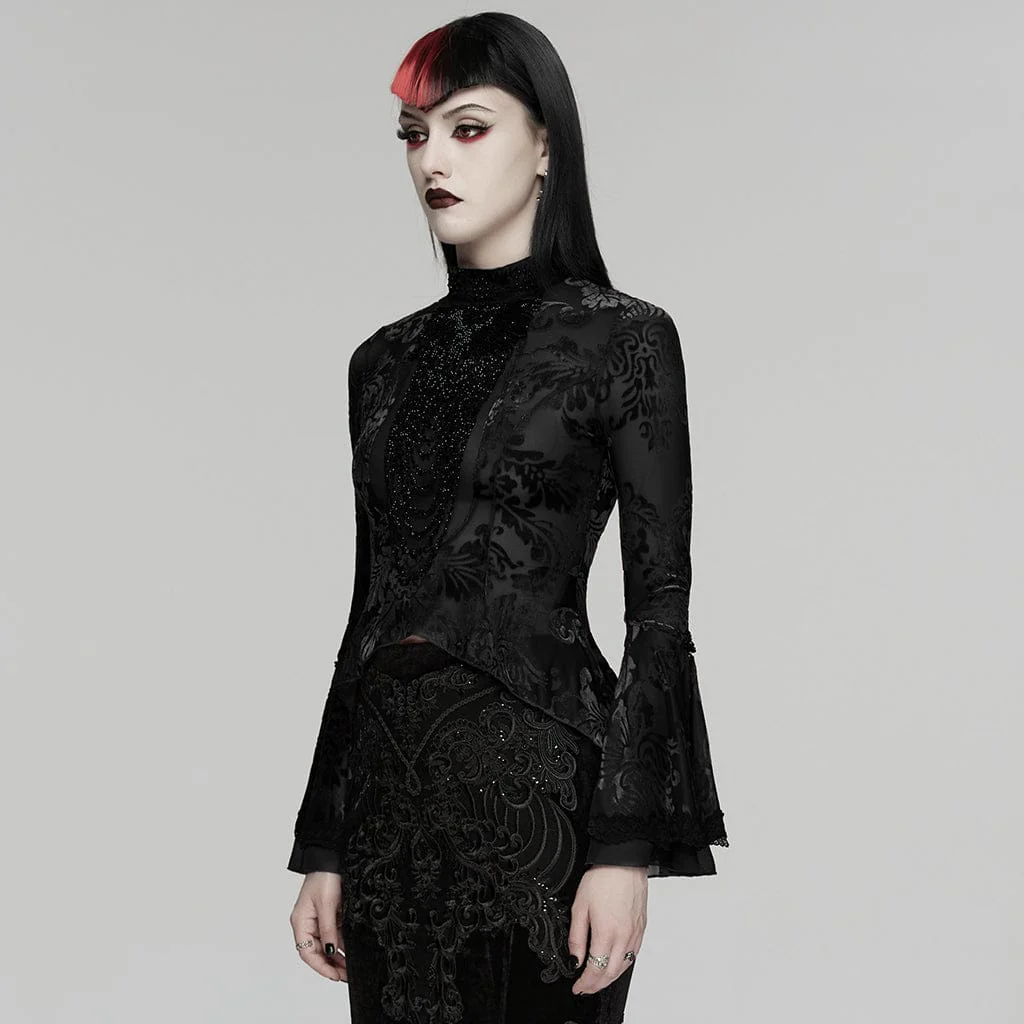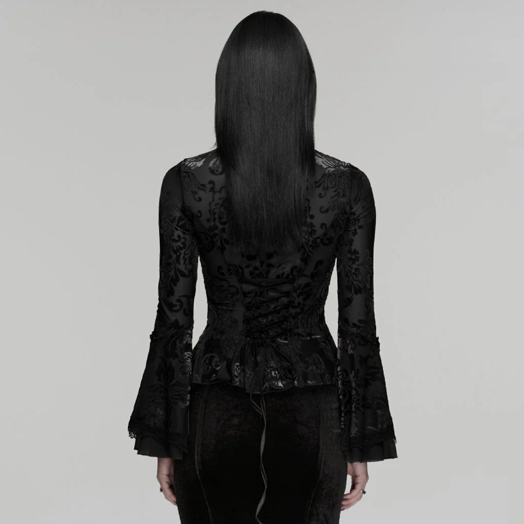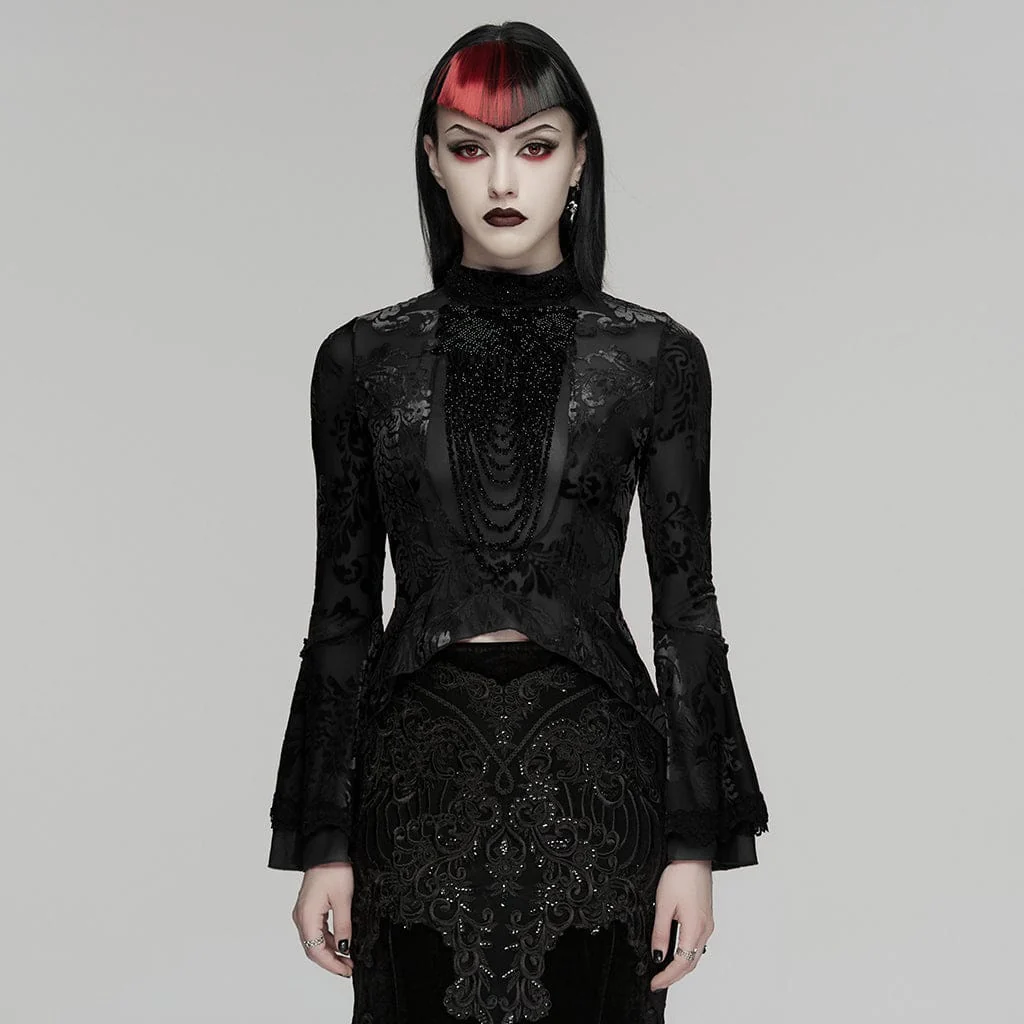 Il top da donna con maniche svasate, perline e motivi floreali gotici è uno straordinario mix di eleganza gotica e fascino vintage: una scelta straordinaria per gli amanti dello stile alternativo e audace. I suoi dettagli intricati lo rendono un capo di spicco in qualsiasi guardaroba alternativo.