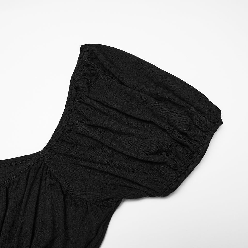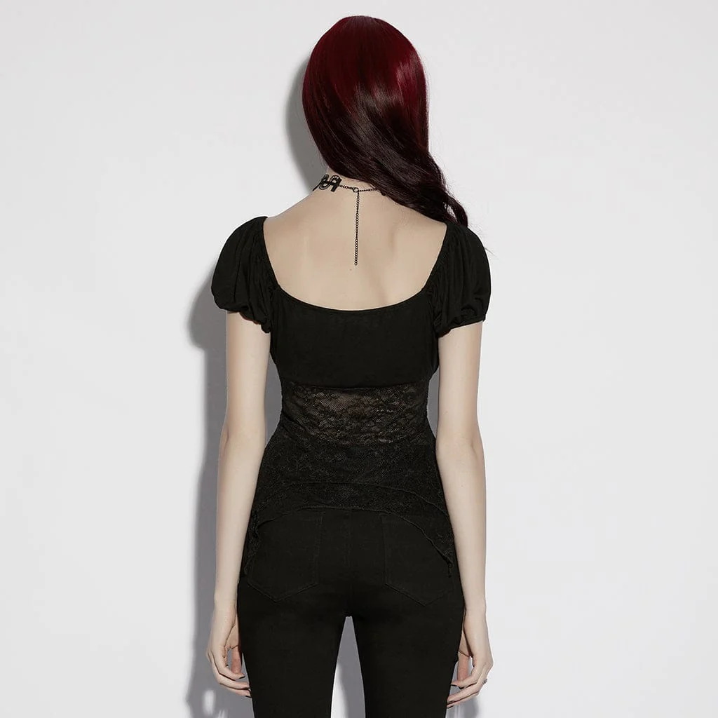 Il top da donna con balze in pizzo floreale irregolare gotico è un affascinante capo essenziale che fonde il romanticismo gotico vittoriano con un tocco grunge gotico. Questa silhouette aderente presenta un colletto squadrato e maniche a sbuffo, con un pannello arricciato sul busto che sfuma in pizzo floreale trasparente per una consistenza inquietantemente morbida.